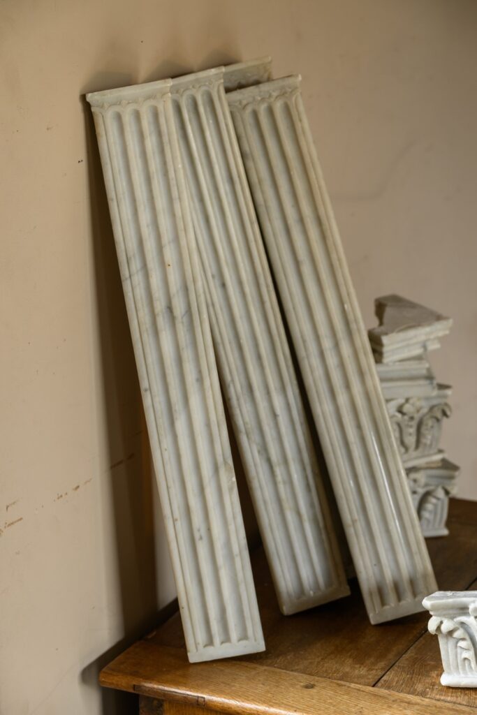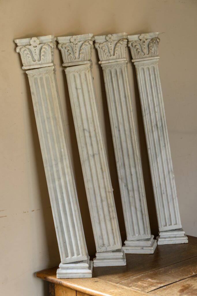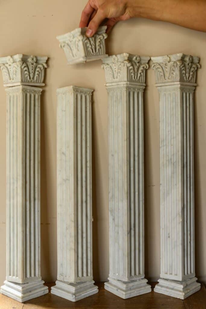 Fine set of small four carrara pilasters, complete with four bases and corinthian capitals.