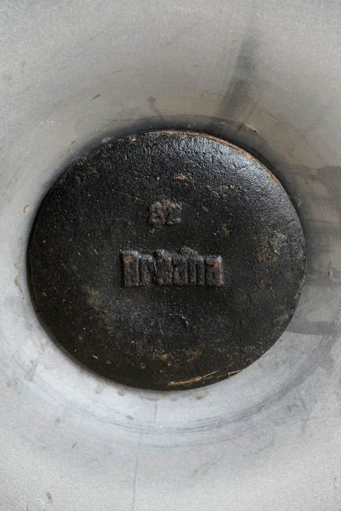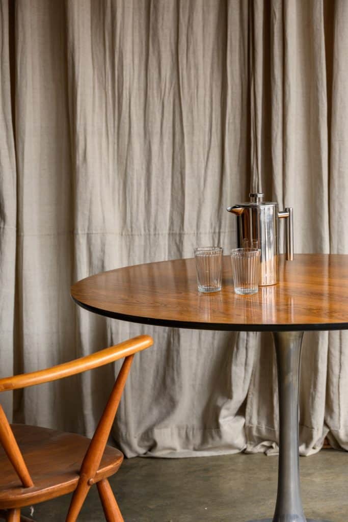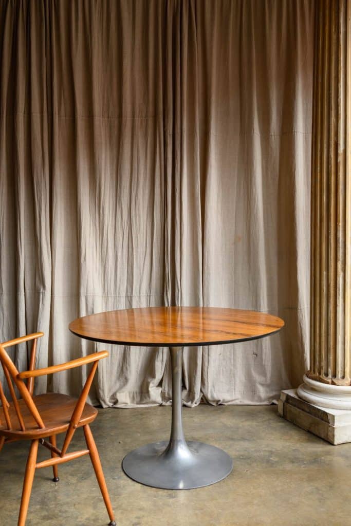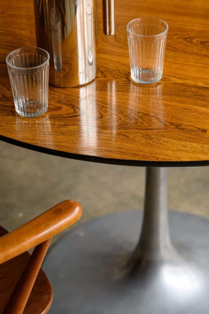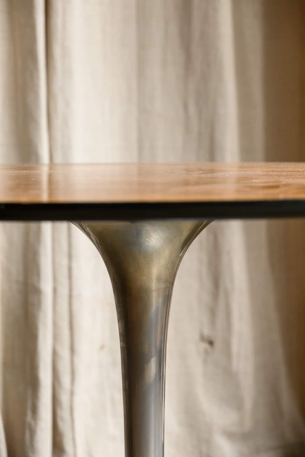 Particularly lovely Arkana table, c.1960s. Spun aluminium base with cast iron stamped weight at the bottom.