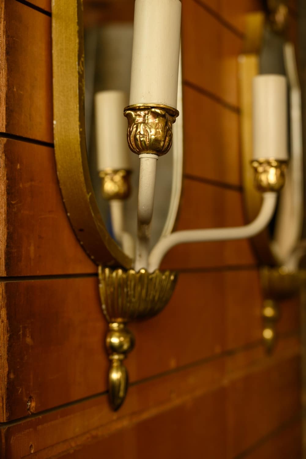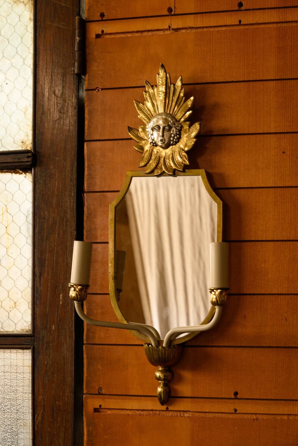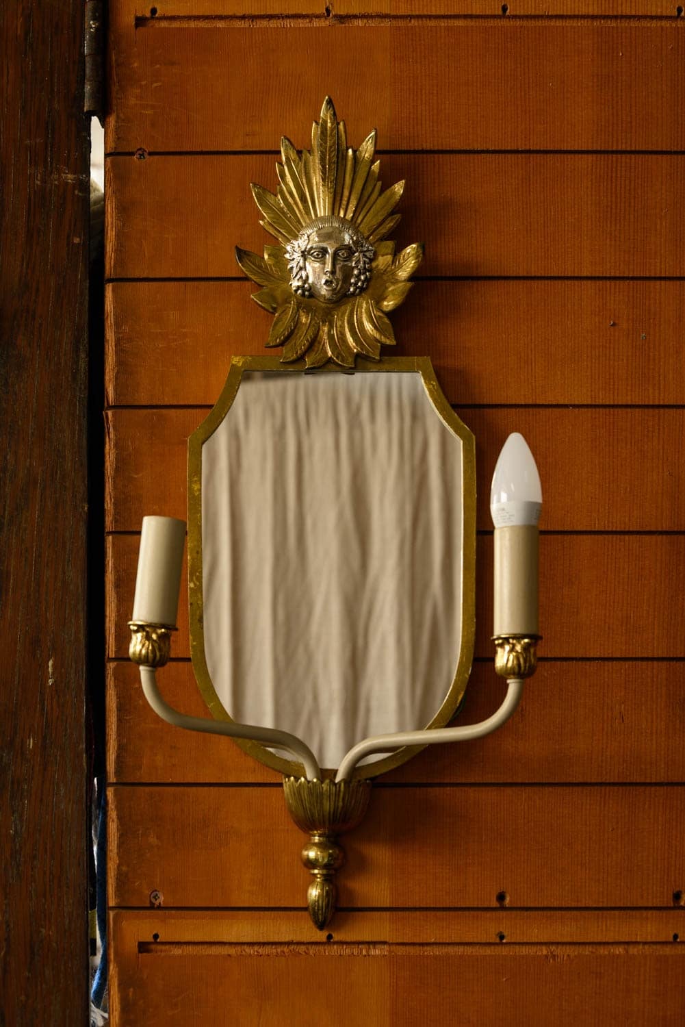 1960s mirrored wall sconces with two electrified candle holders and gilt brass decoration above.
