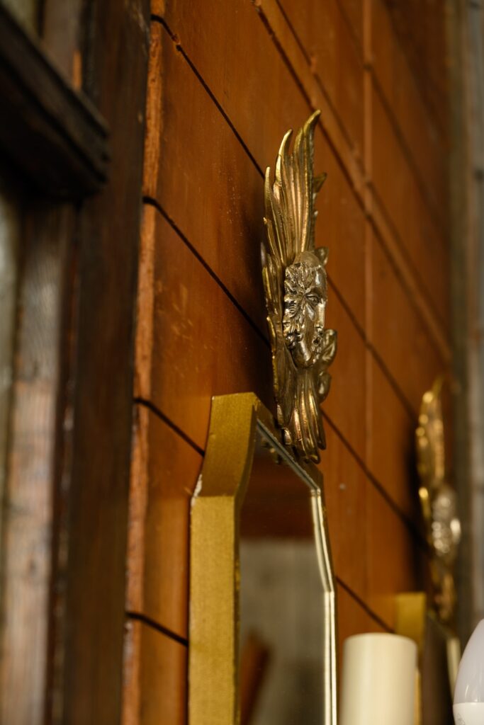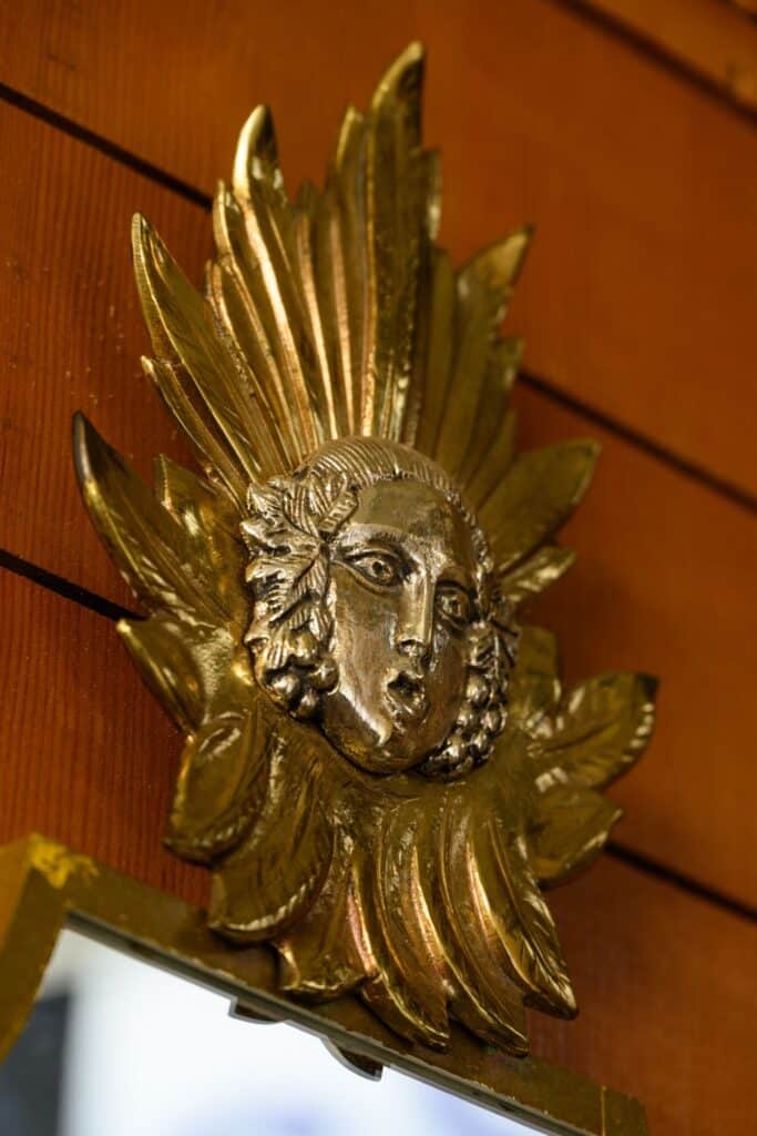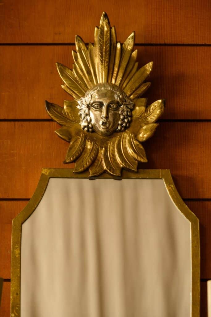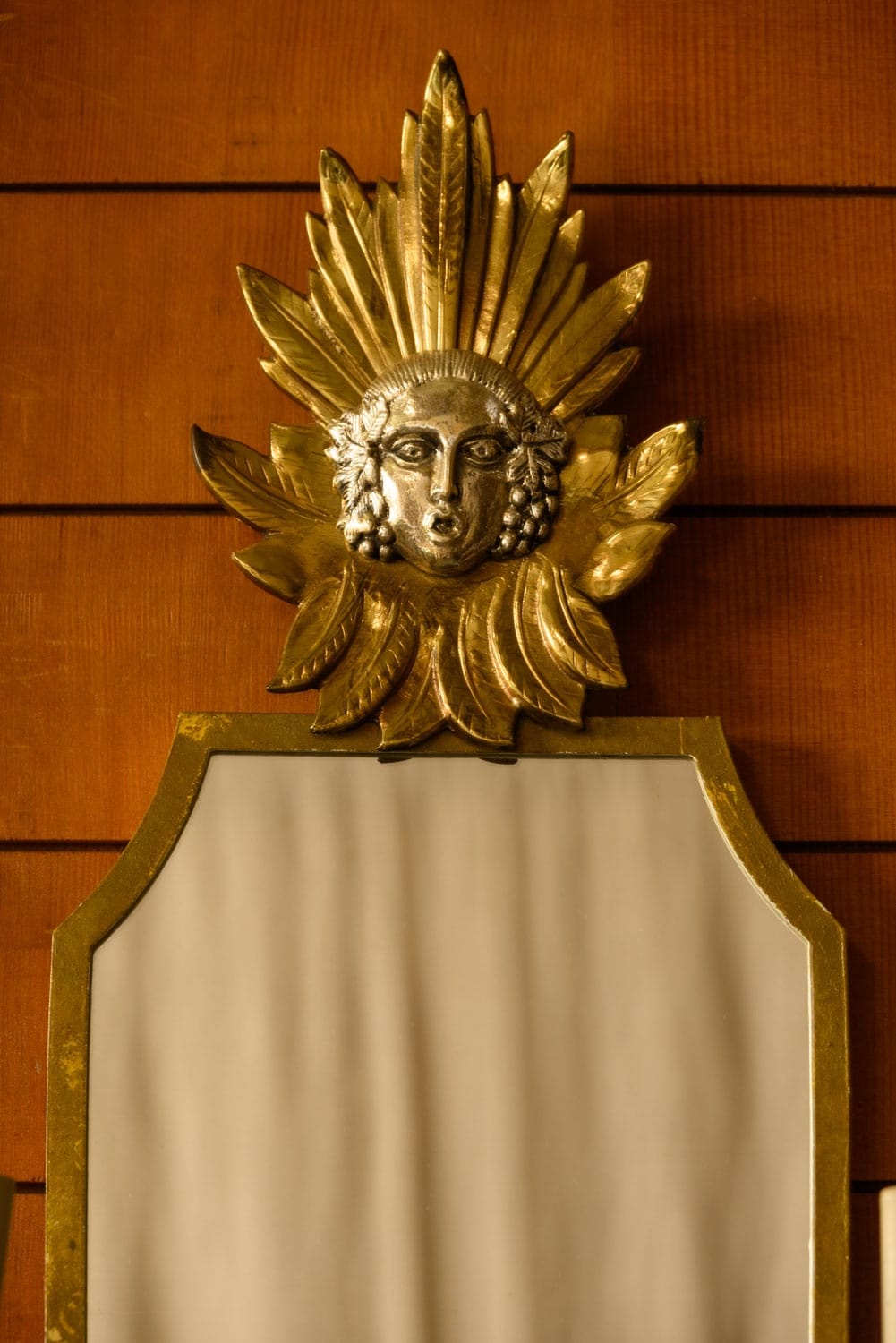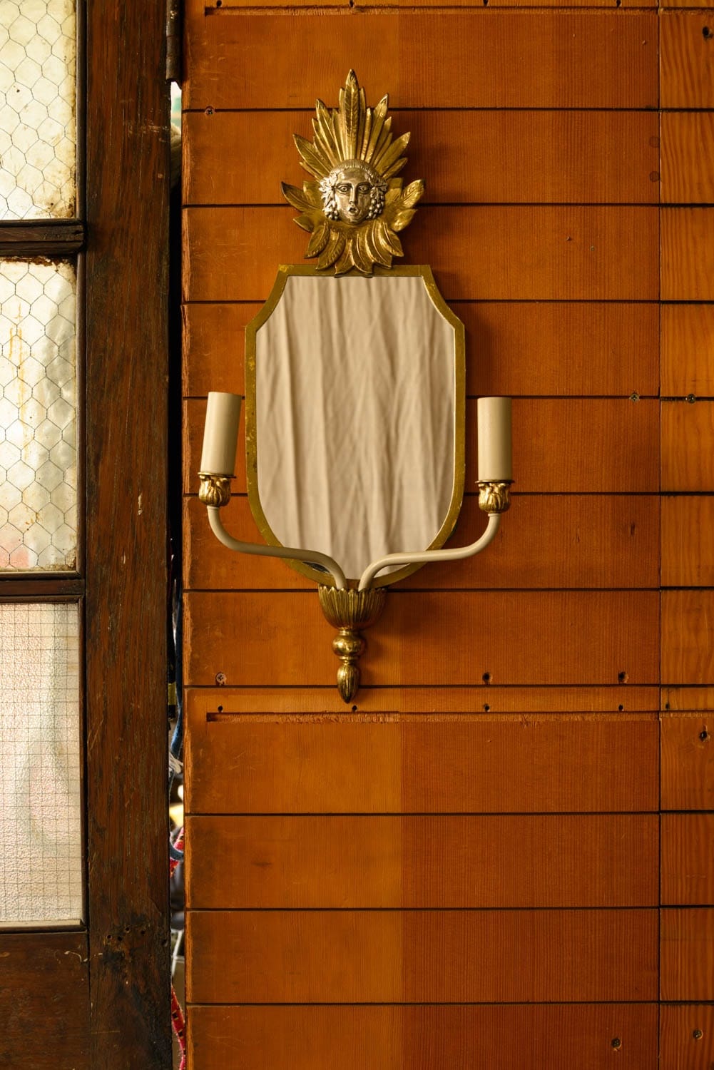 1960s mirrored wall sconces with two electrified candle holders and gilt brass decoration above.