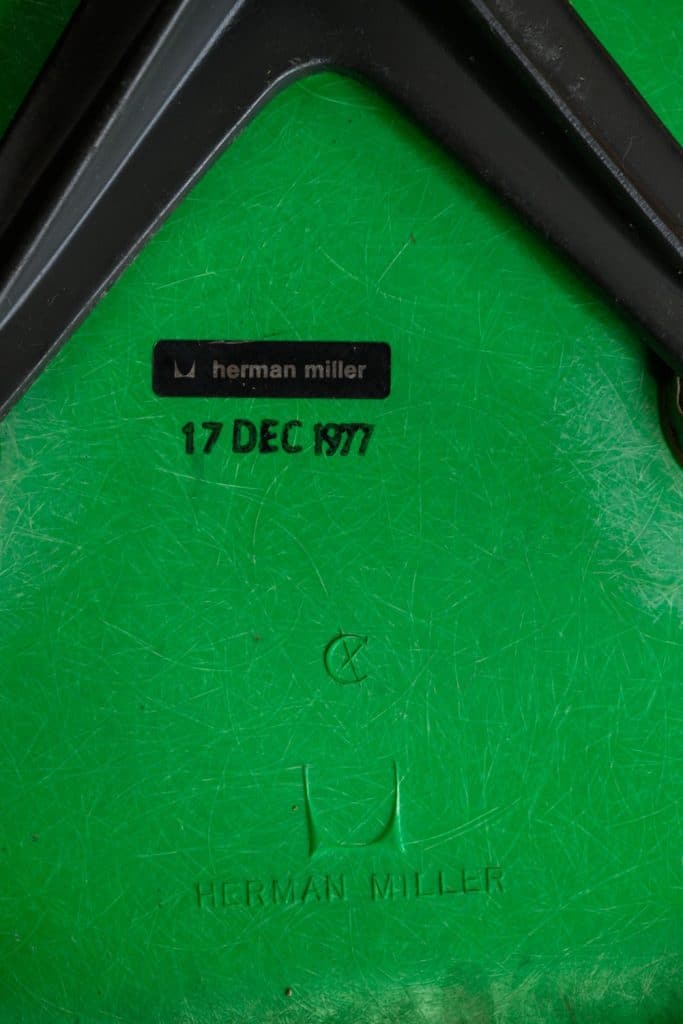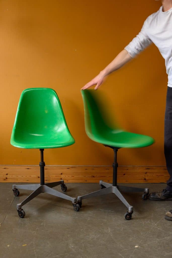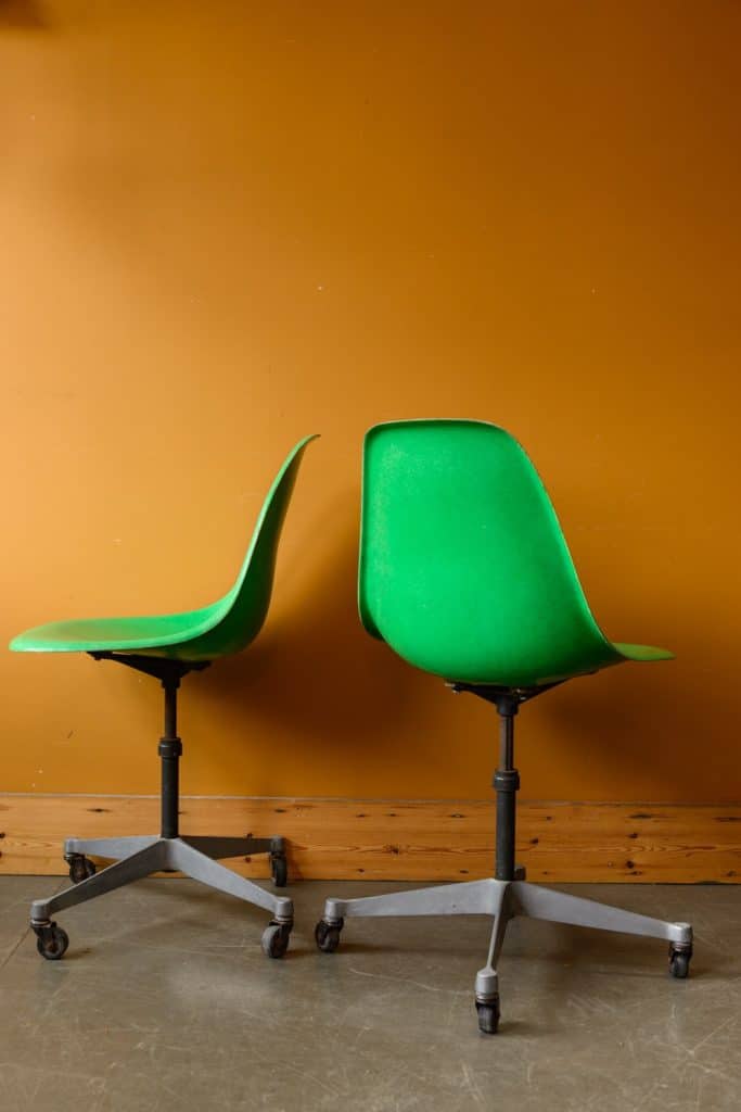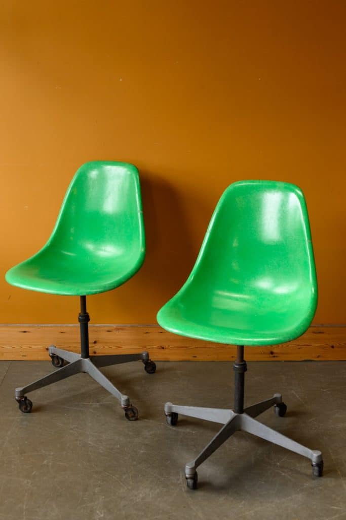 Green fibreglass wheeled office chairs, by Herman Miller.