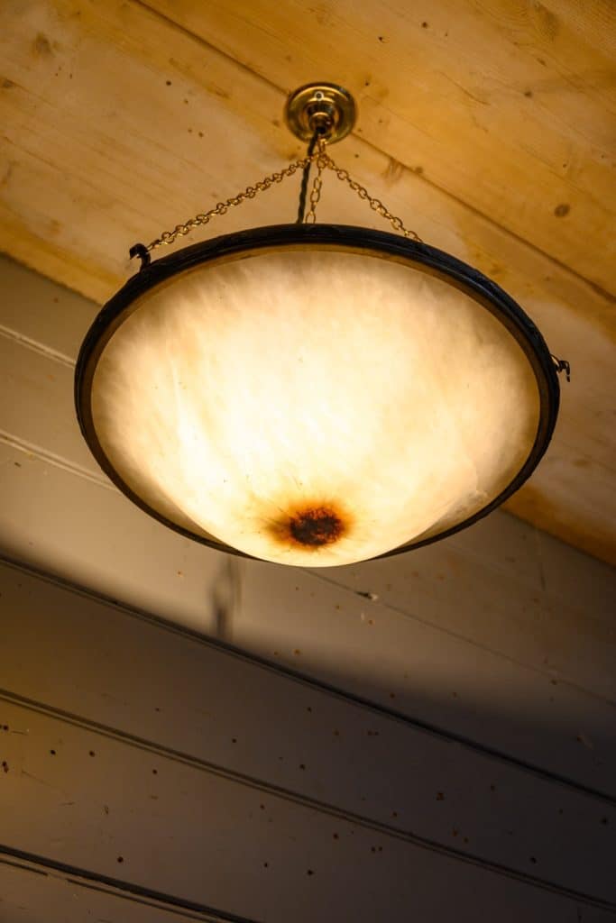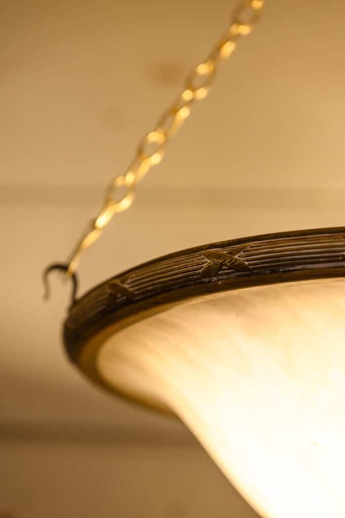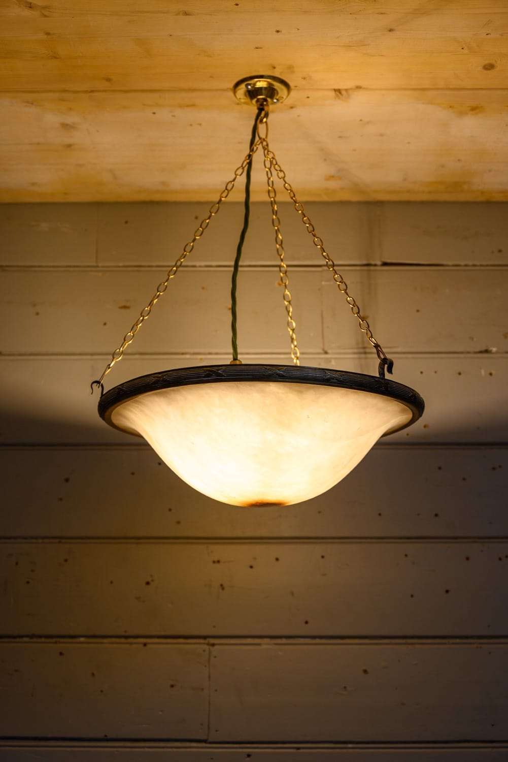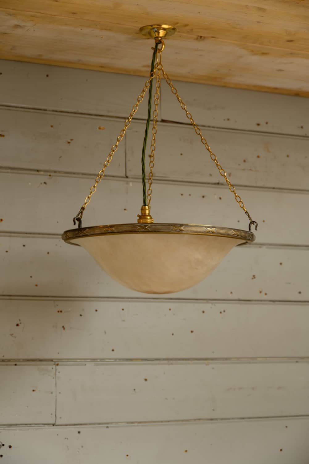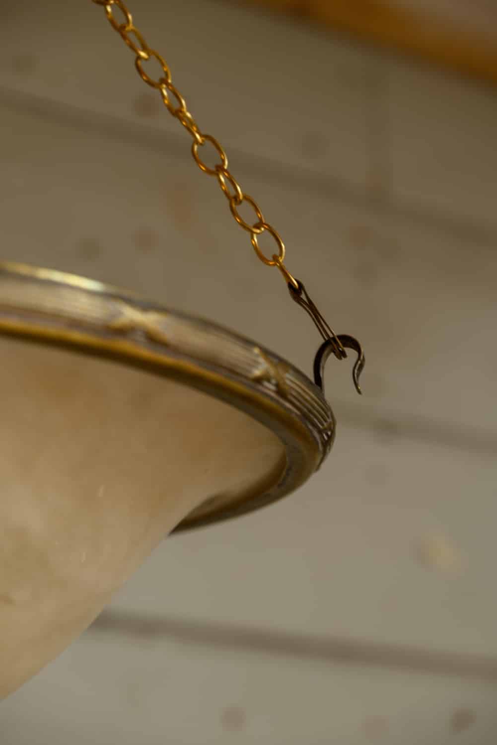Antique alabaster bowl light with a period ring fitting, on three chains.