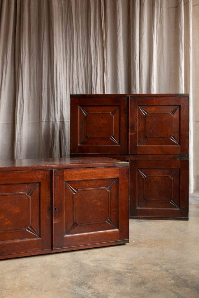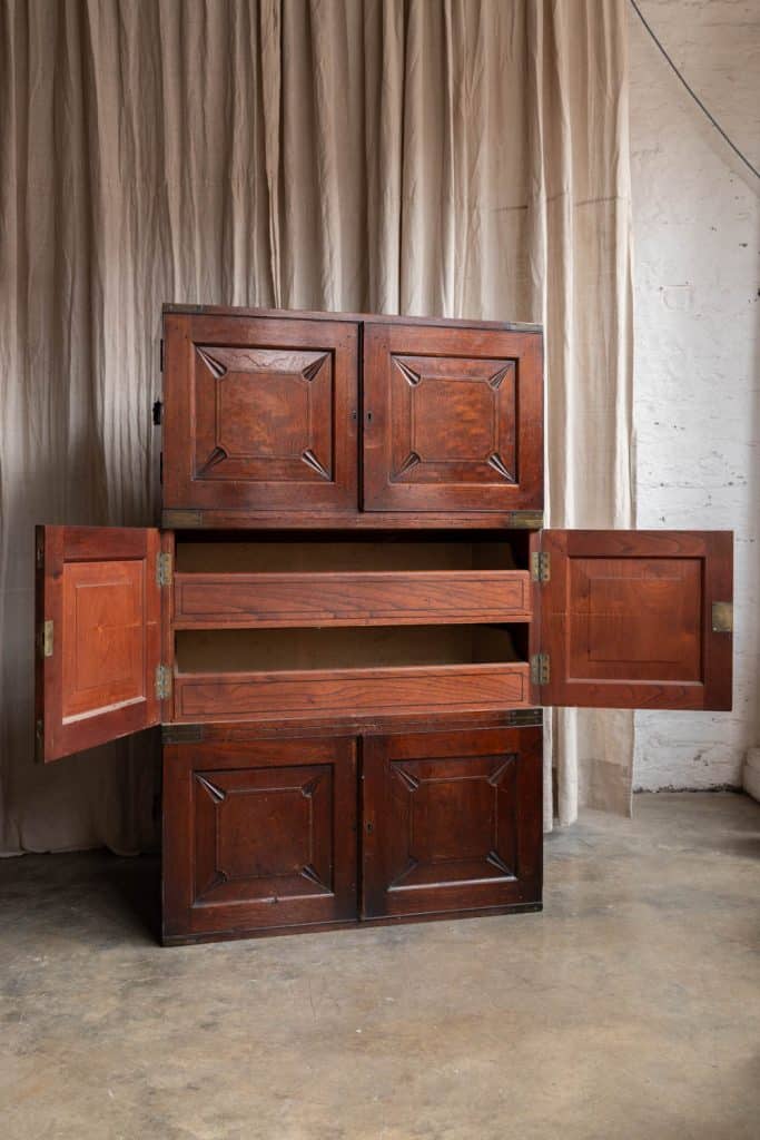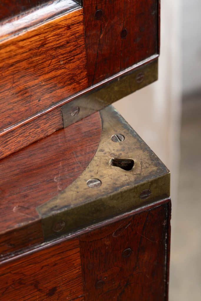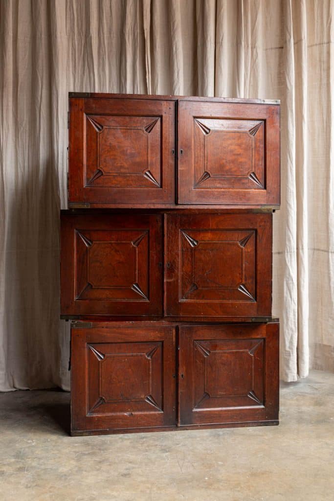A very fine Anglo-indian three-tiered campaign chest with two linen press drawers in each section.