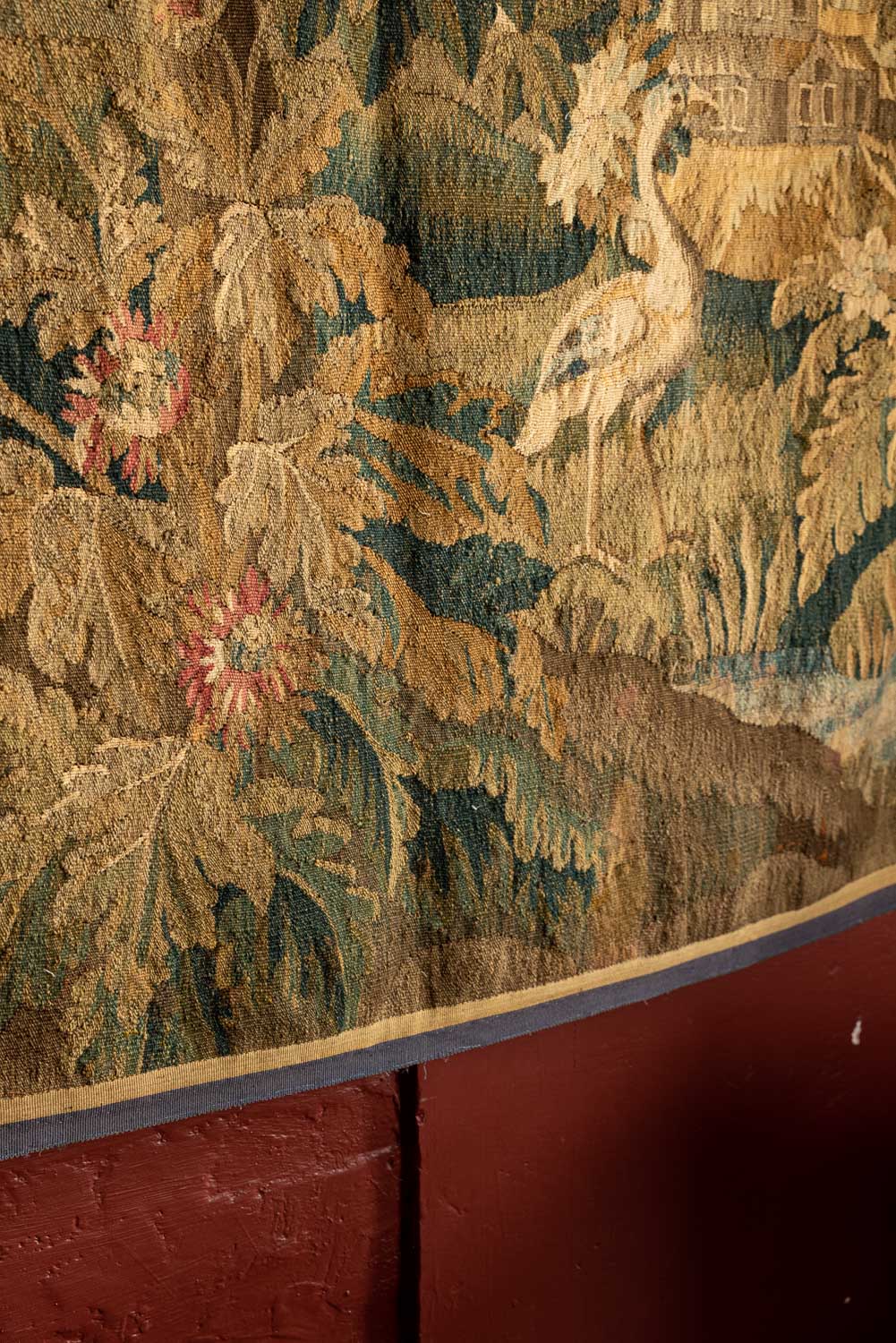 A c18th century verdure tapestry depicting a wooded landscape with prolific foliage in tones of green and gold.