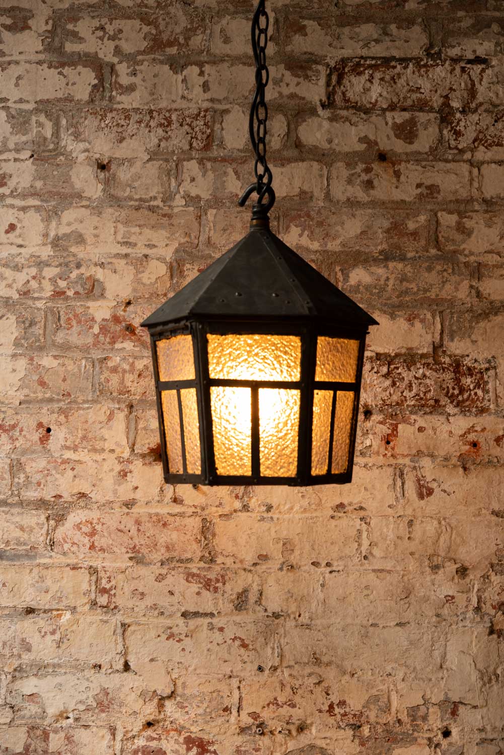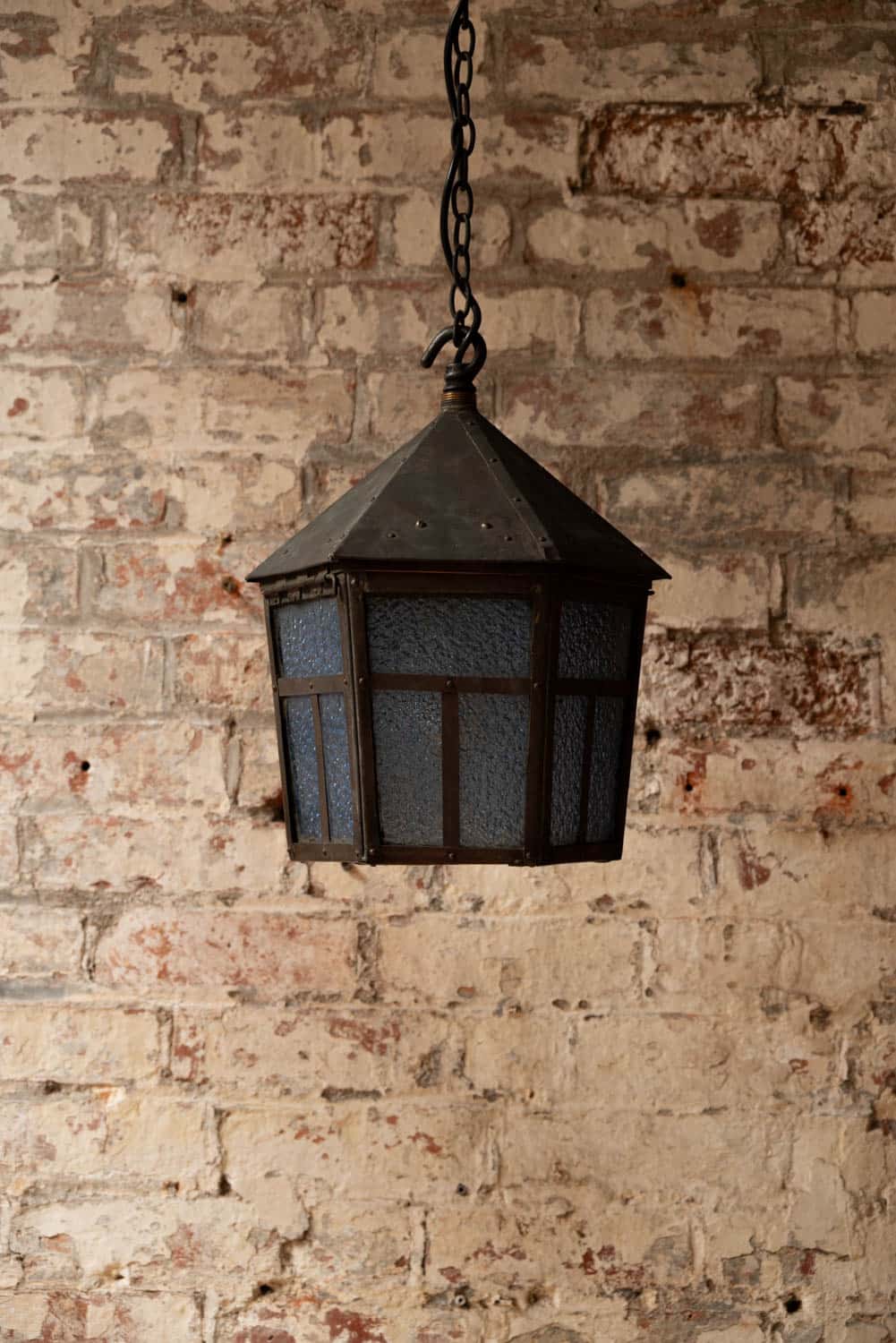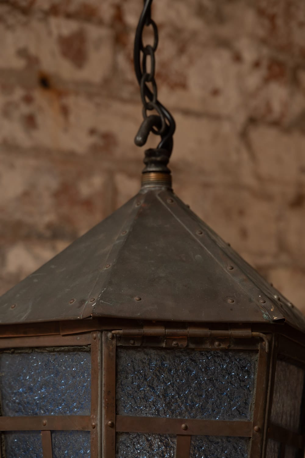 Arts and Craft's brass lantern with dimpled stained glass. Suitable for both indoor and outdoor use.