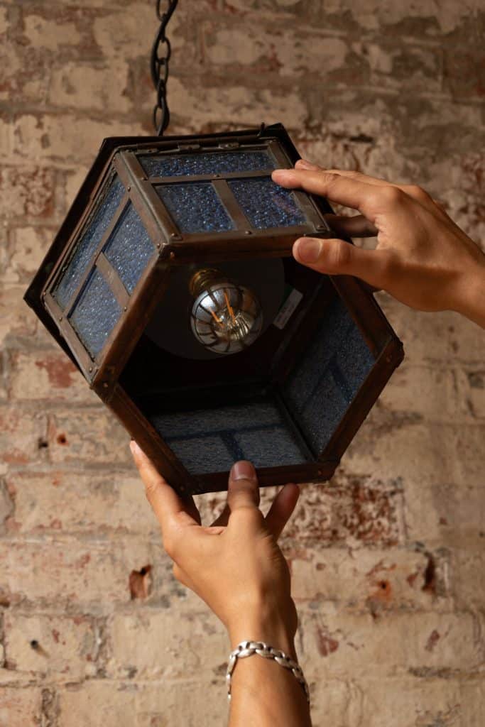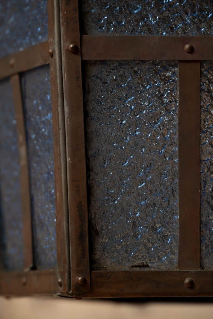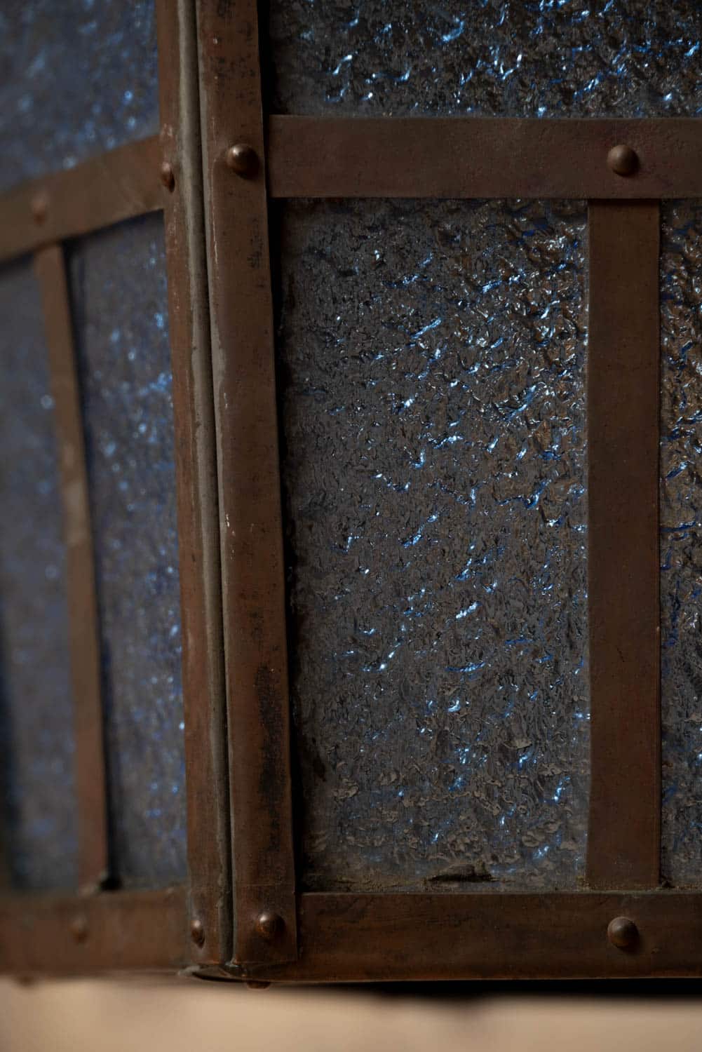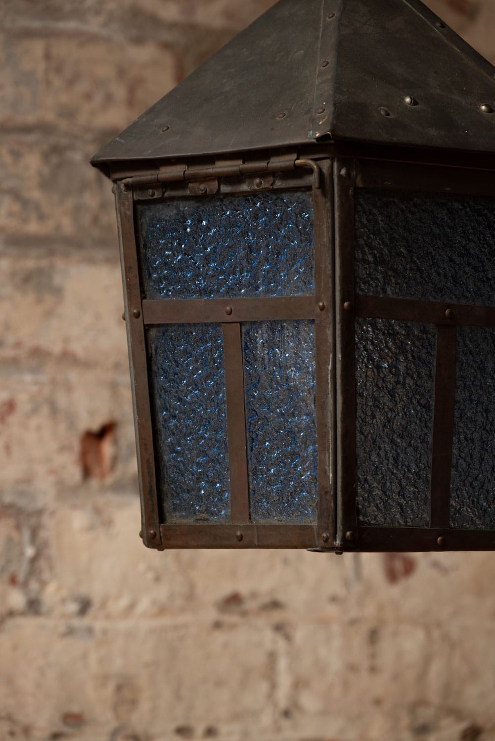Arts and Craft's brass lantern with dimpled stained glass. Suitable for both indoor and outdoor use.