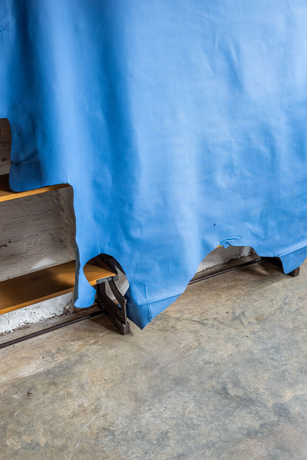 Salvaged leather hides sourced from a high-end London upholsterer.