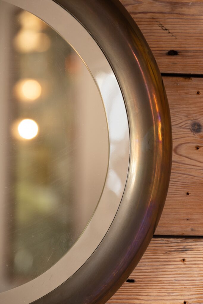 Round brass Albany mirror with bevelled glass and pressed metal backing.