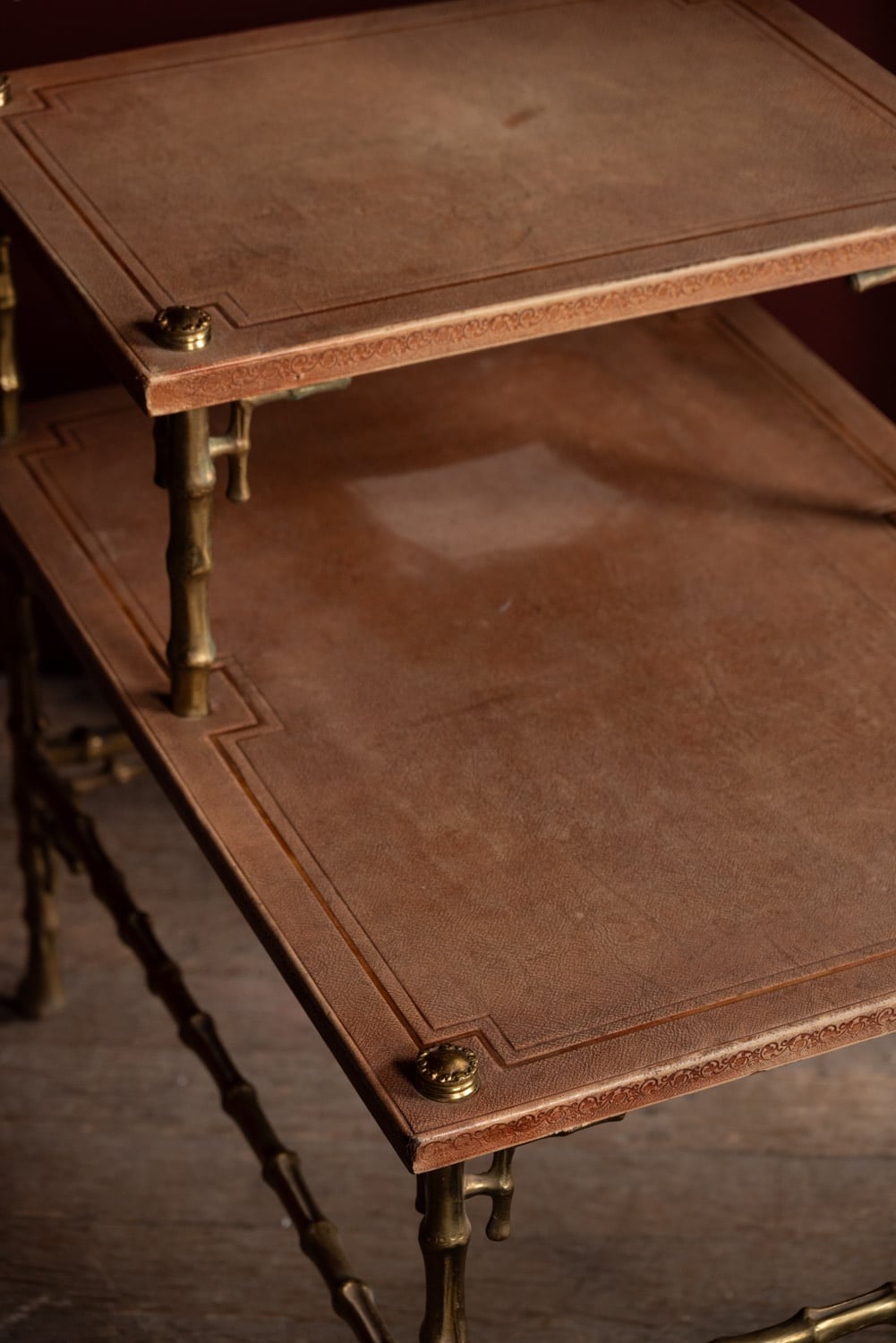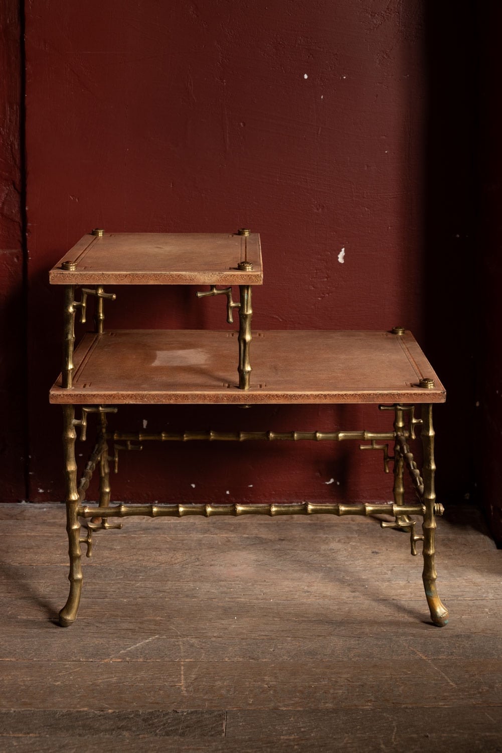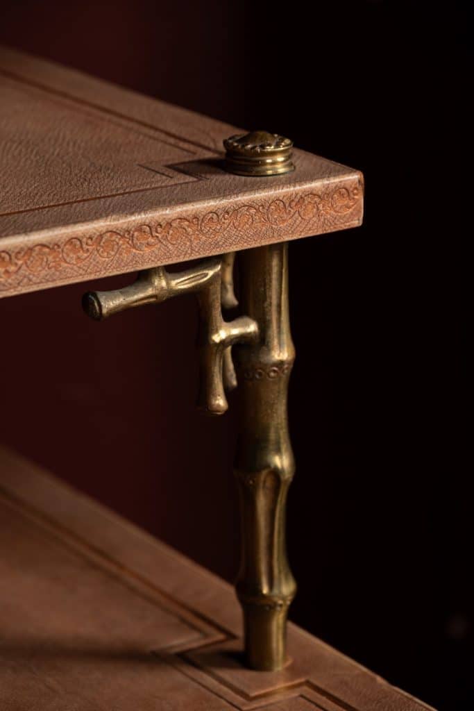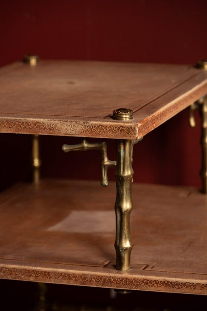 An unusual tiered brass bamboo coffee table with stamped leather tops.