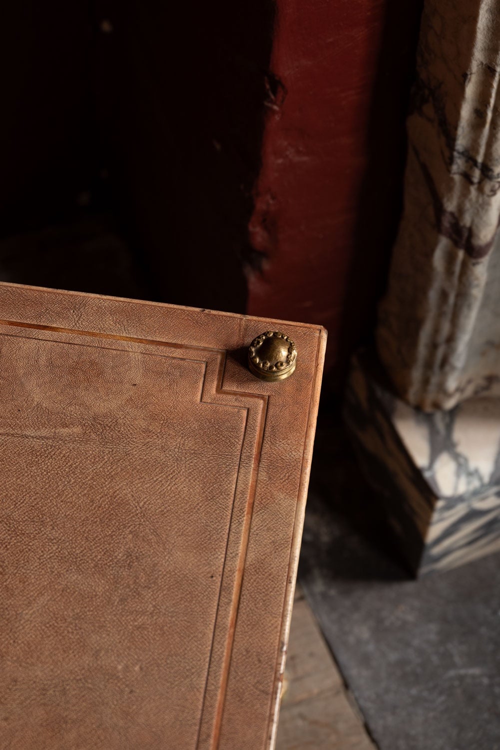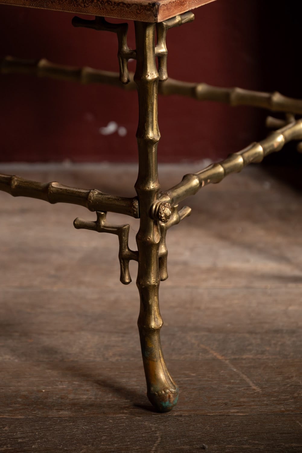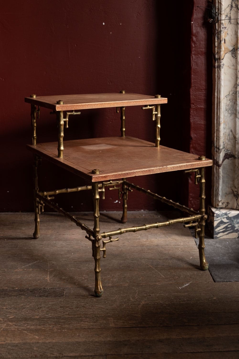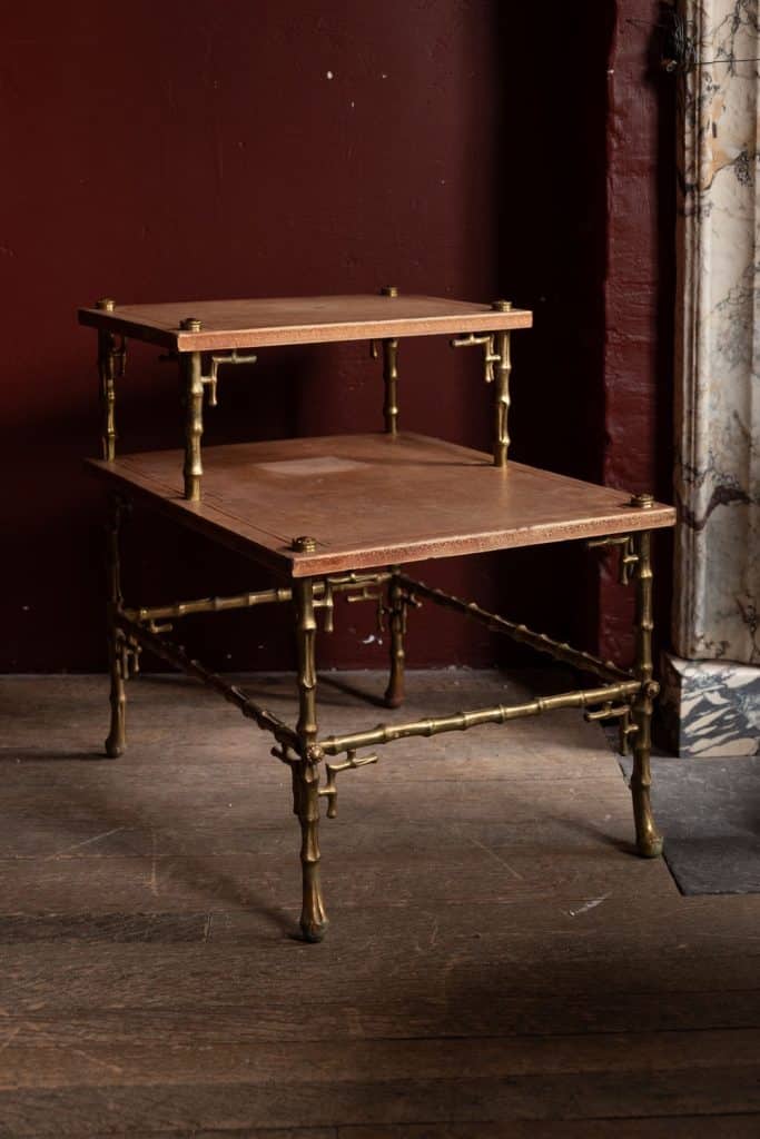 An unusual tiered brass bamboo coffee table with stamped leather tops.