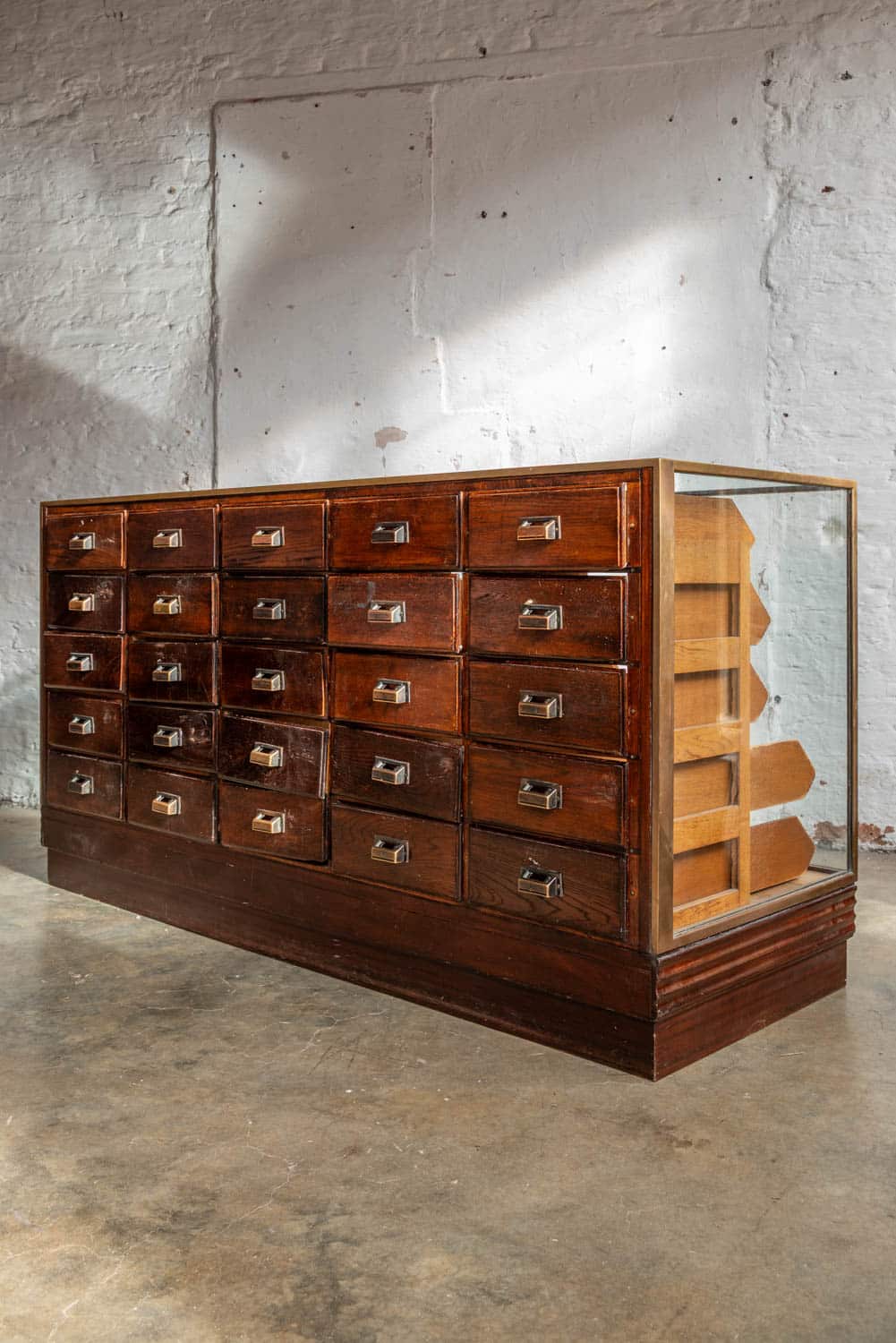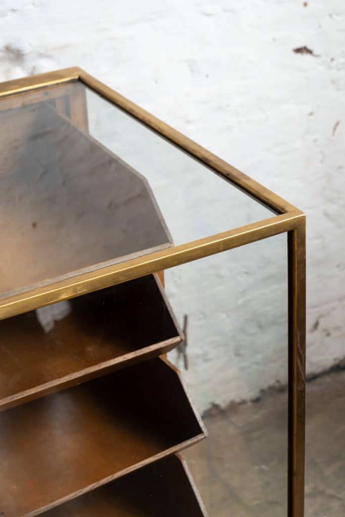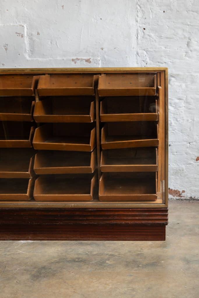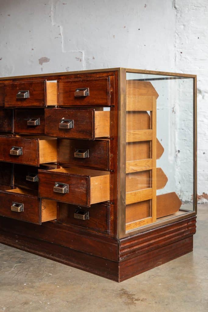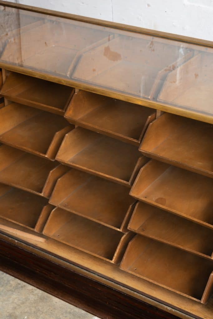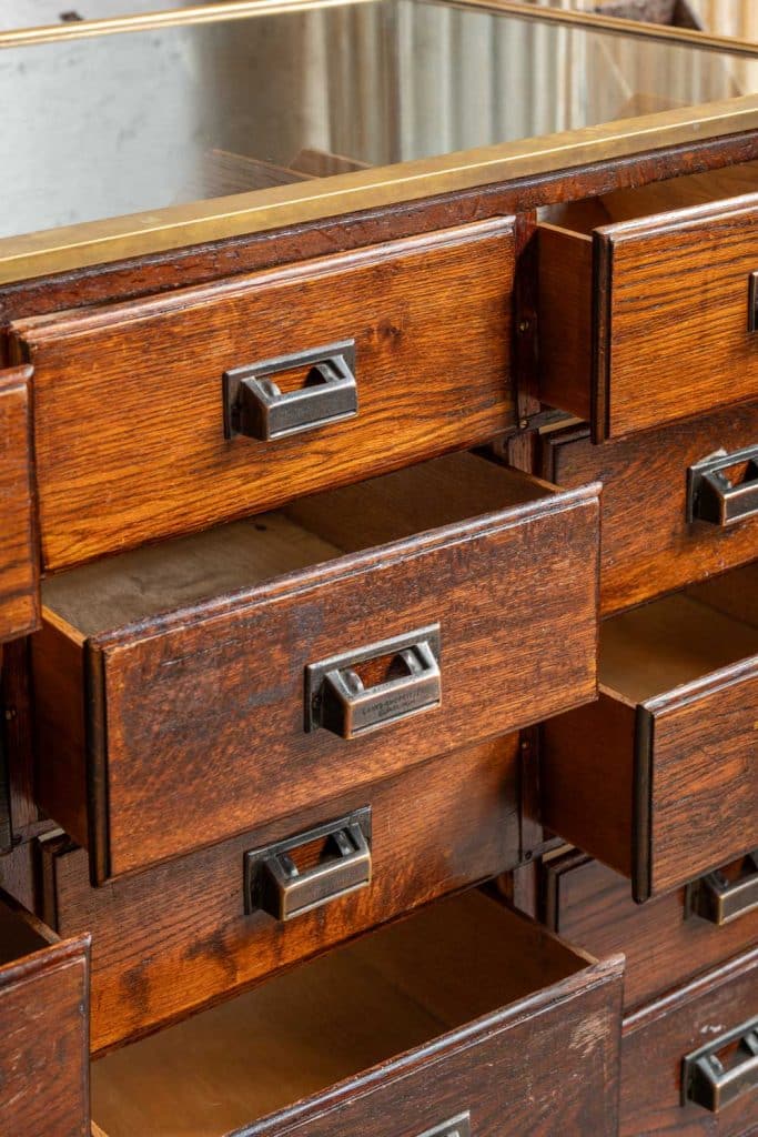 A bank of drapers drawers, with brass detailed framing and glass countertop.