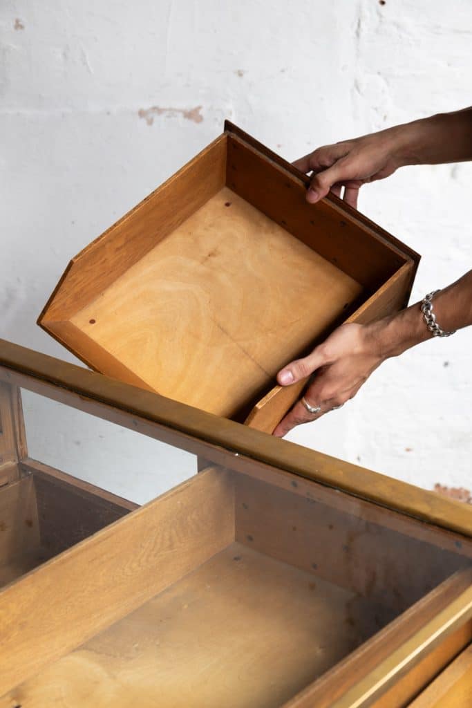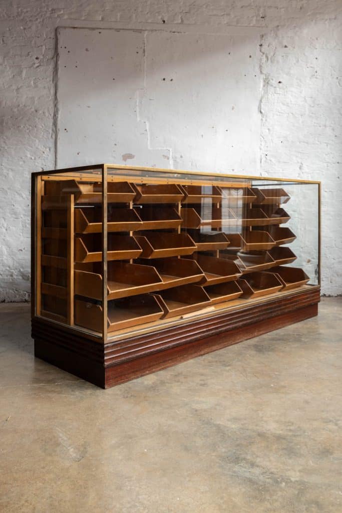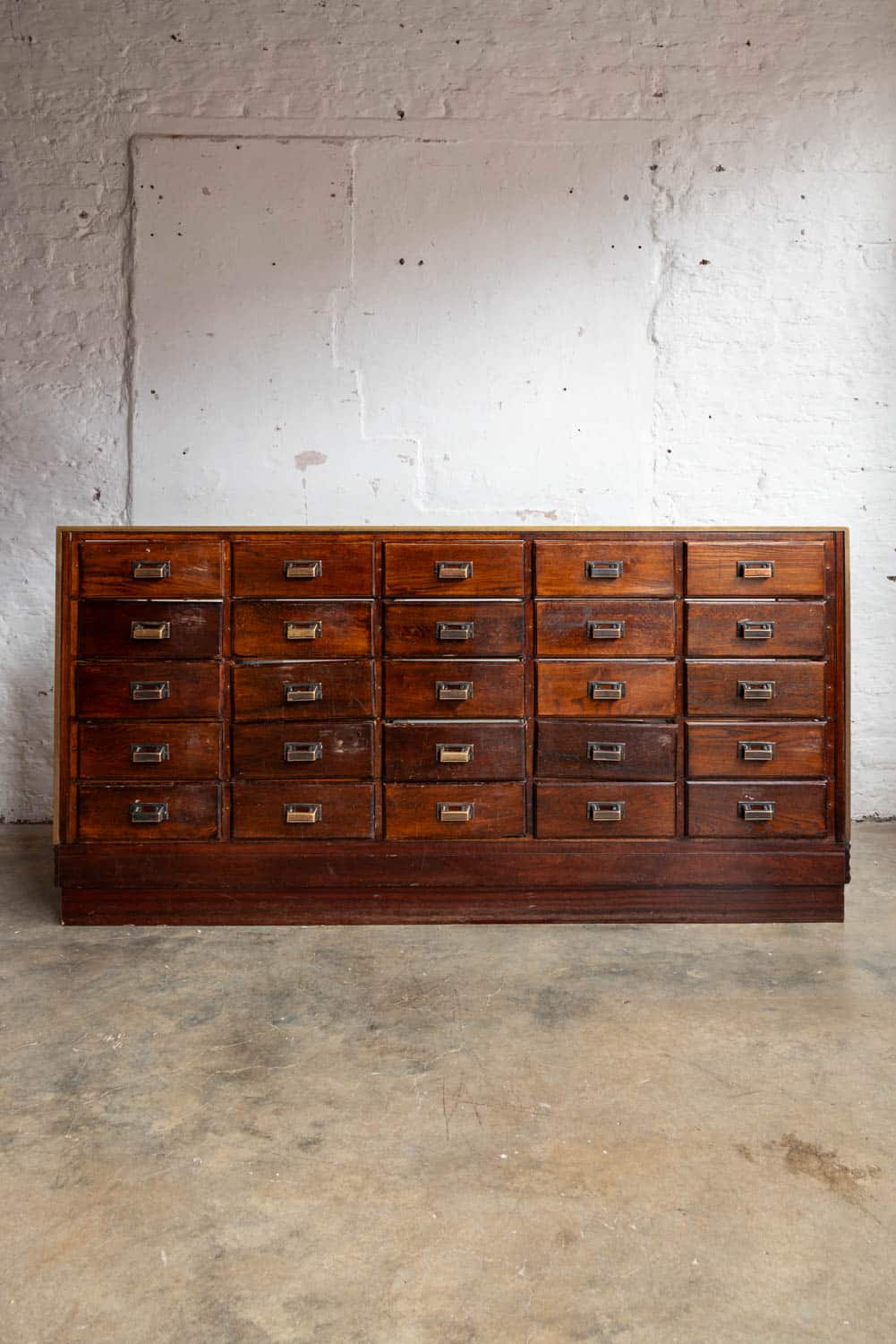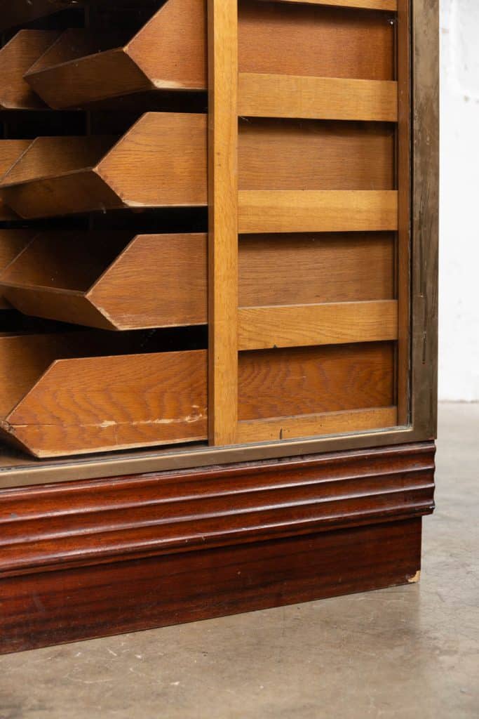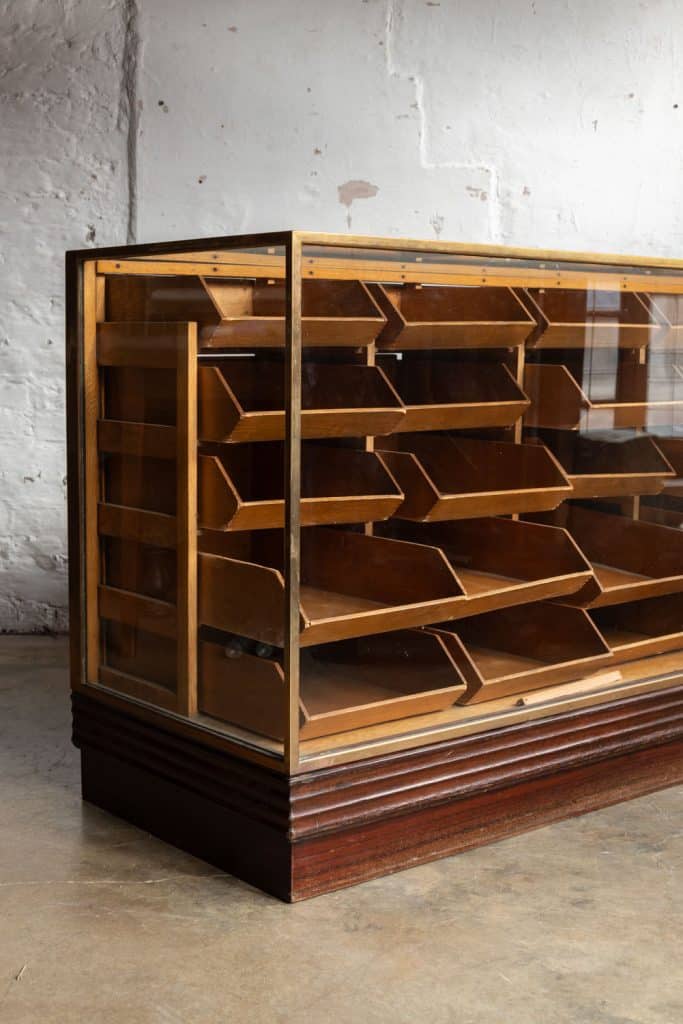 A bank of drapers drawers, with brass detailed framing and glass countertop.