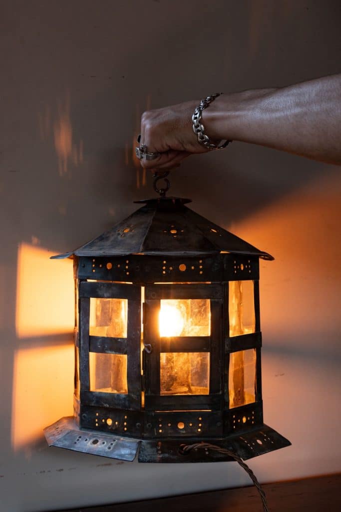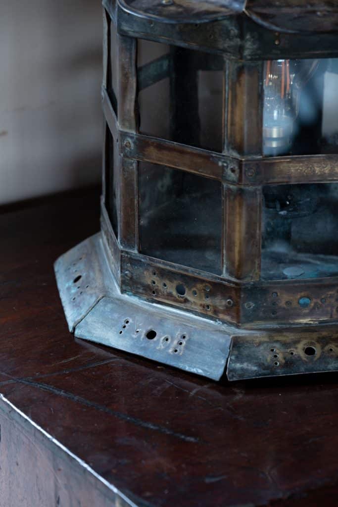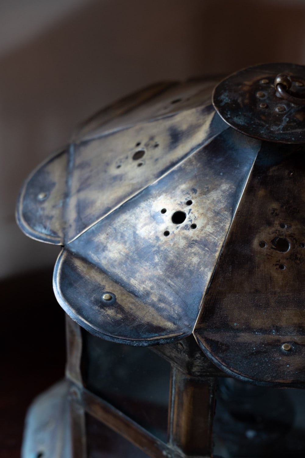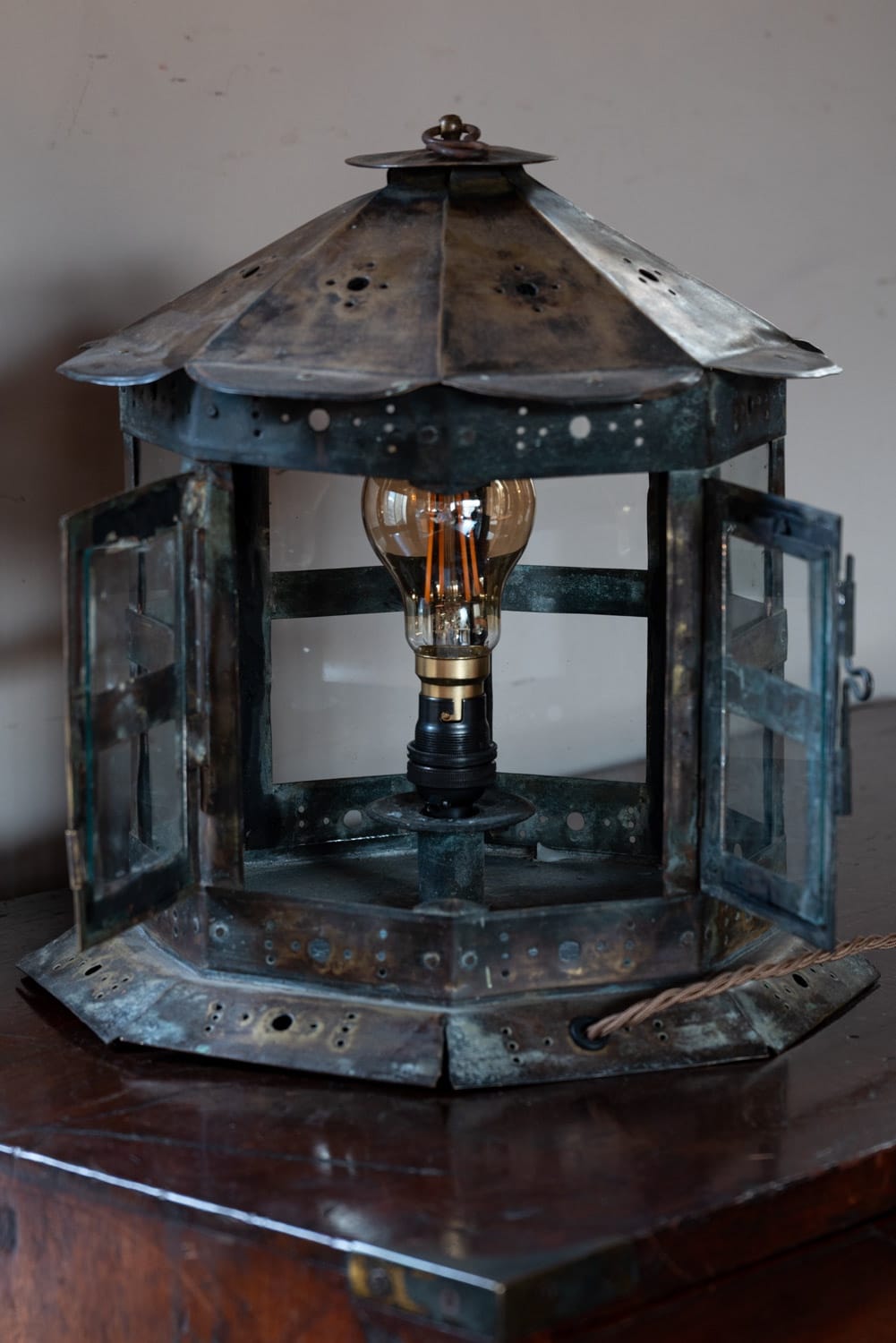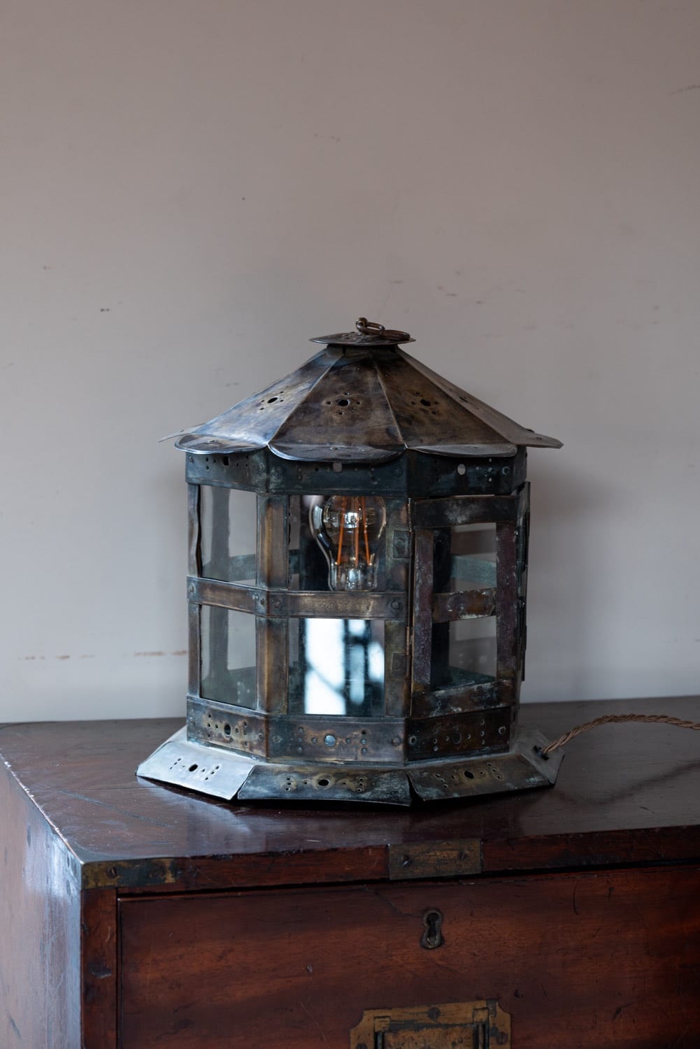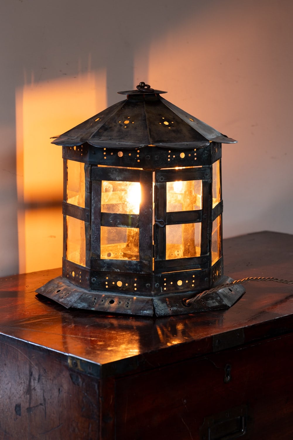 Brass and glass table lantern, with perforated decorations.