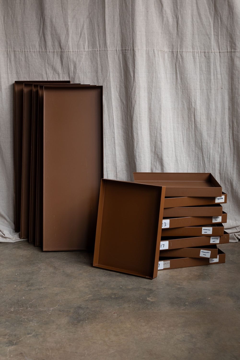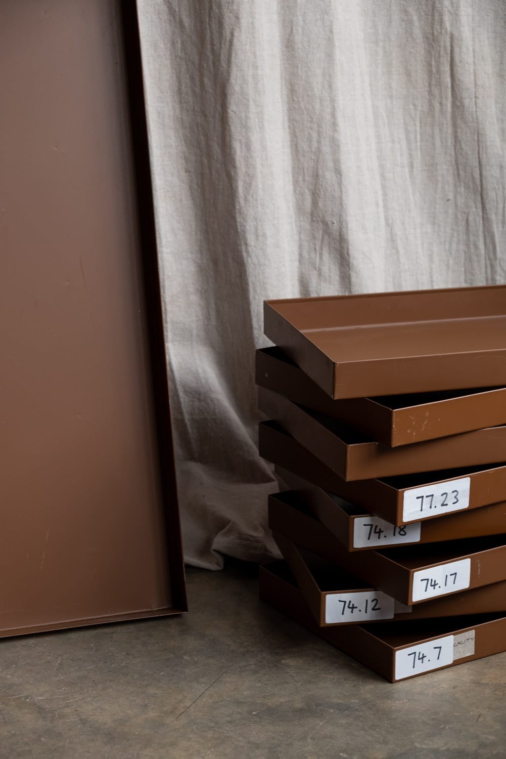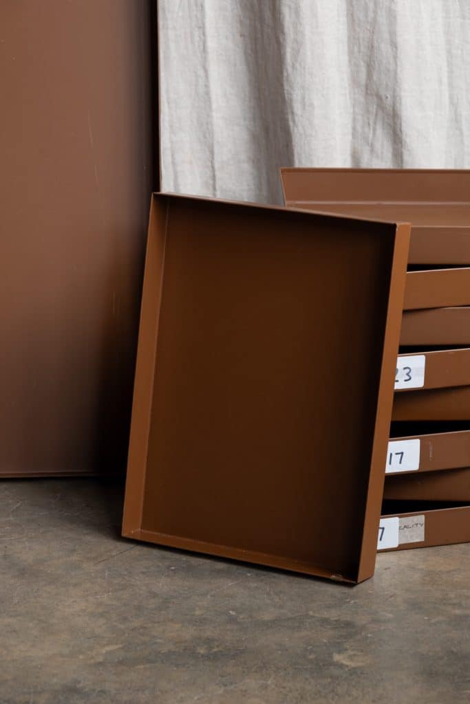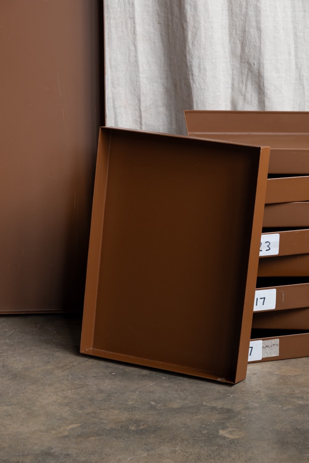 Brown metal specimen trays, from a prominent London archive store.
