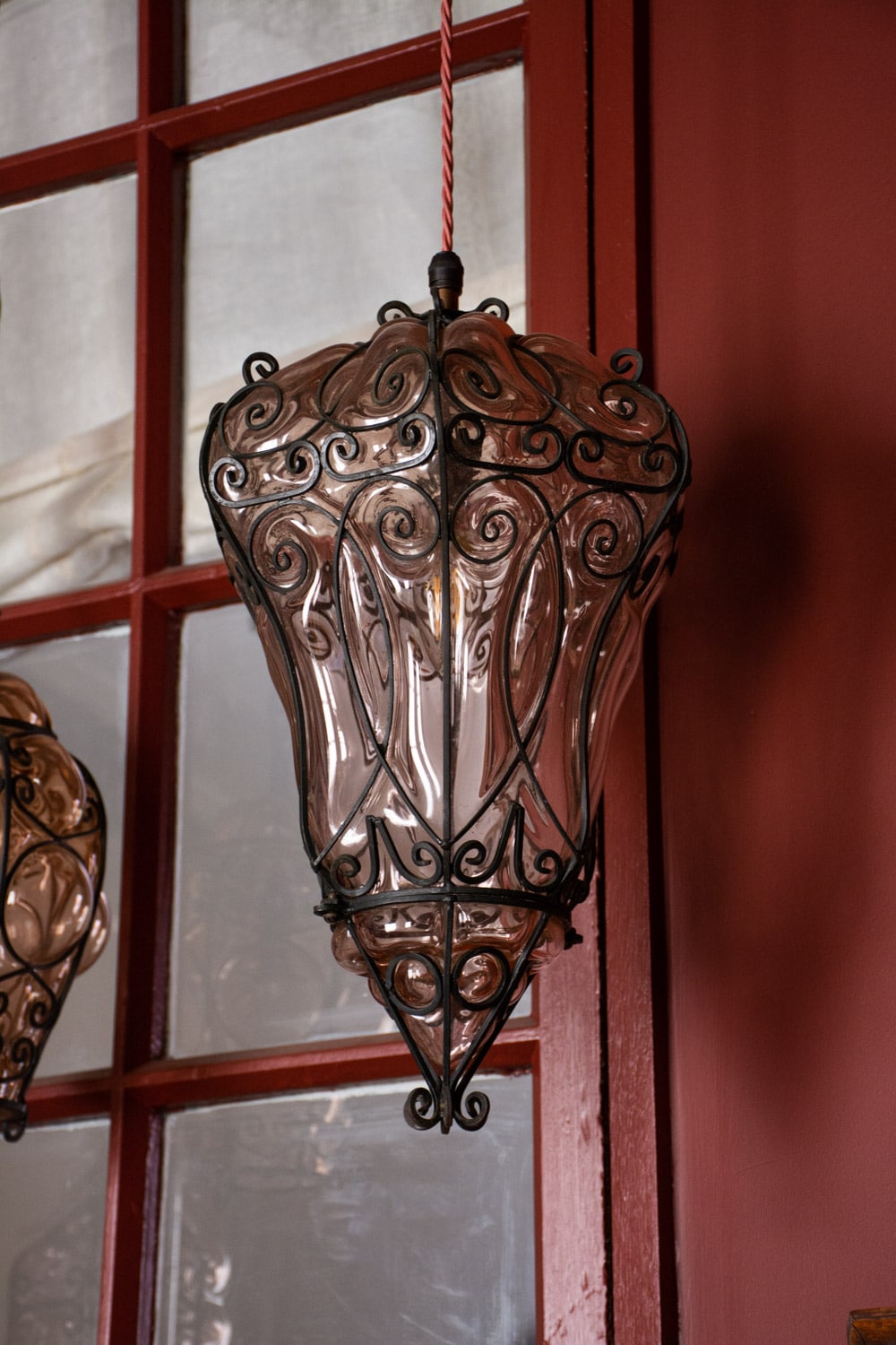 An ornate lantern with blown glass in wire frame. Rewired and ready to hang.