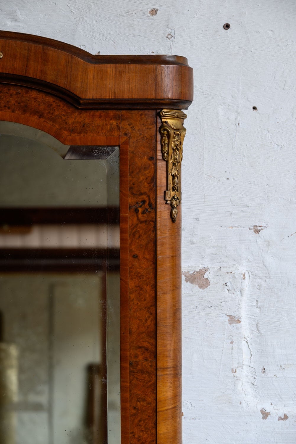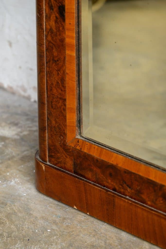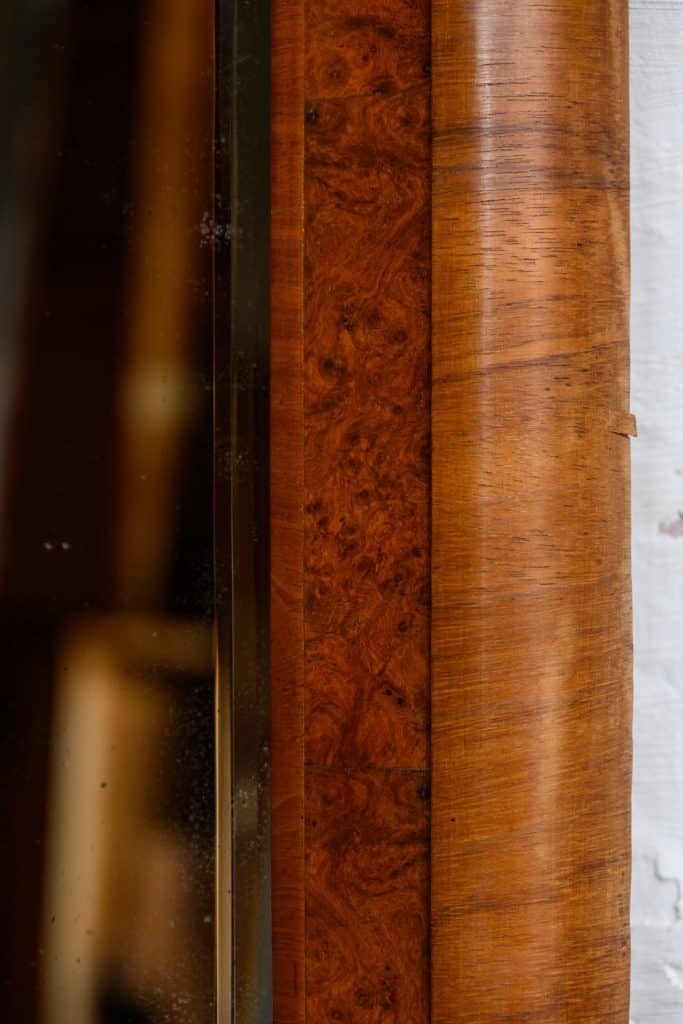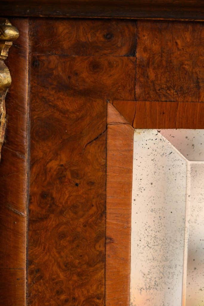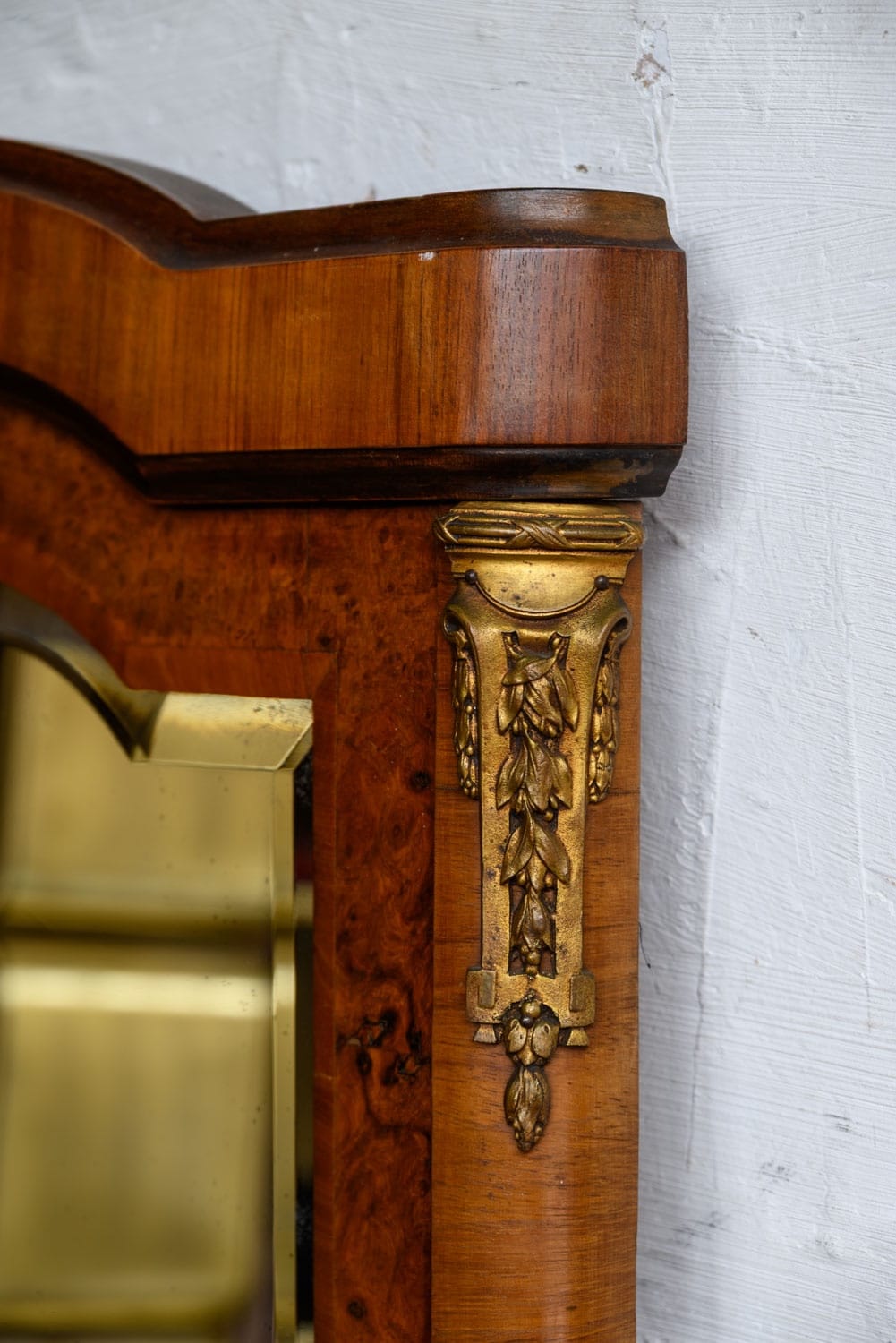 Burrwood veneer mirror with brass mounts, in the French style.