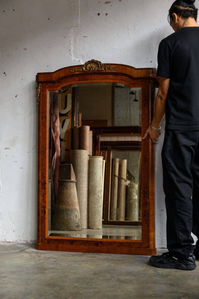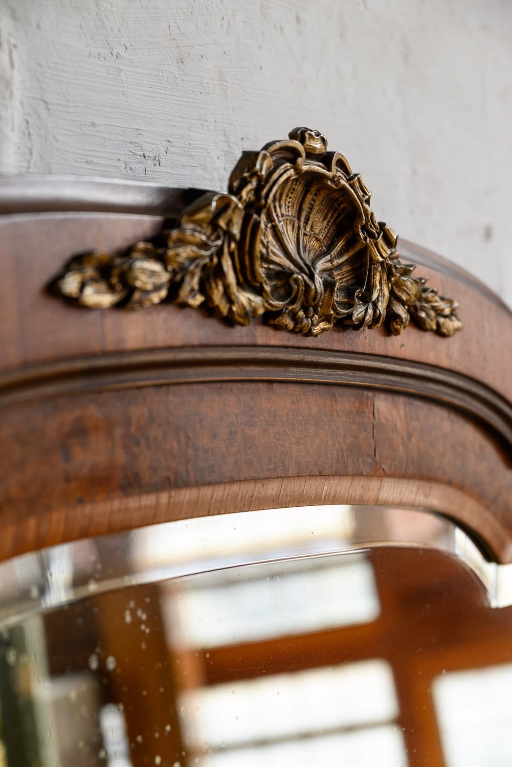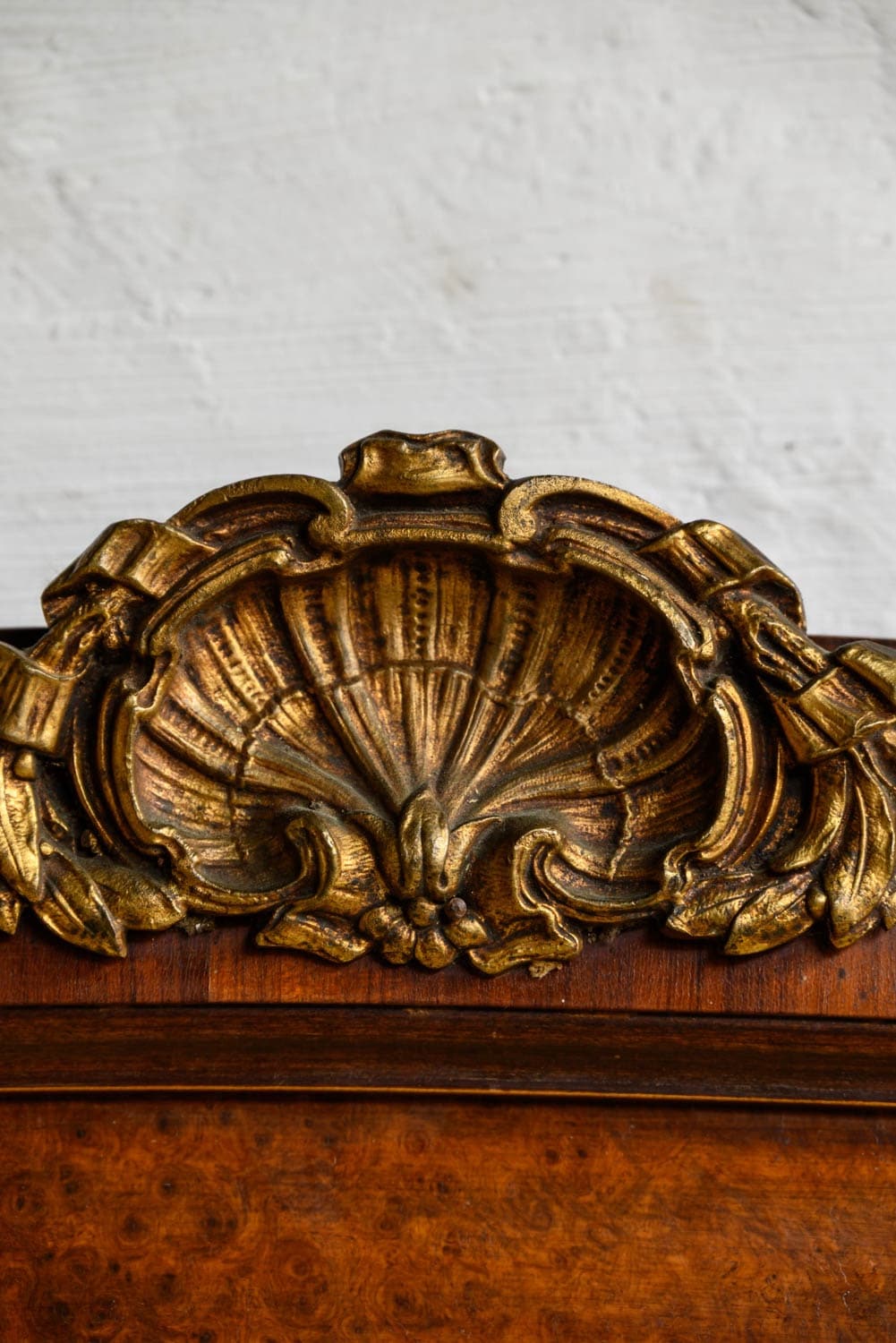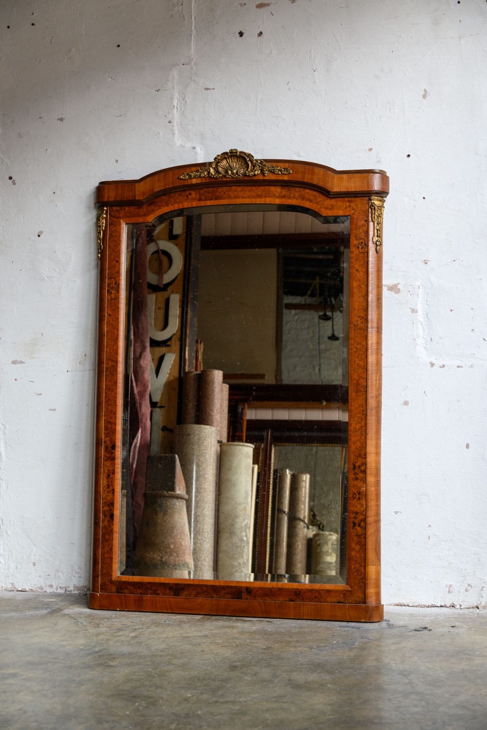 Burrwood veneer mirror with brass mounts, in the French style.