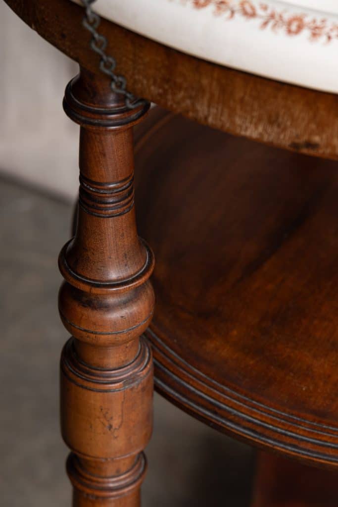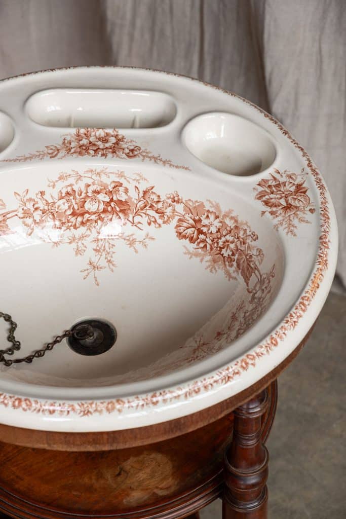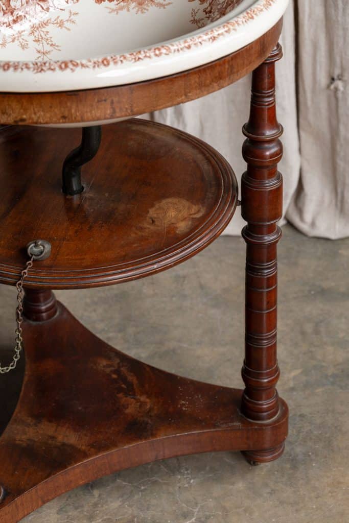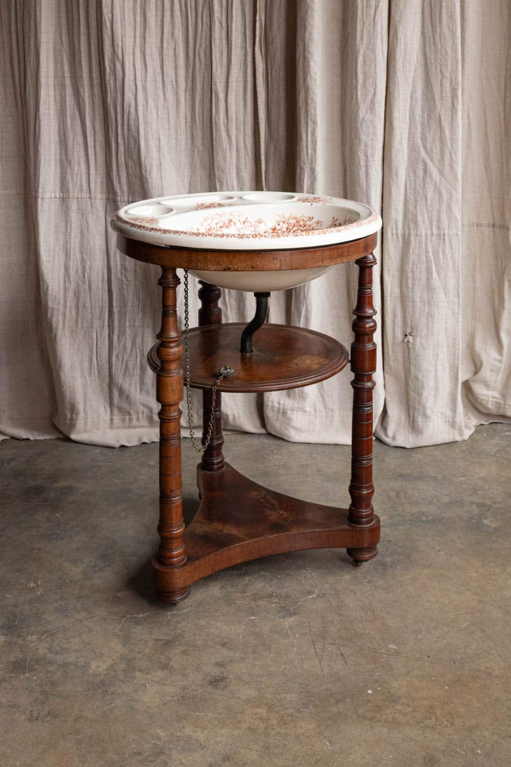 Three recesses for soaps and shaving kit, and original brass-and-lead plug on chain.