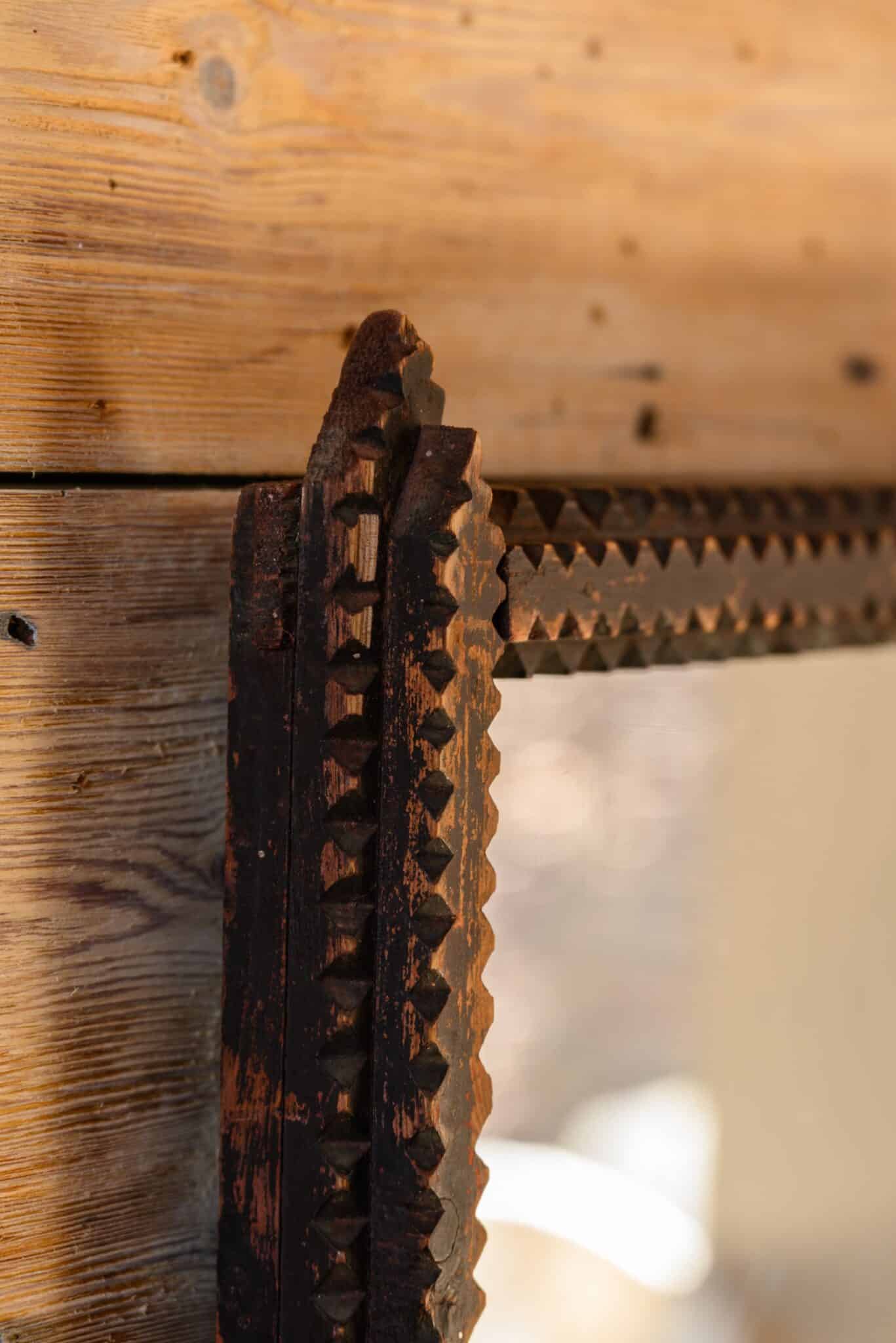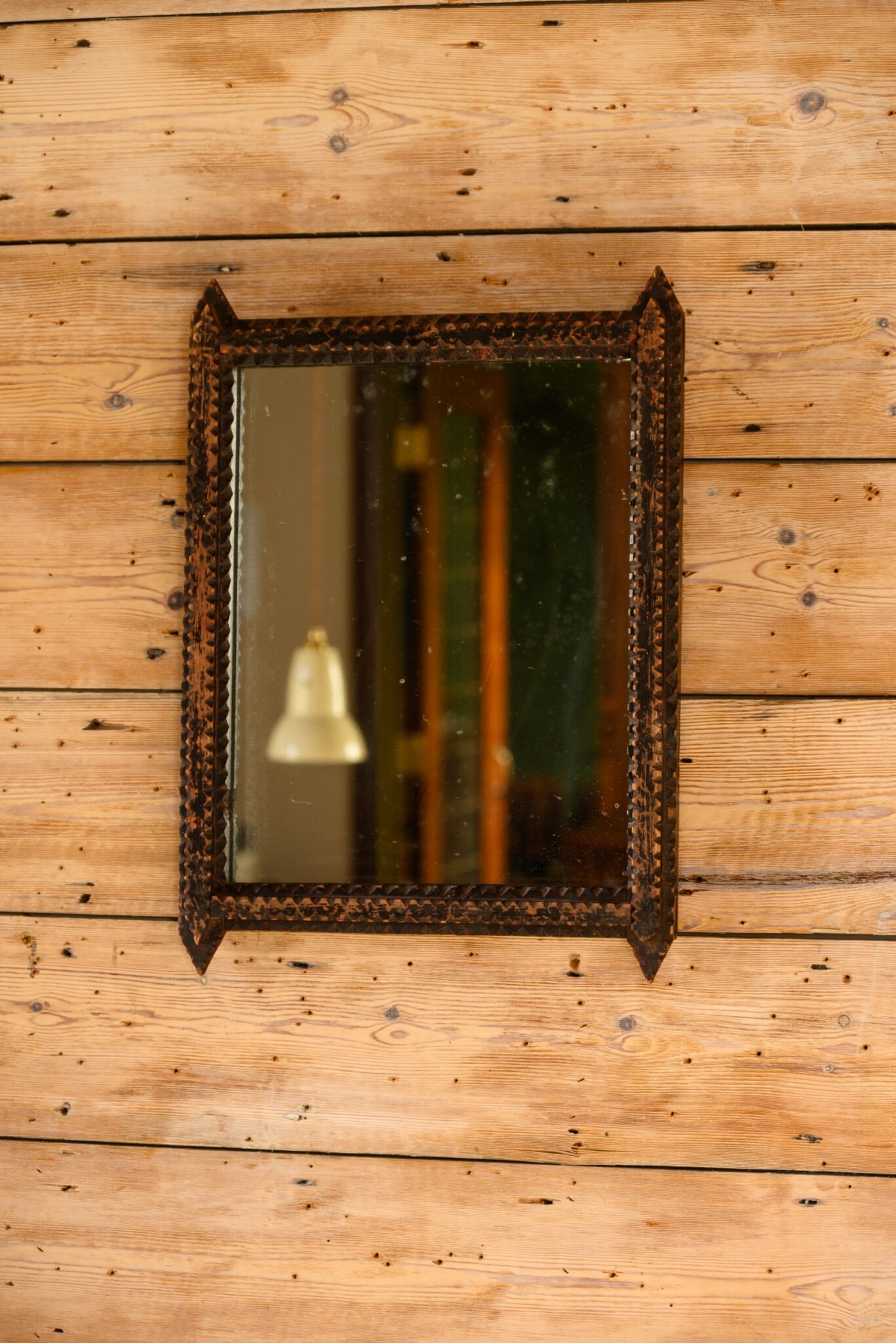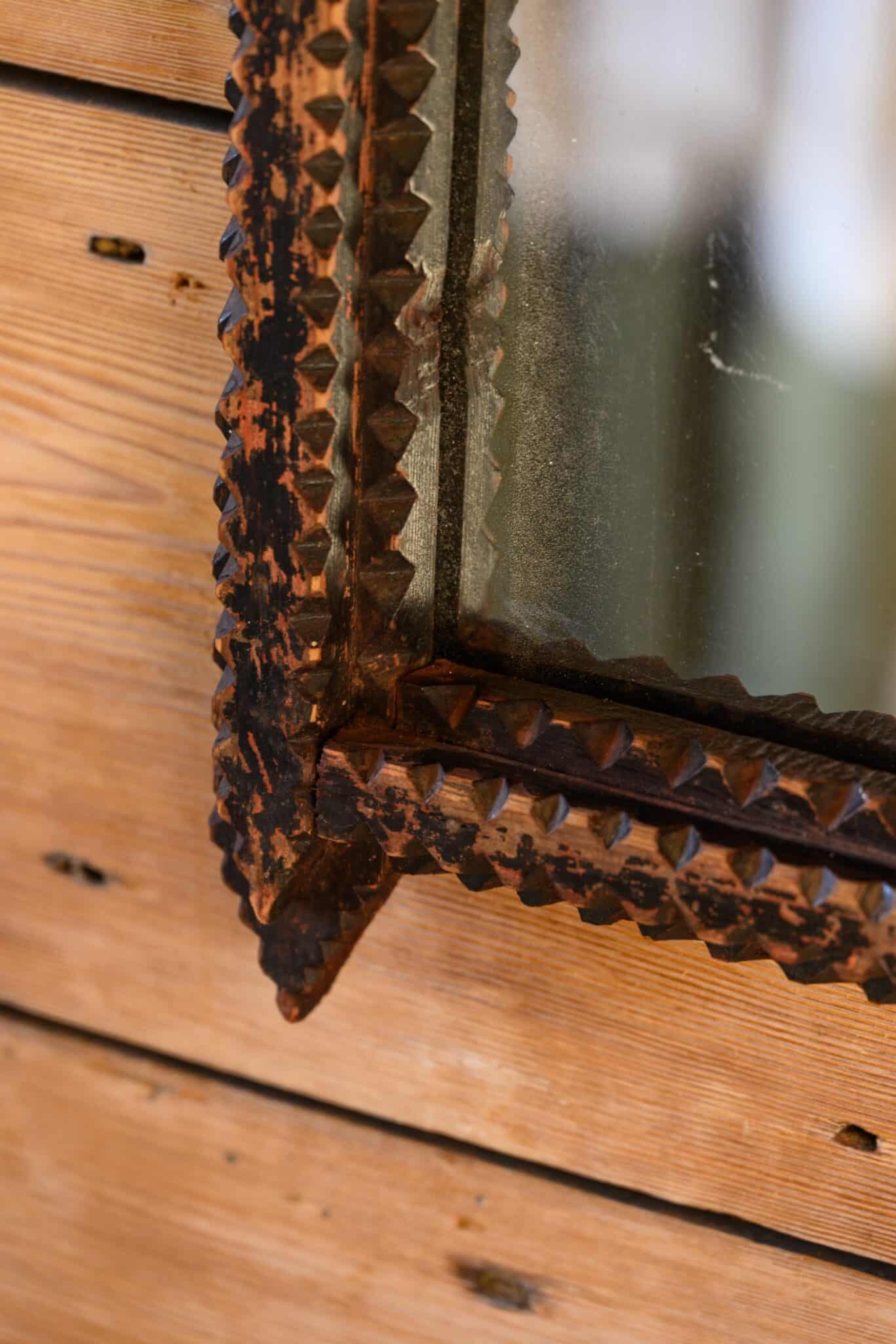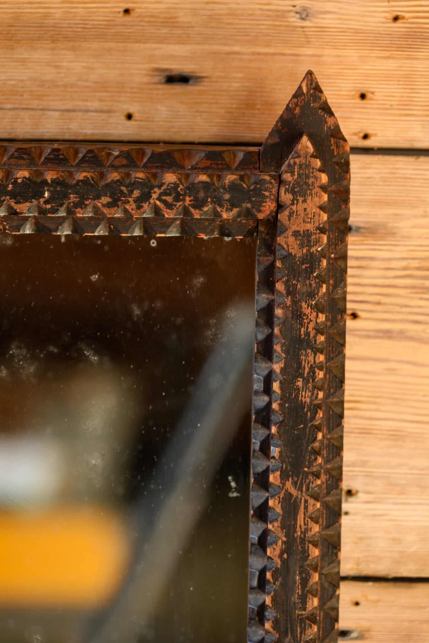 Wall mirror with carved folk art frame and distressed black-painted finish.