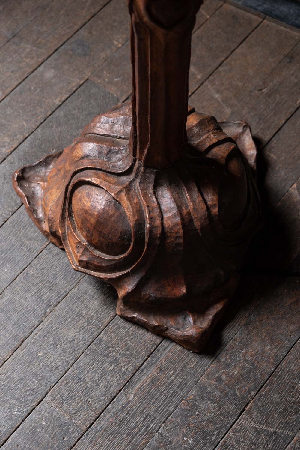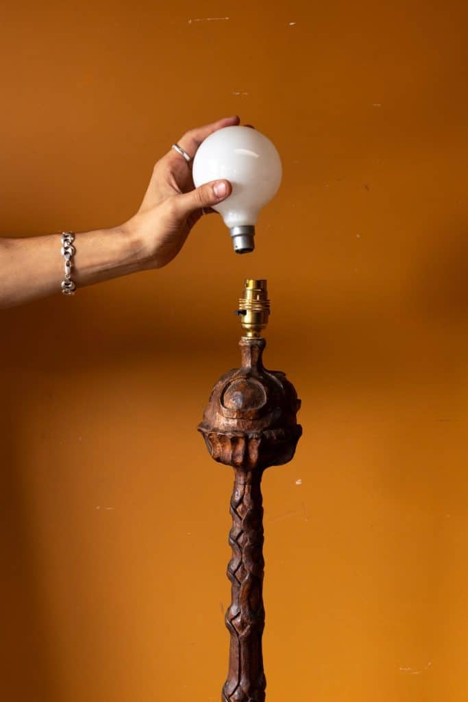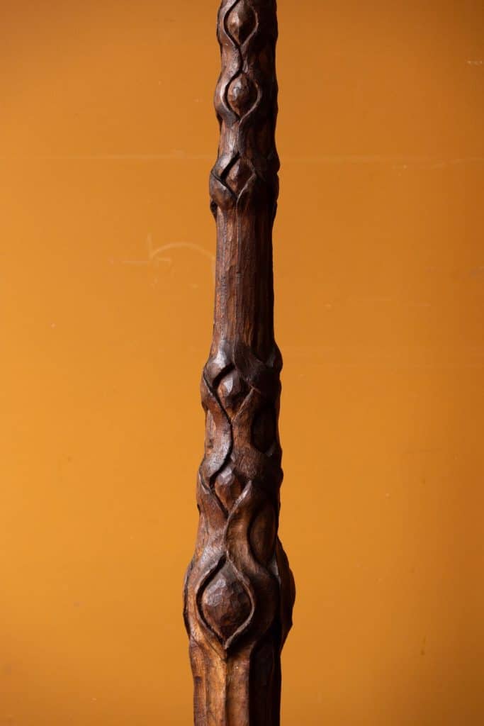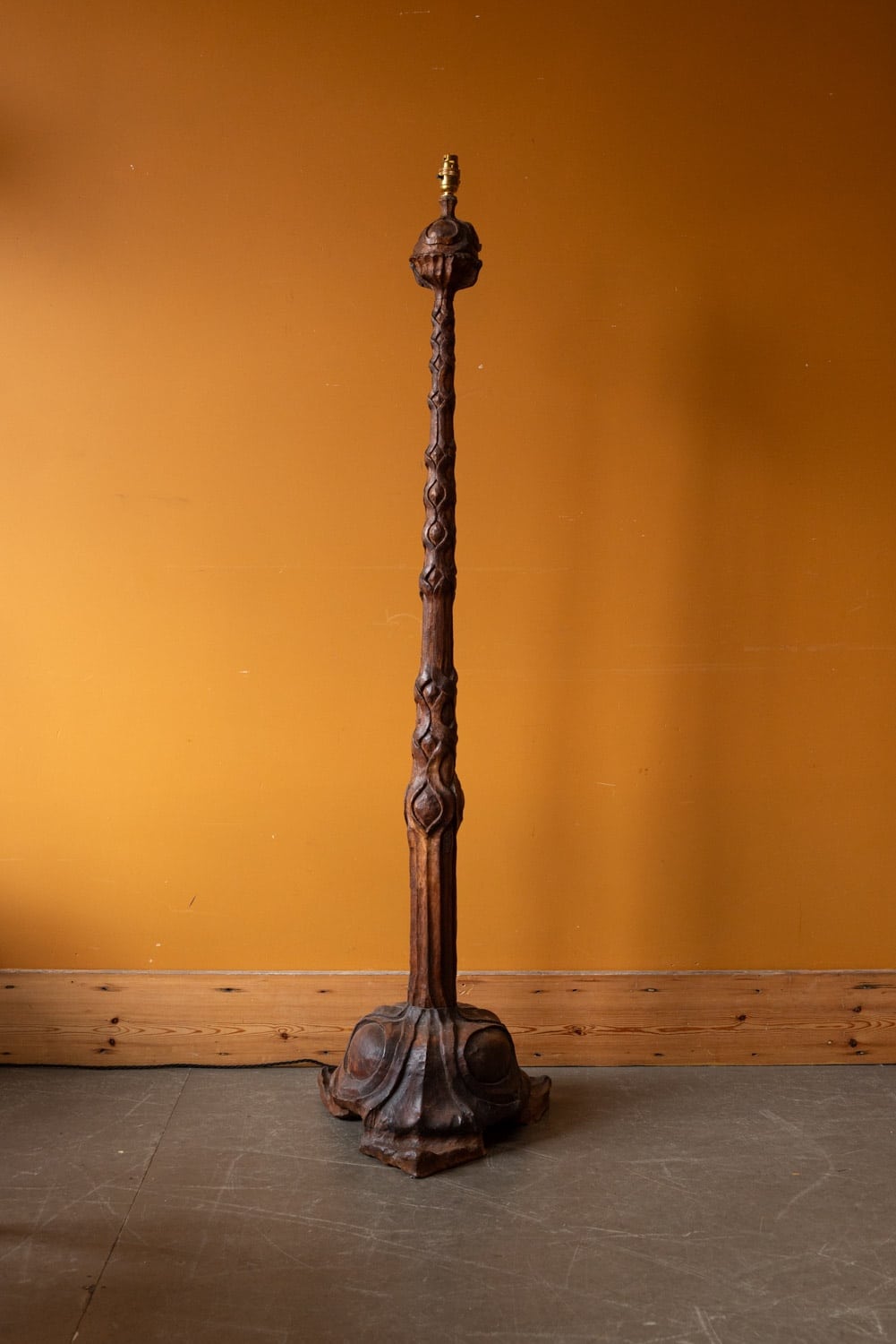 Excellent and unusual hand-carved standing lamp, initialed and dated 1939 & 1940 to base.