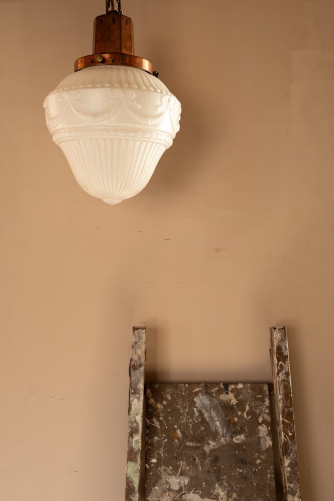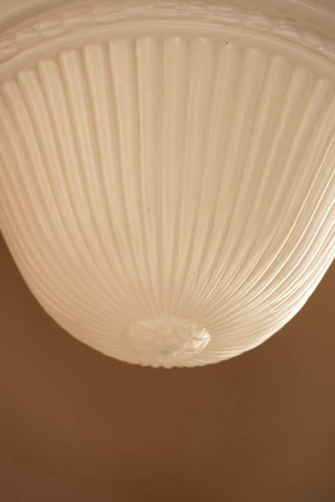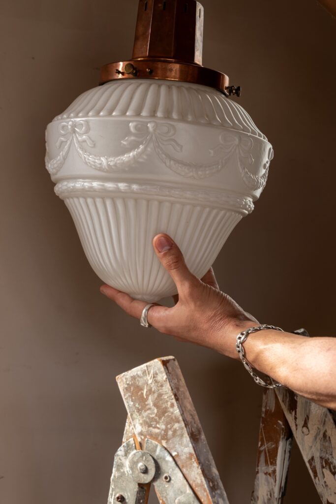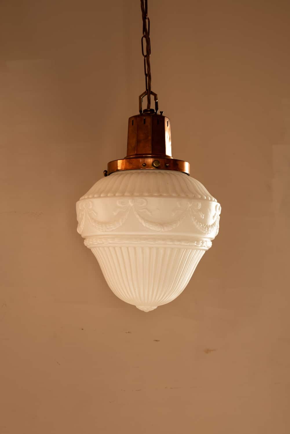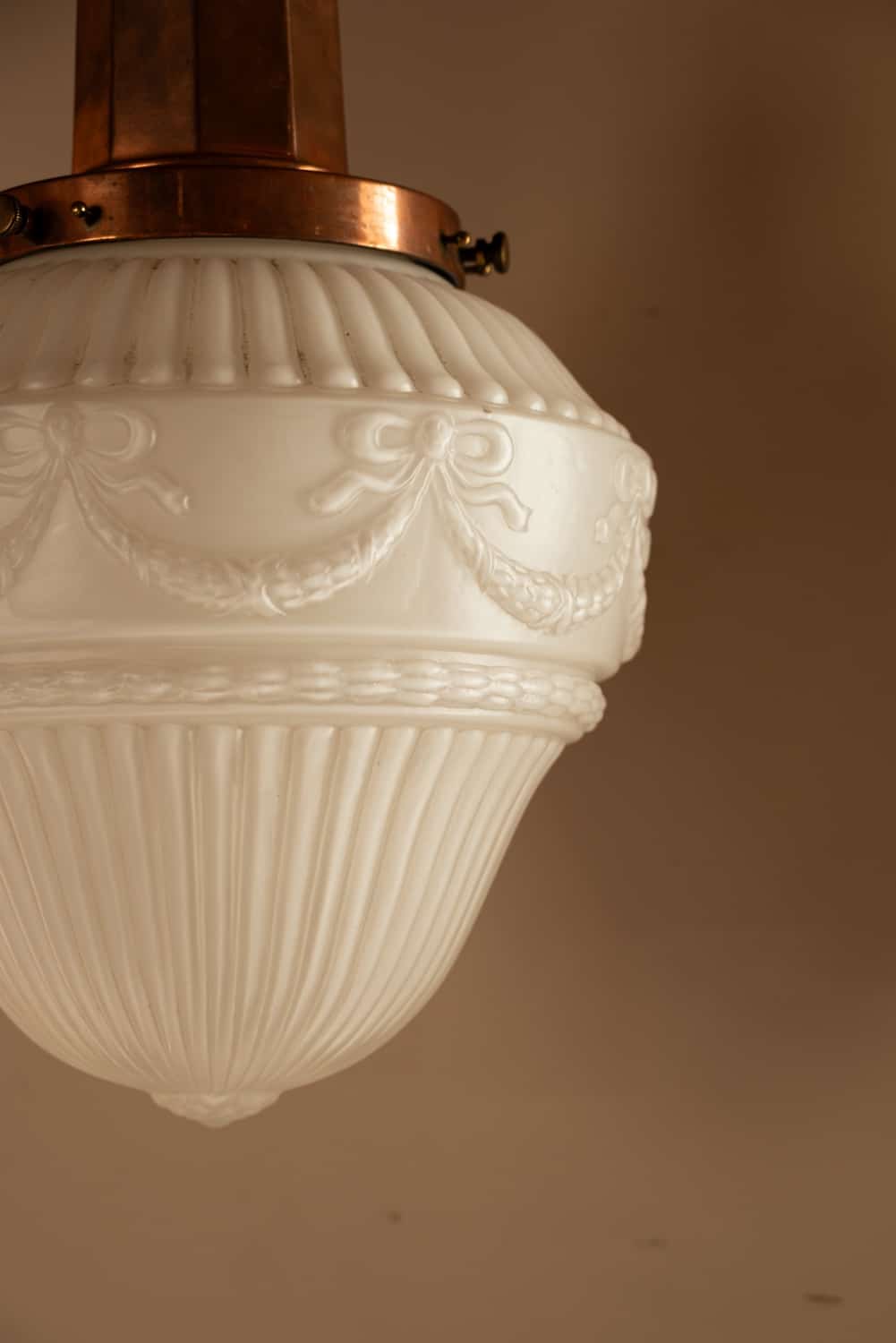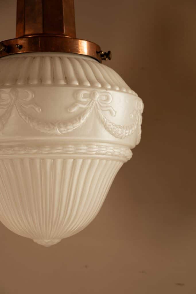 Cast glass pendant with decorative swags on a tall copper gallery.