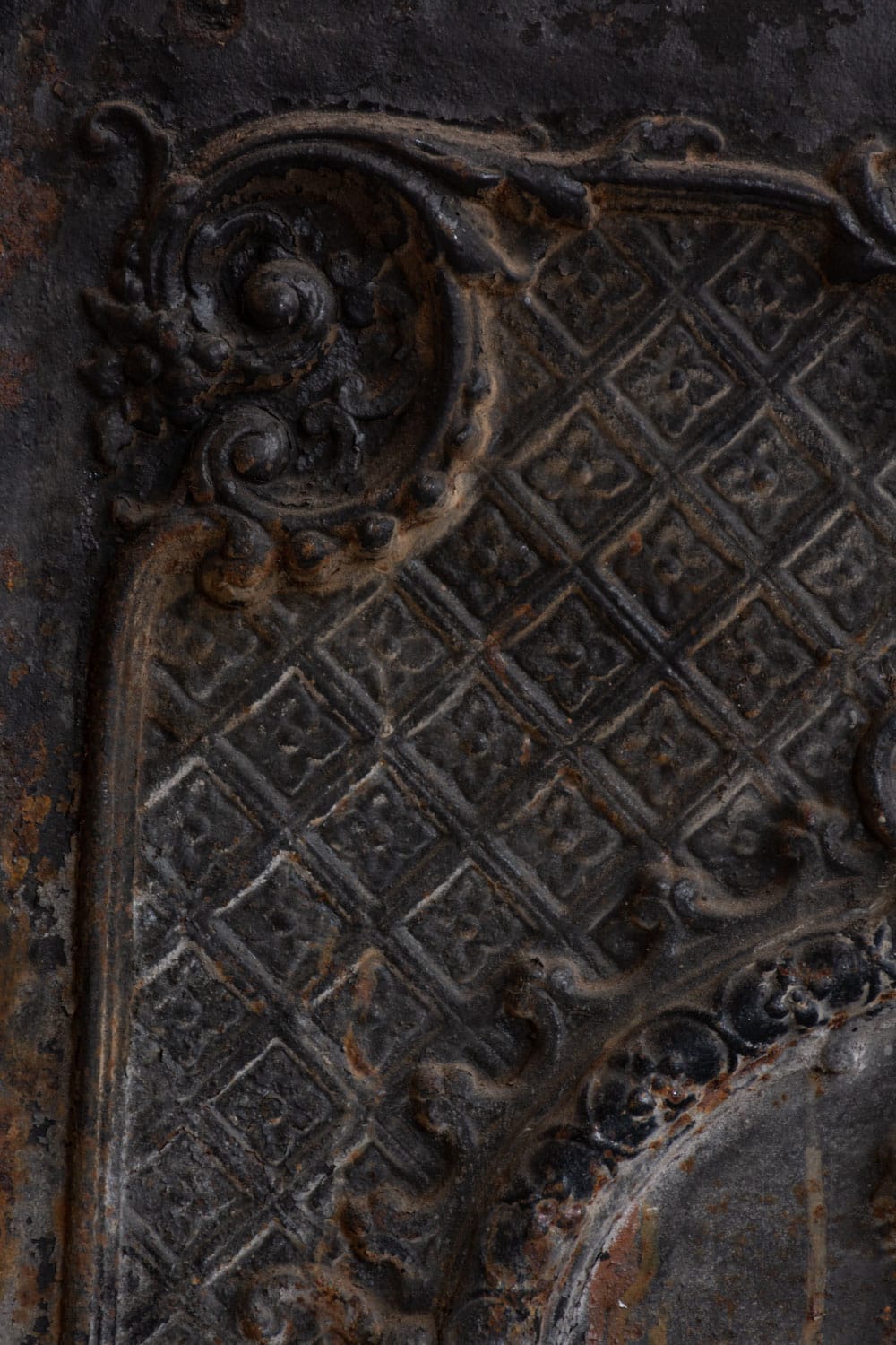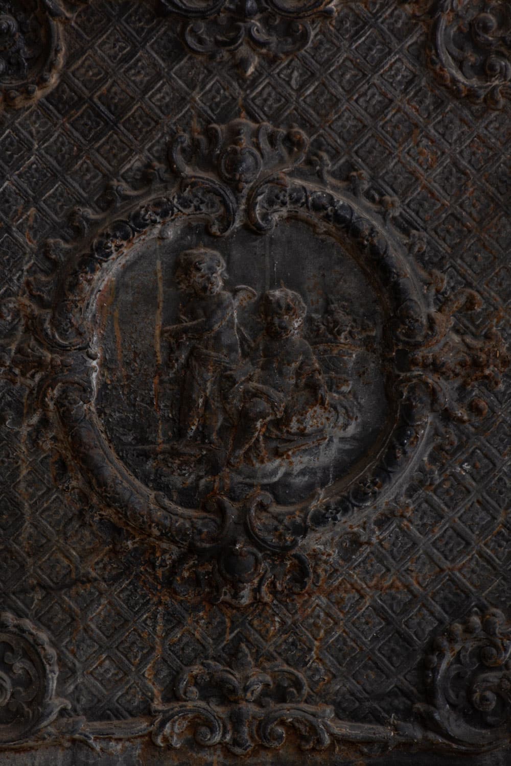 A decorative design with a wreathed scene in the centre depicting a pair of cherubs.