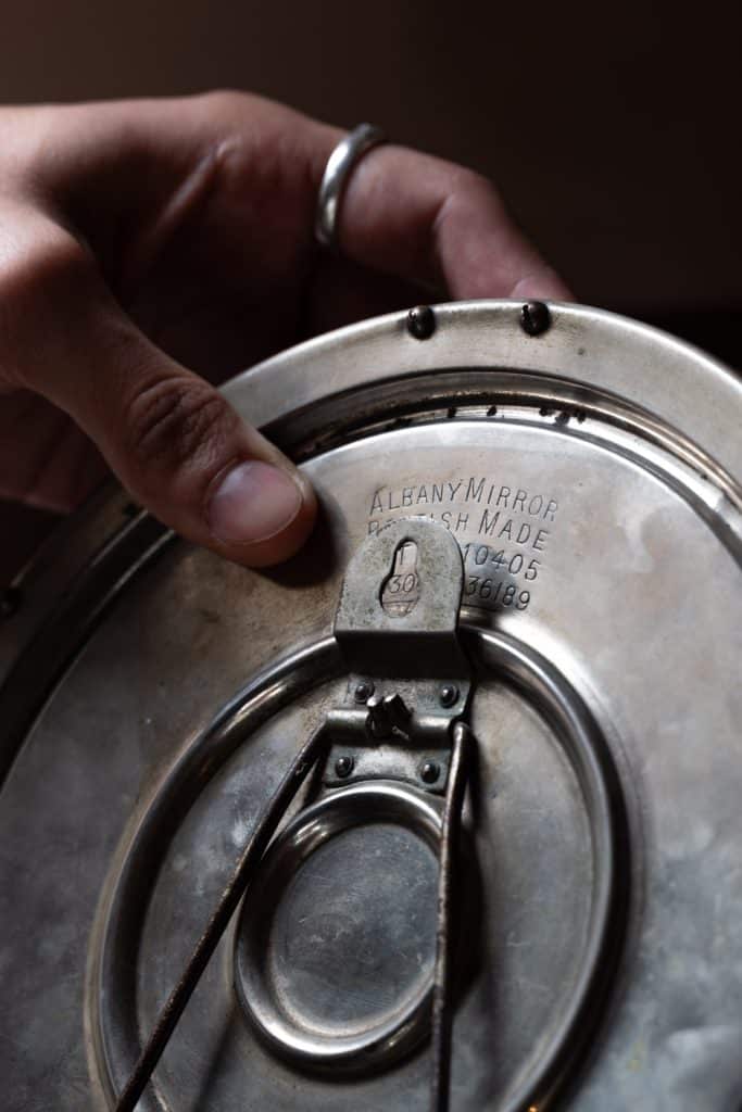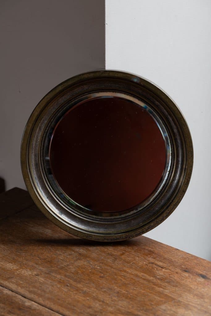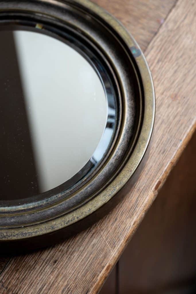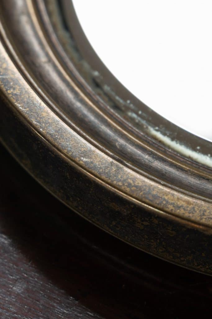 Patinated brass frame and bevelled plate.