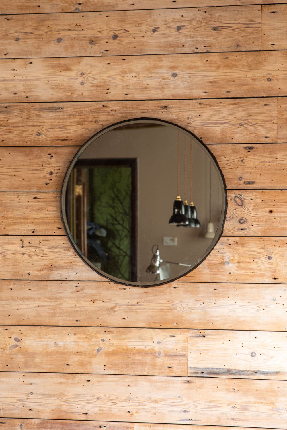 Antique circular wall mirror with a brass-studded leather effect frame.