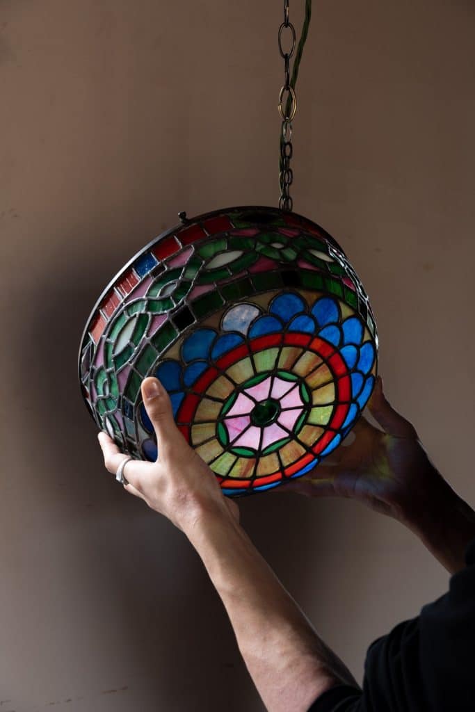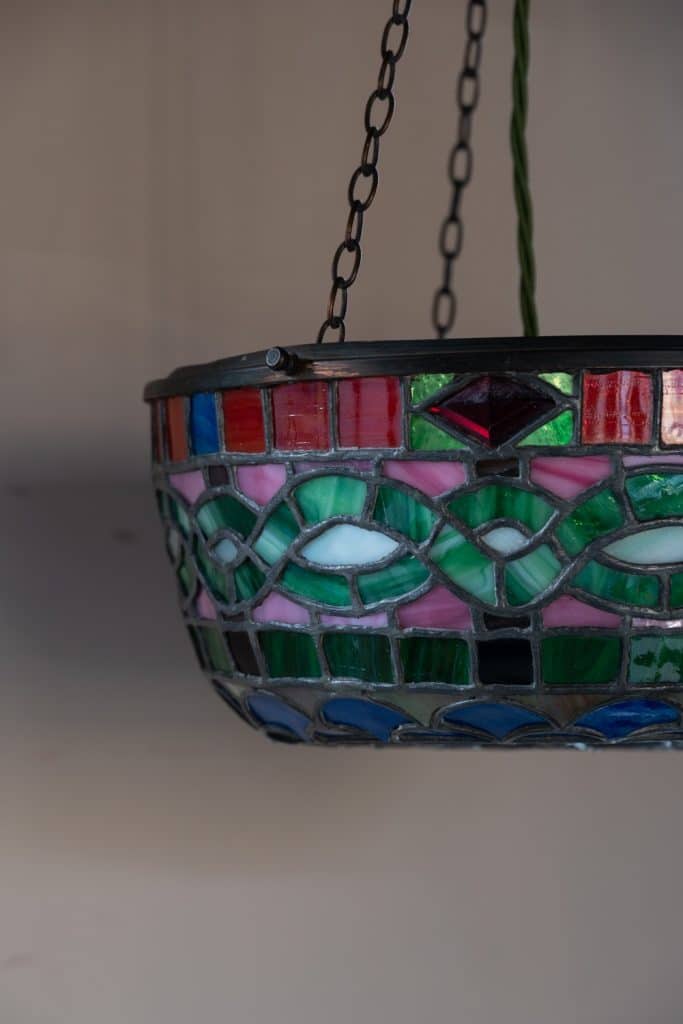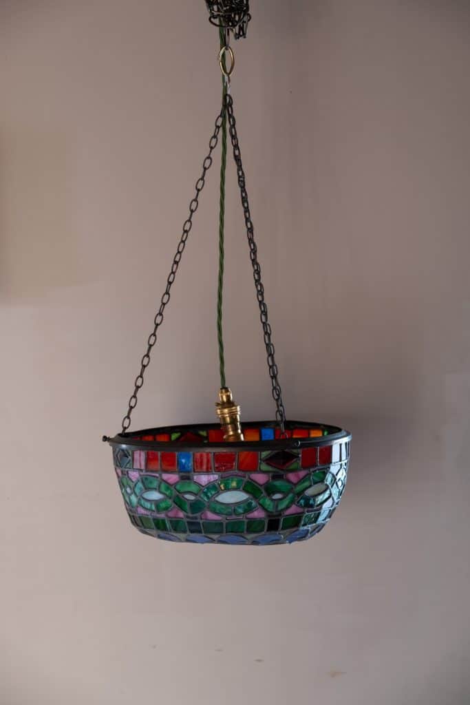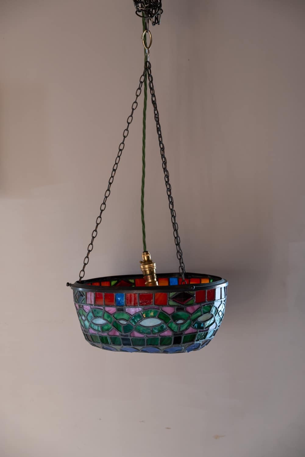 Early 20th century coloured leaded glass hanging light, on three chains.