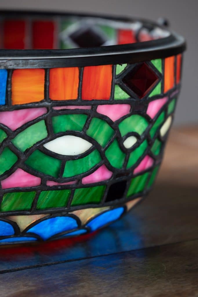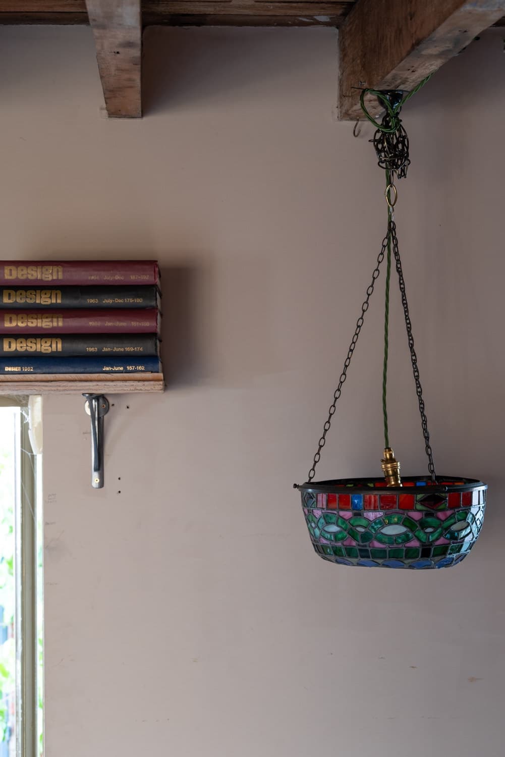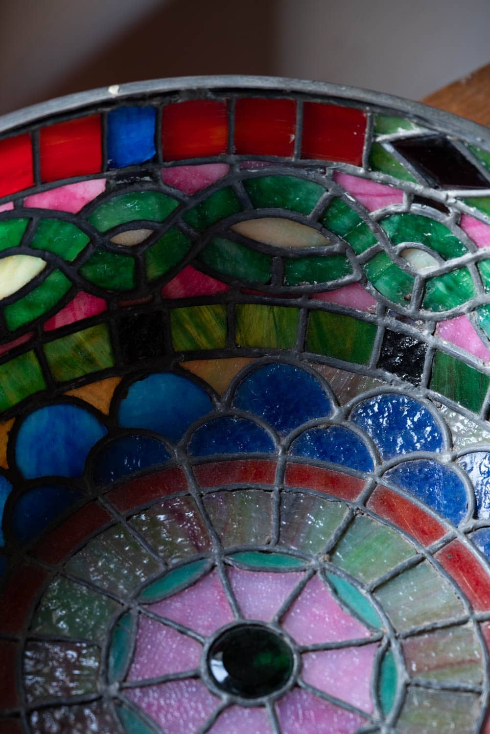 Early 20th century coloured leaded glass hanging light, on three chains.