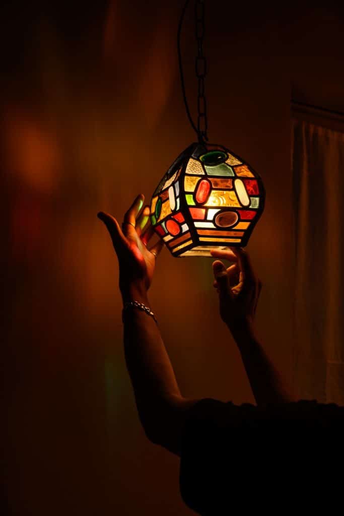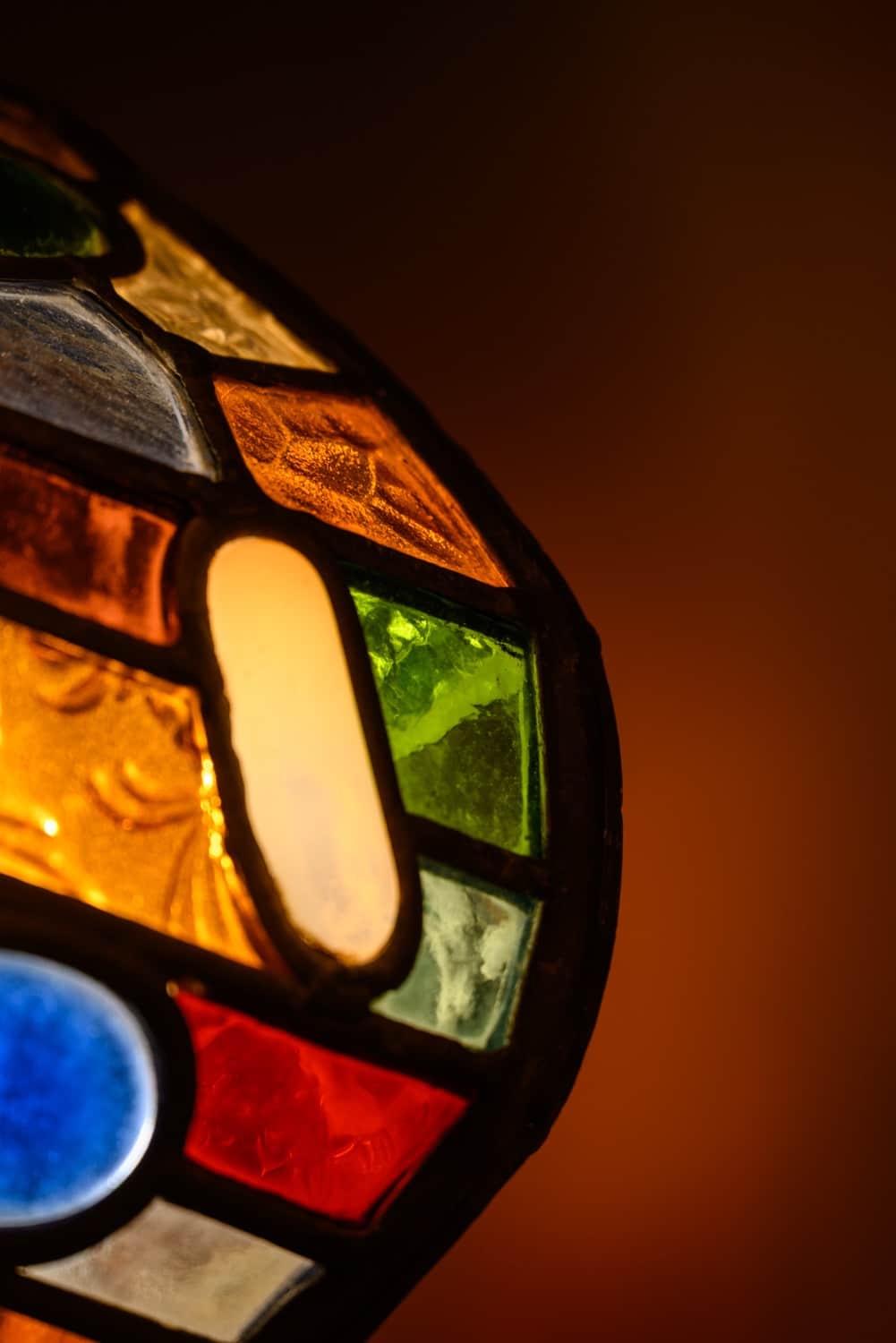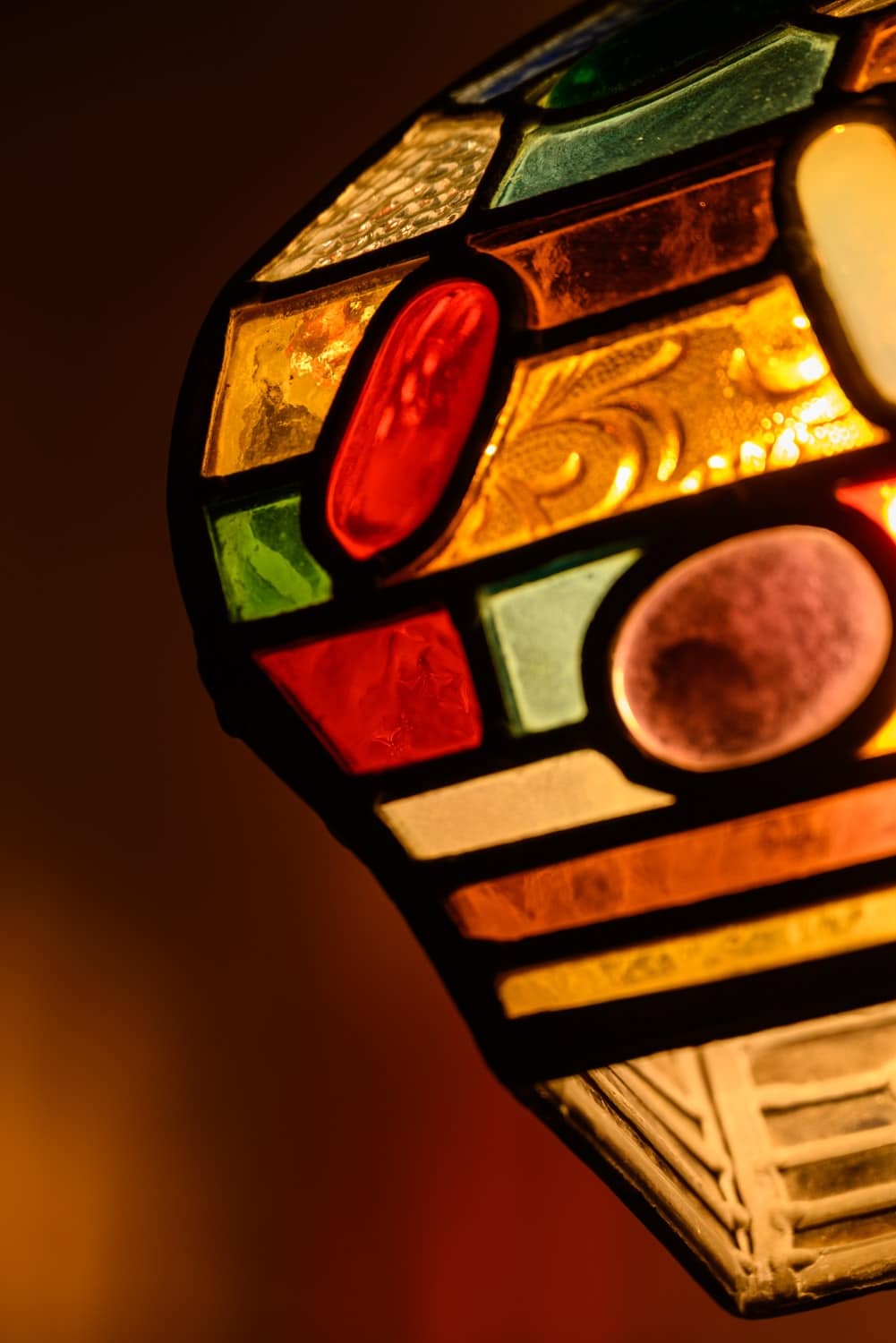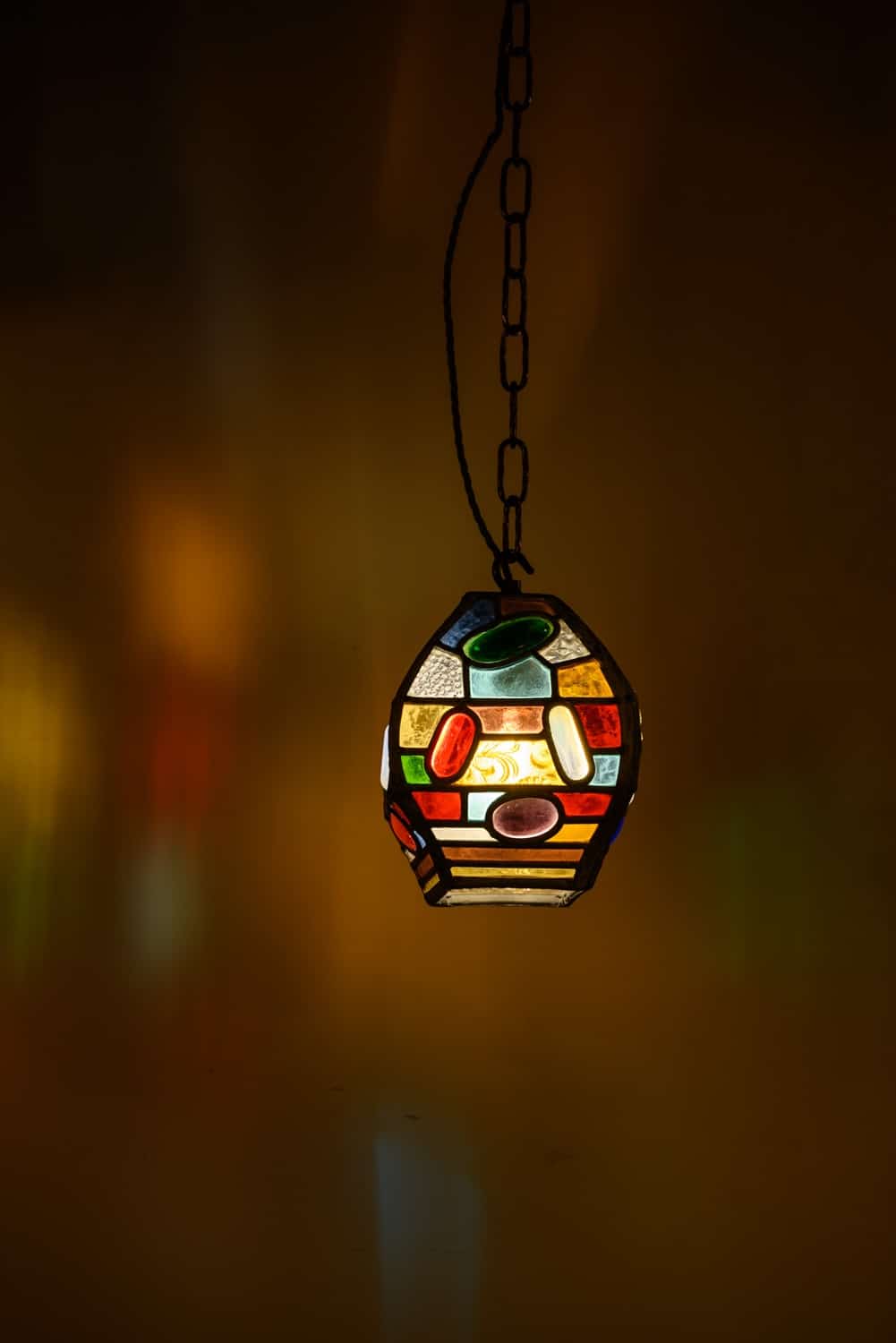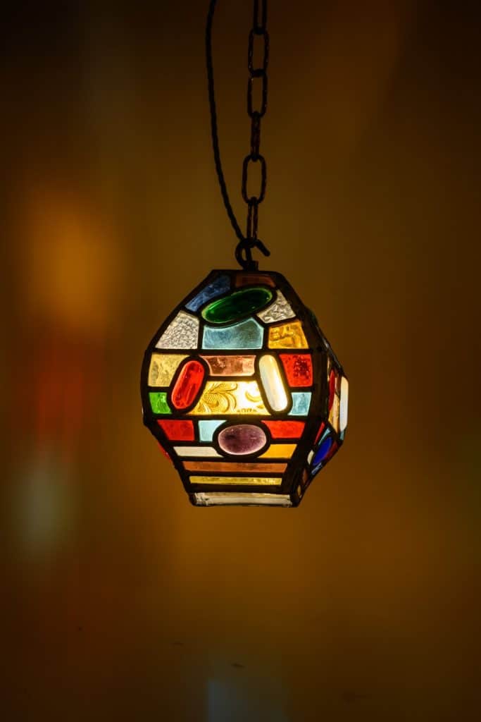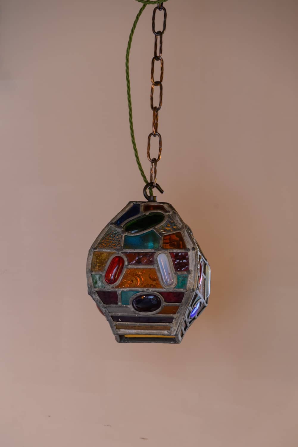 Leaded glass lantern with many colours and textures, in a very lovely shape.