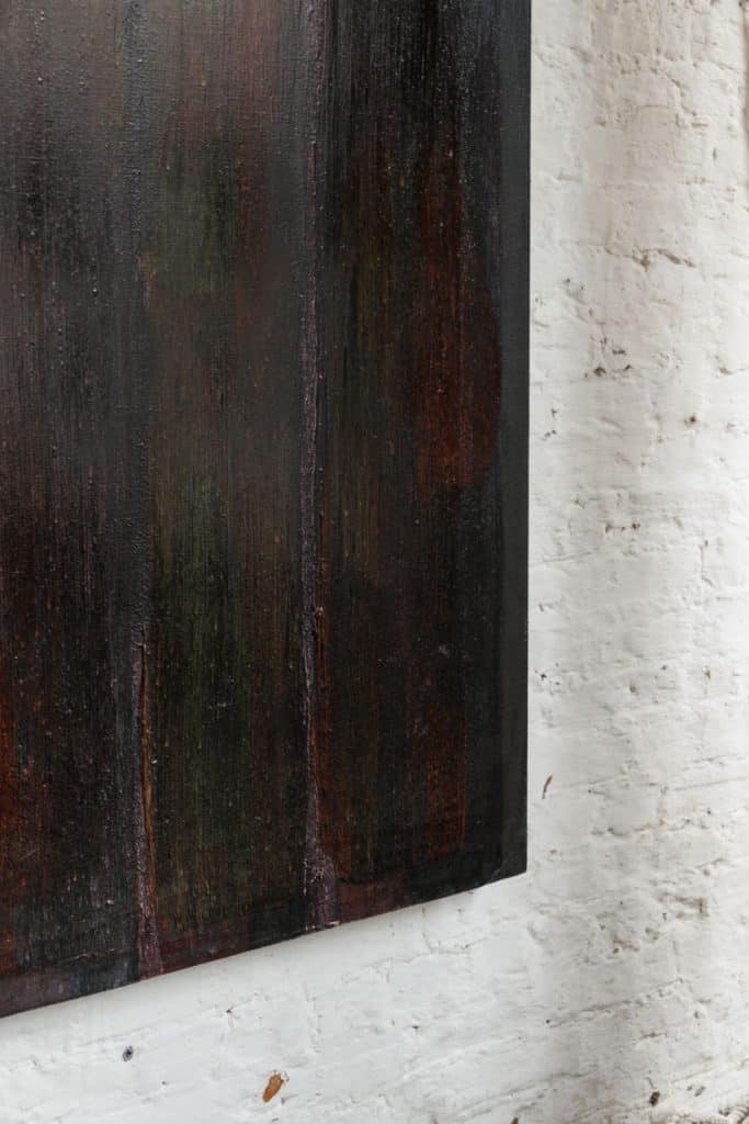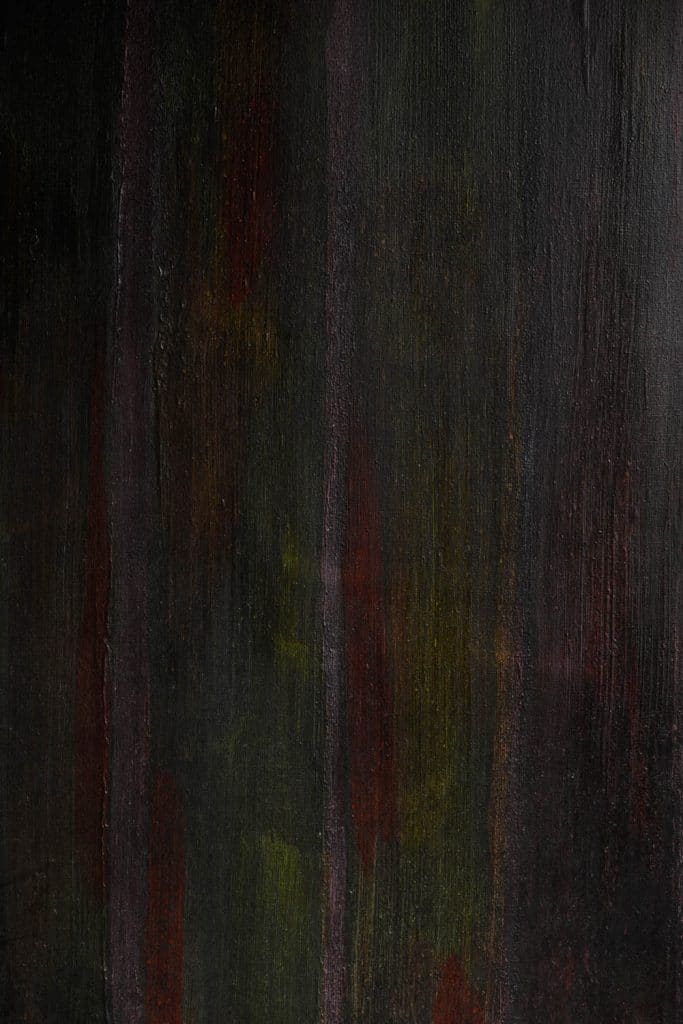 Dark Minimalist painting by British artist Torie Begg, with streaks of colours on a dark backdrop. Oil on canvas.