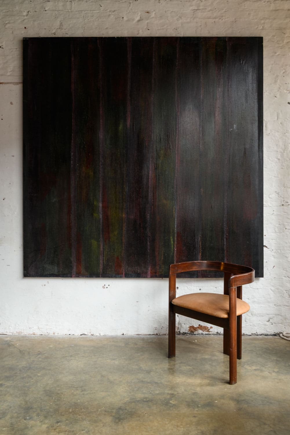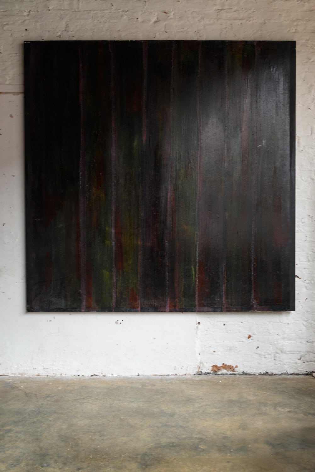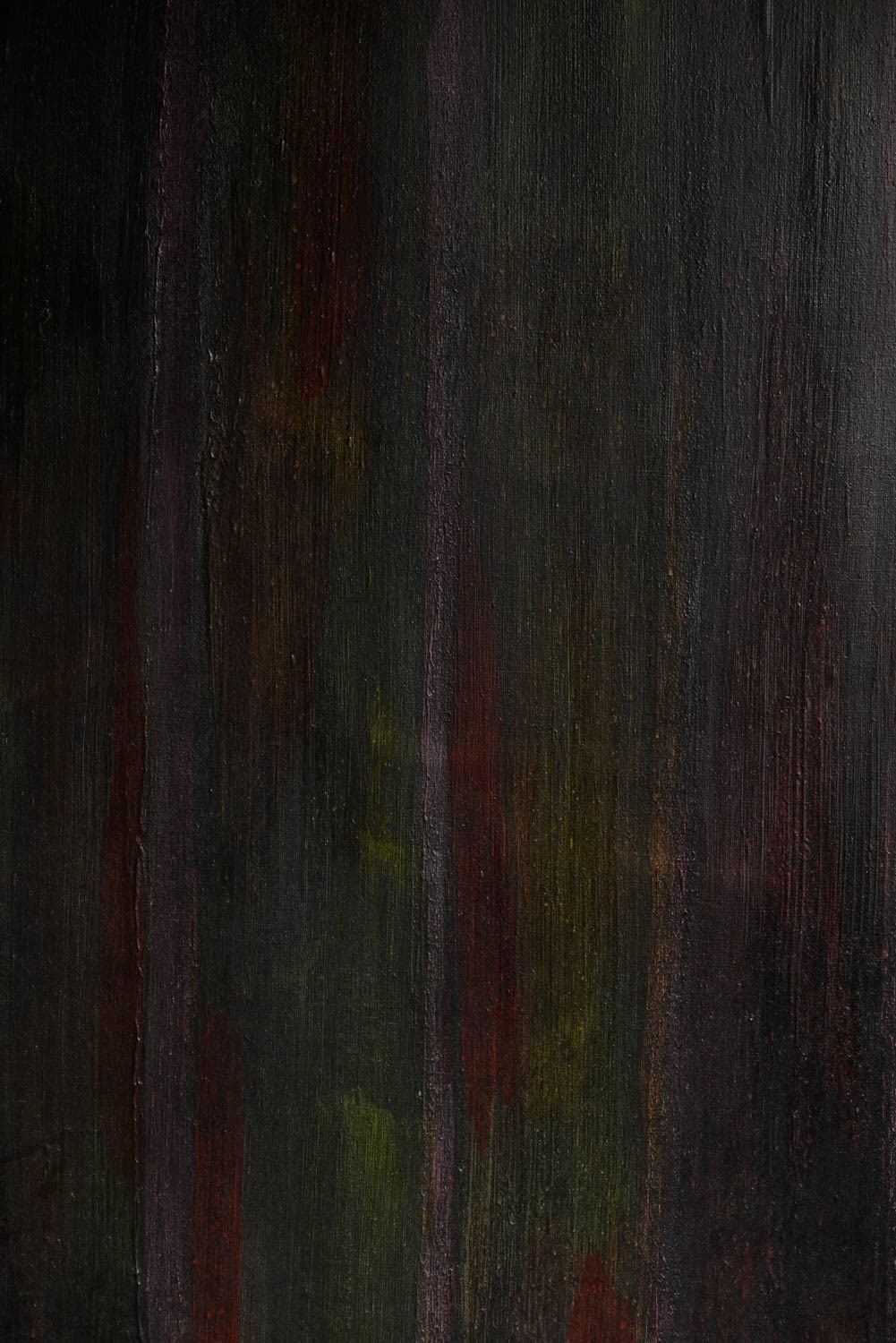 Dark Minimalist painting by British artist Torie Begg, with streaks of colours on a dark backdrop. Oil on canvas.