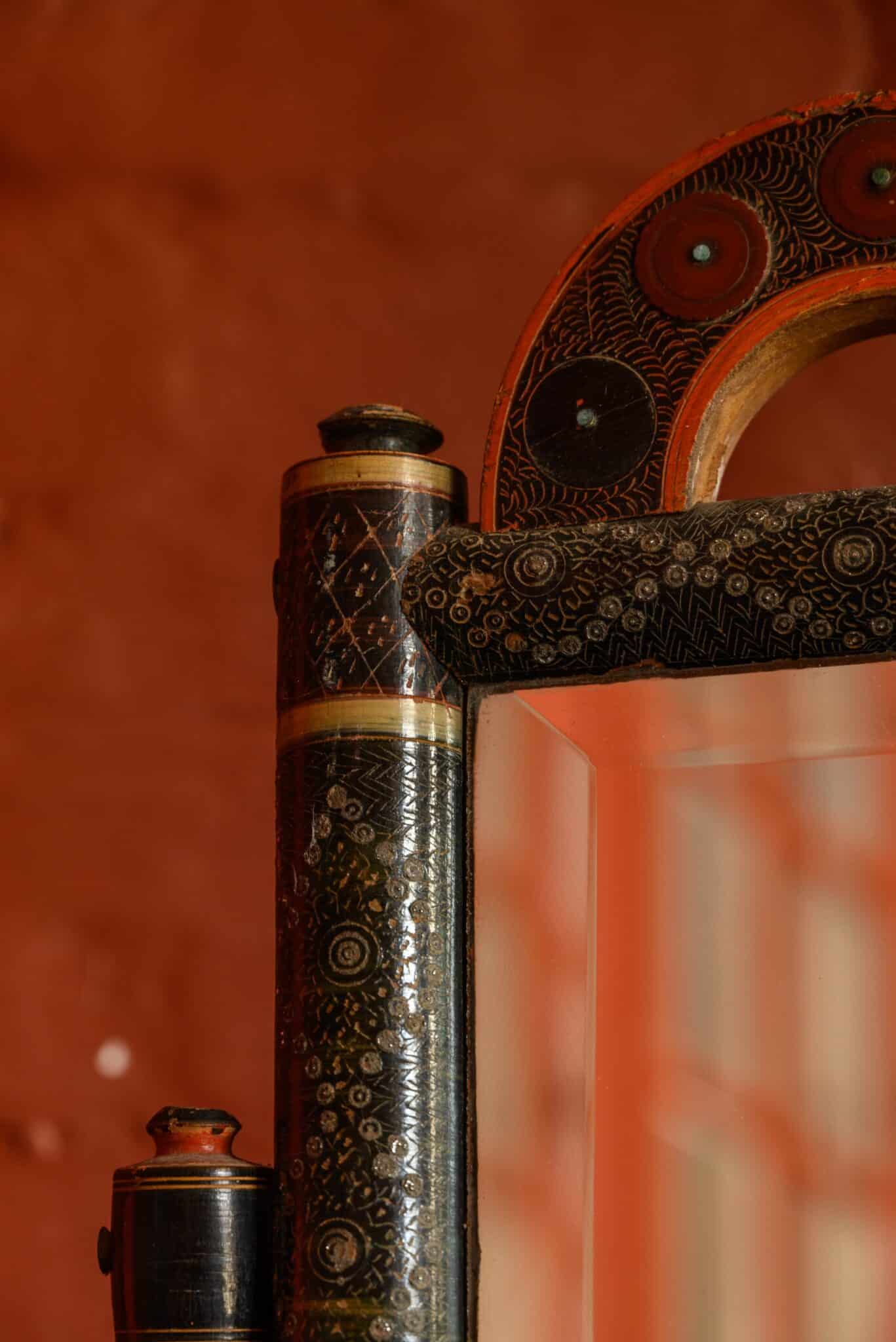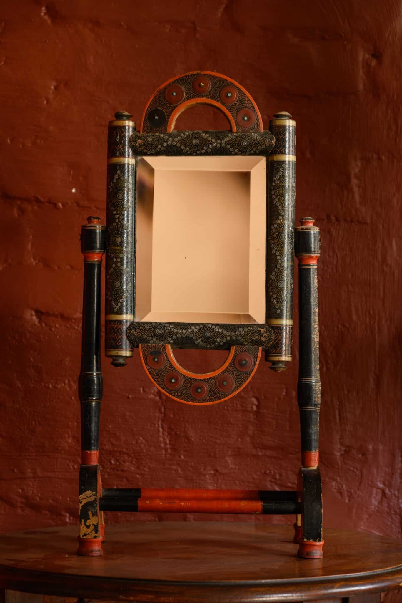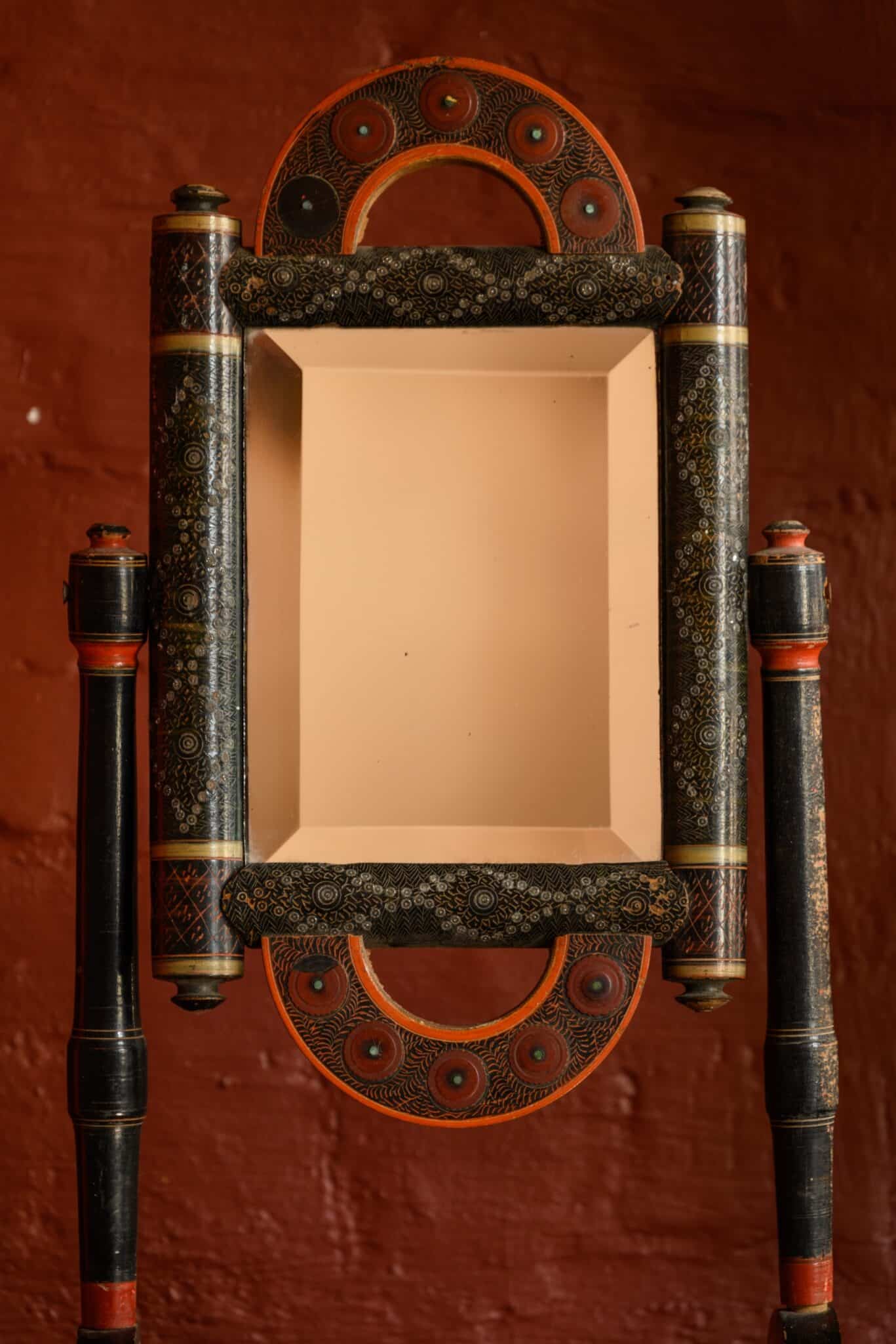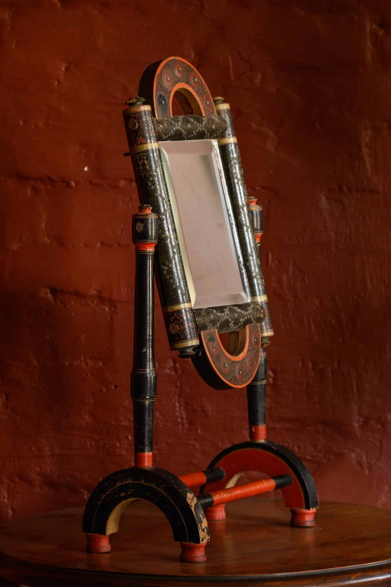 An unusual decorative standing mirror, with many paint effects and metal inlays, of uncertain origin.
