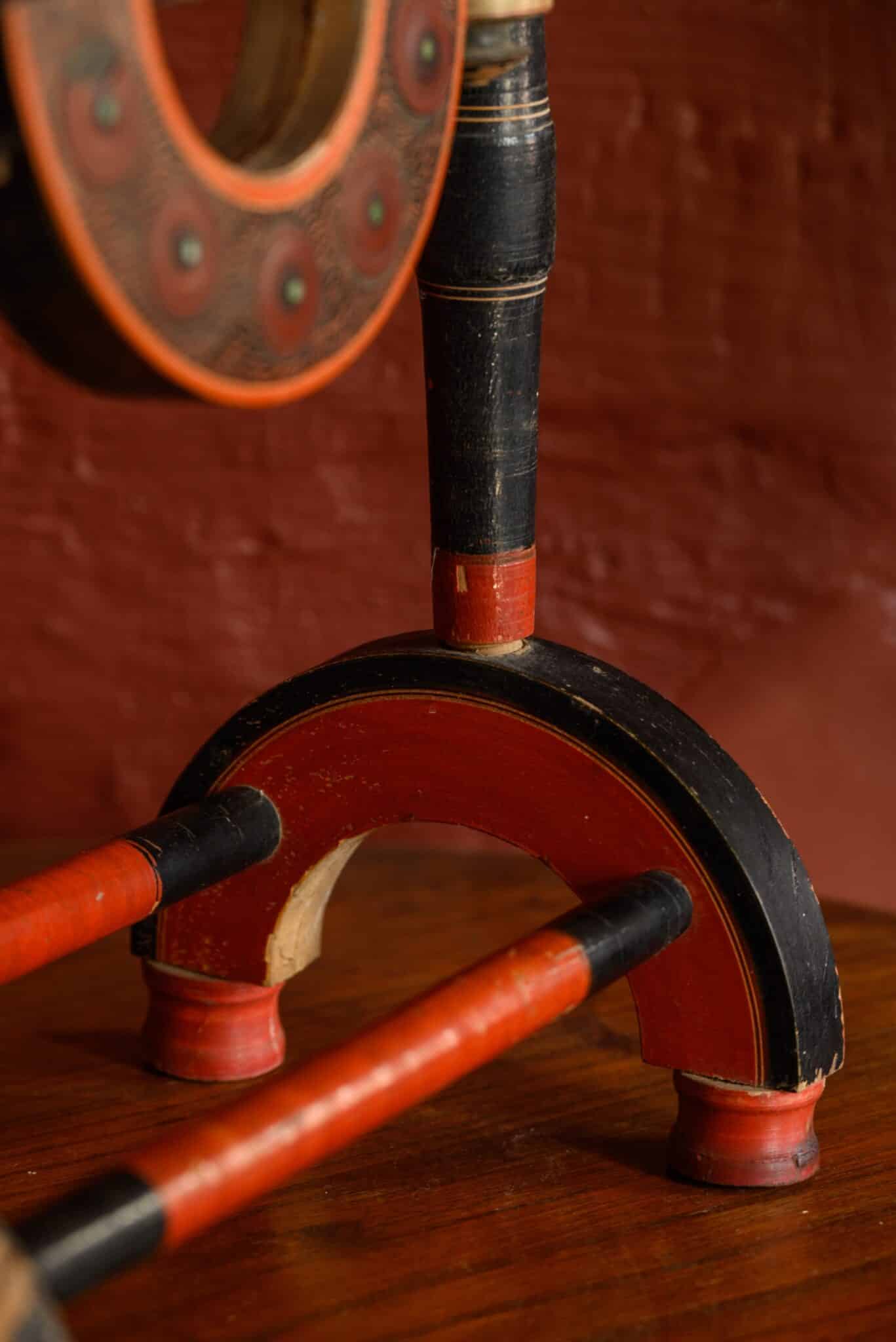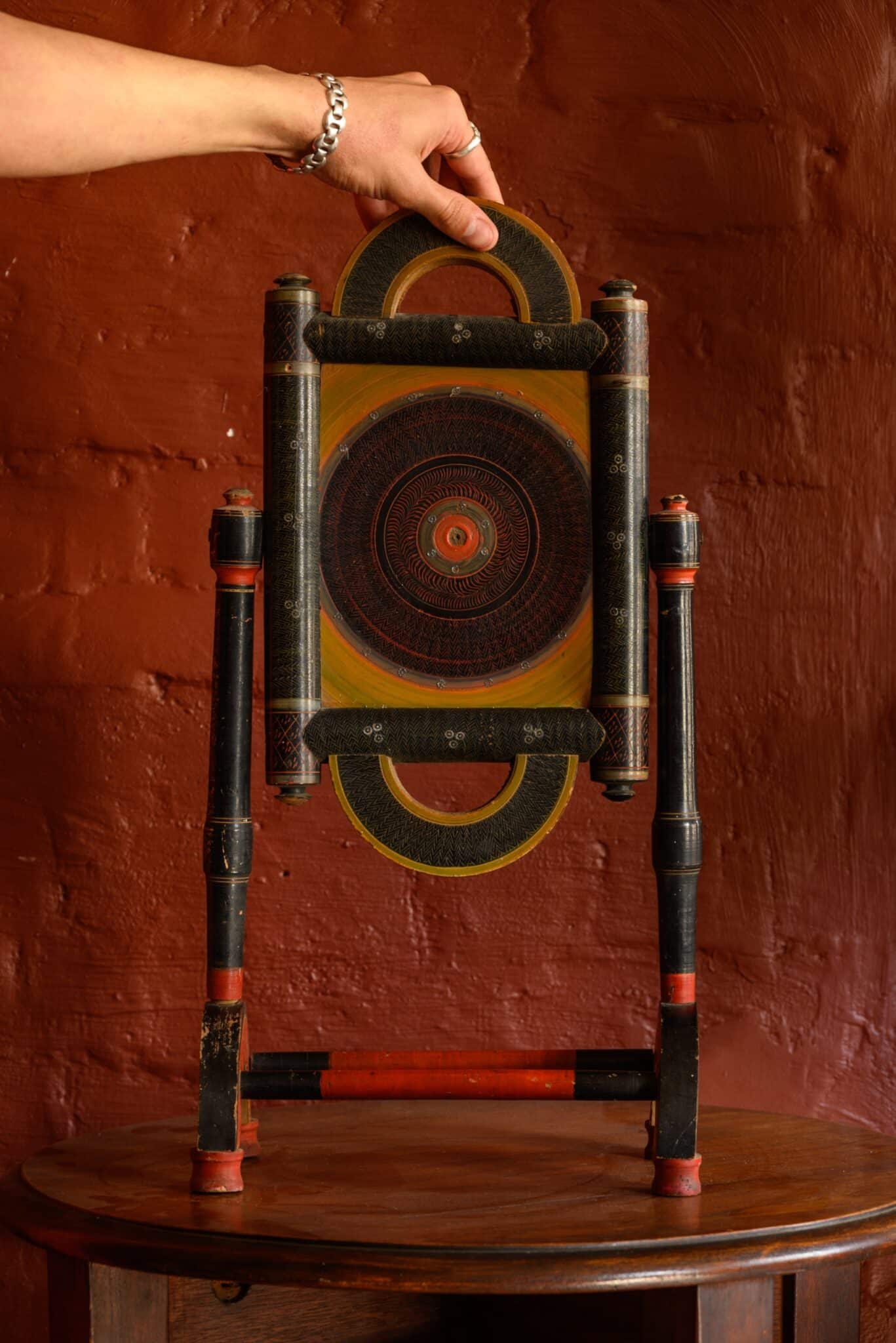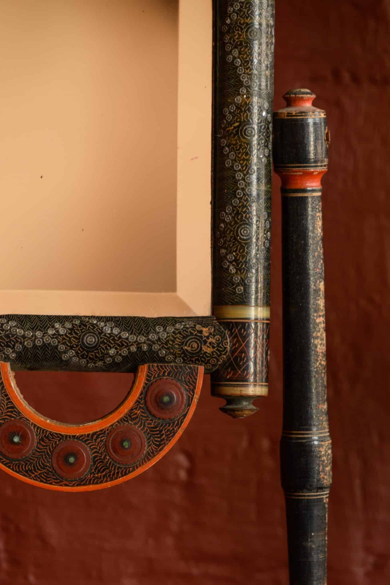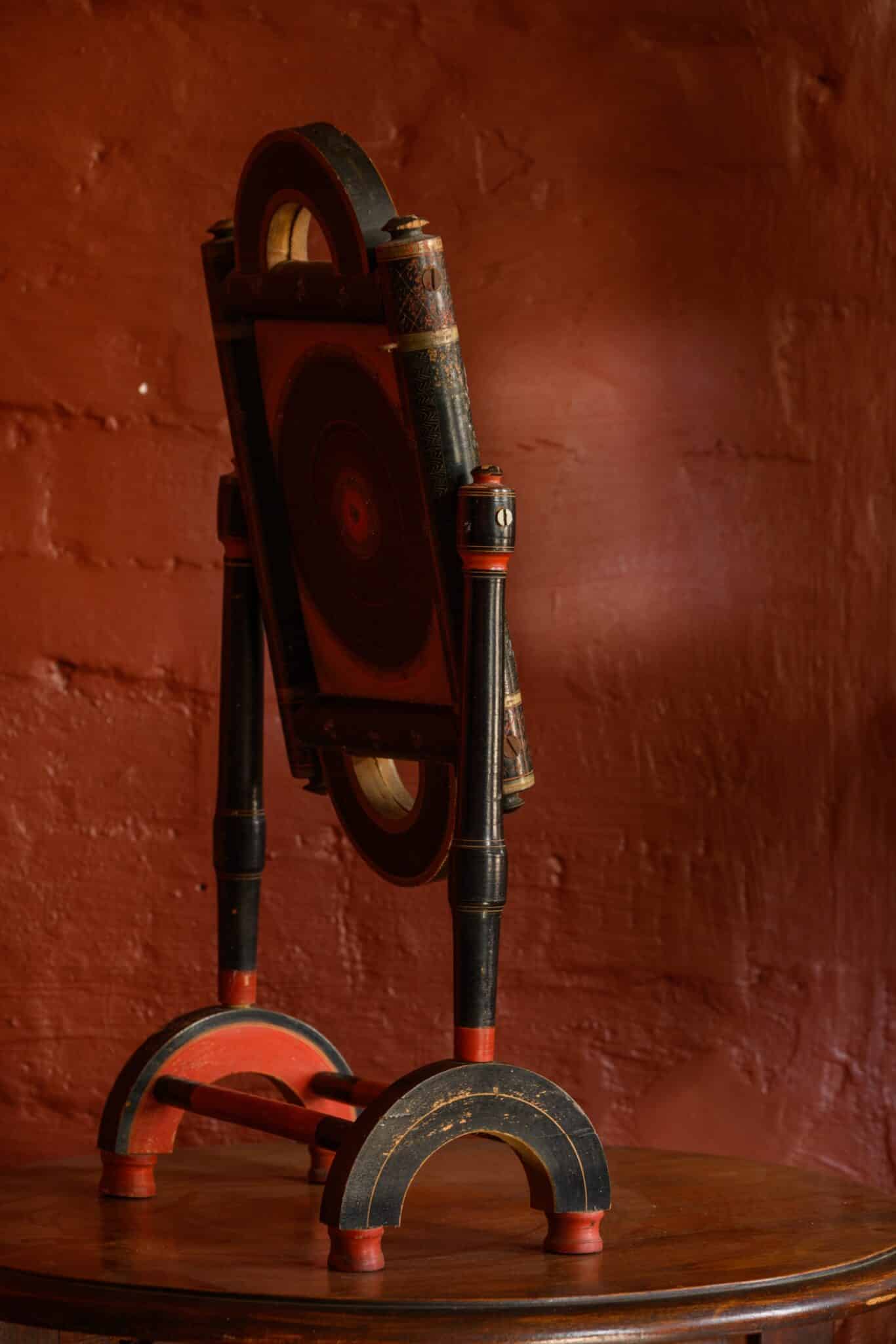 An unusual decorative standing mirror, with many paint effects and metal inlays, of uncertain origin.