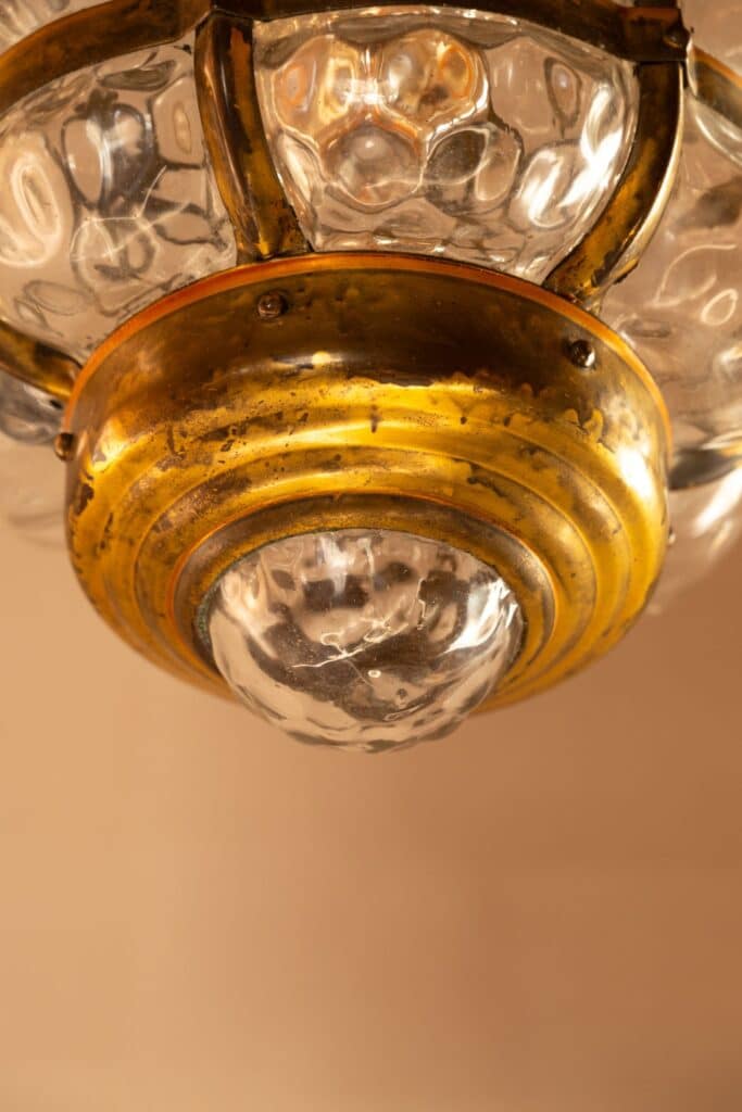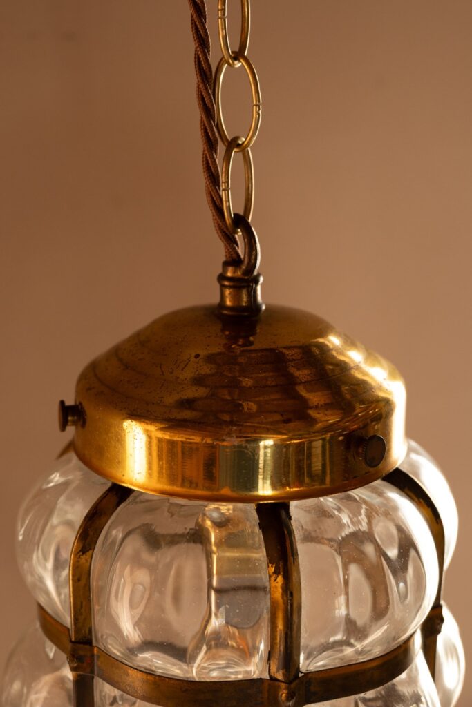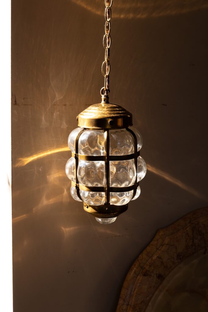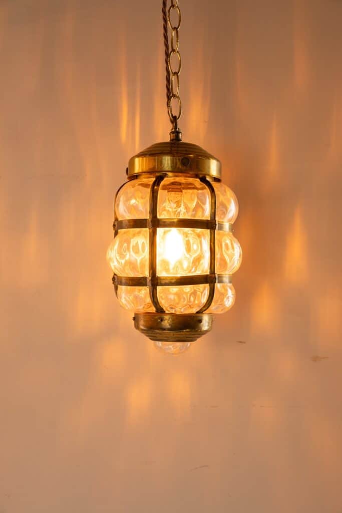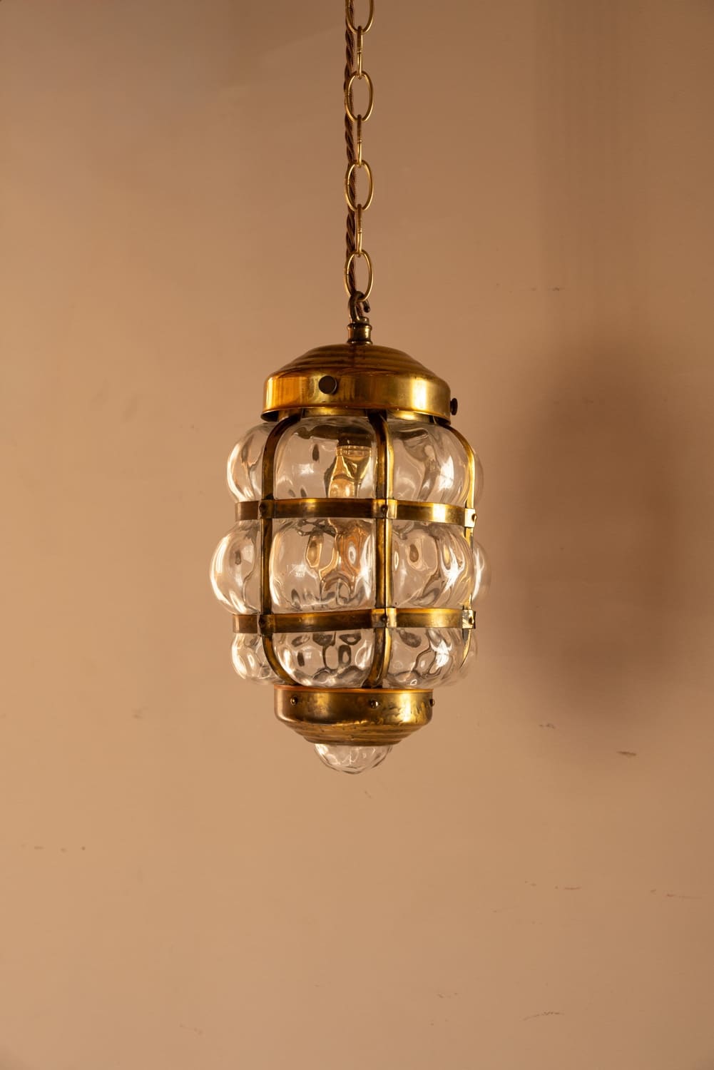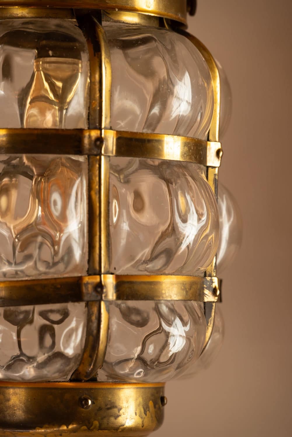 Brass bubble lantern with bulbous dimpled glass that scatters the light.
