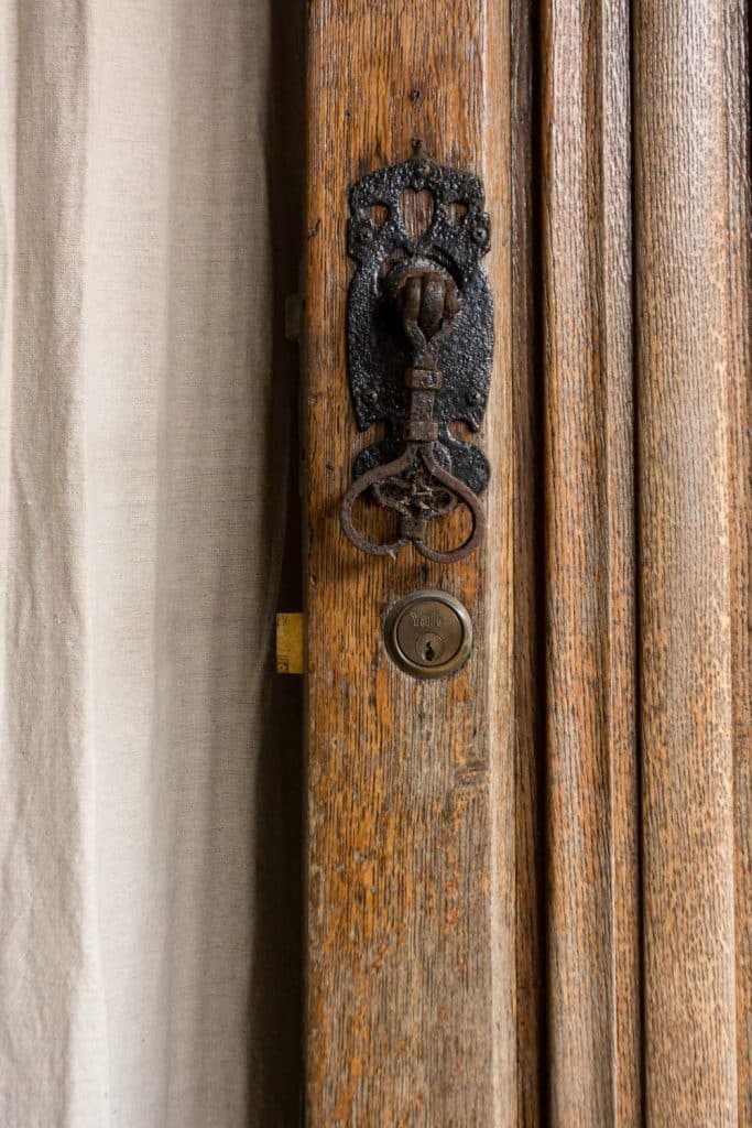 A formidable Edwardian oak entrance door, with carved linenfold exterior.