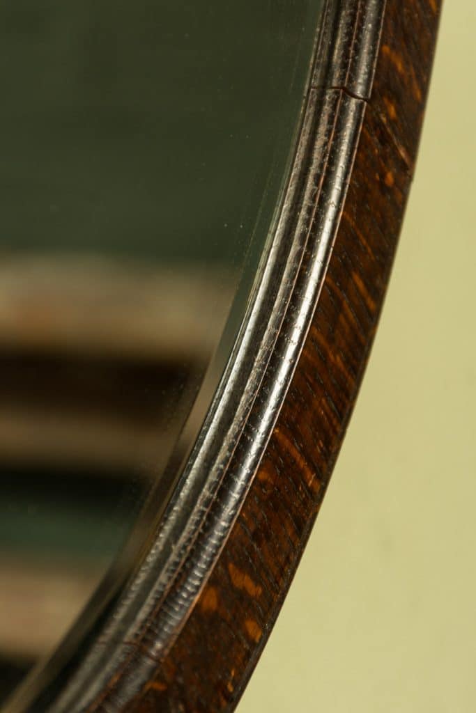 Handsome Edwardian circular oak mirror featuring a bevelled edge.