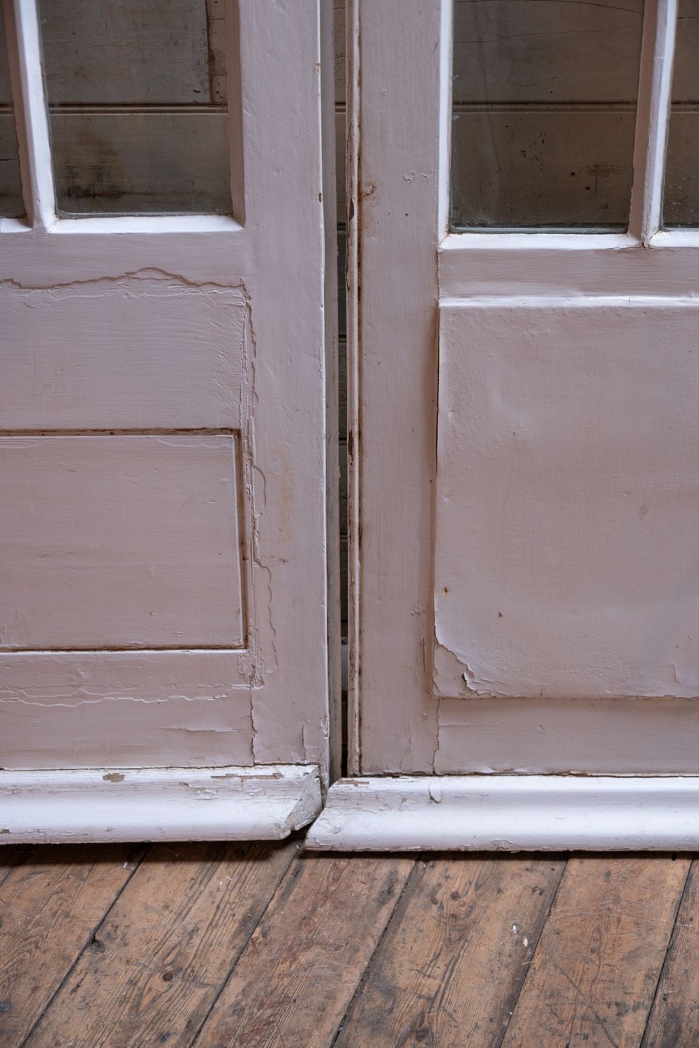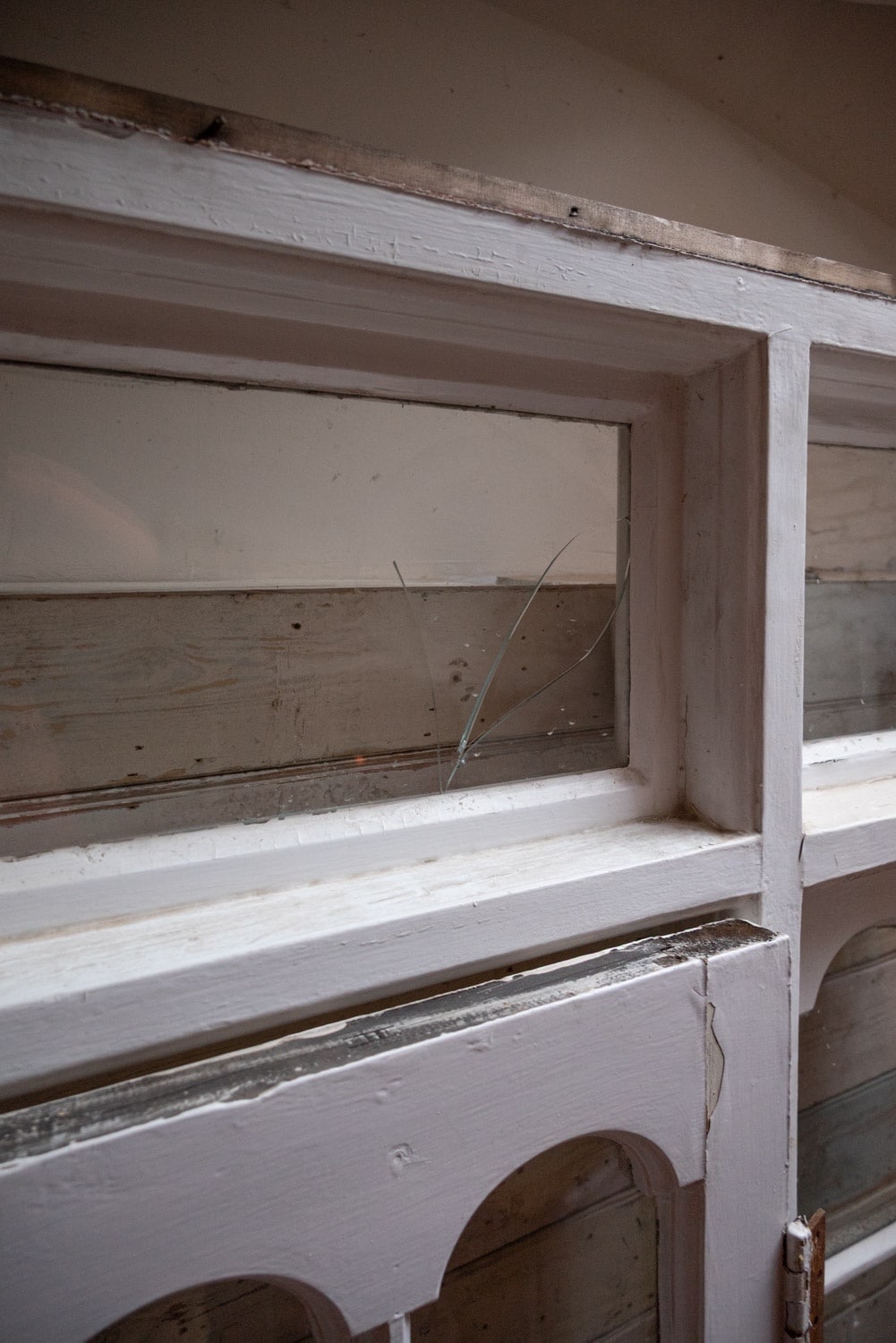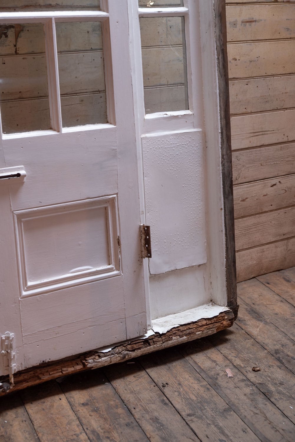 One cracked pane to the top and decay to bottom part of doorframe.
