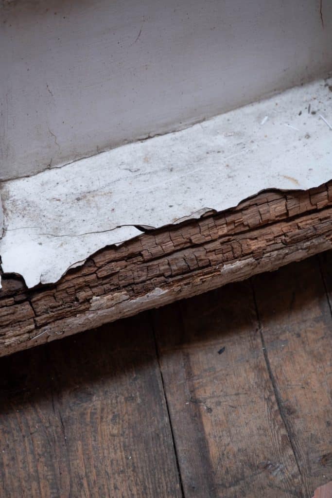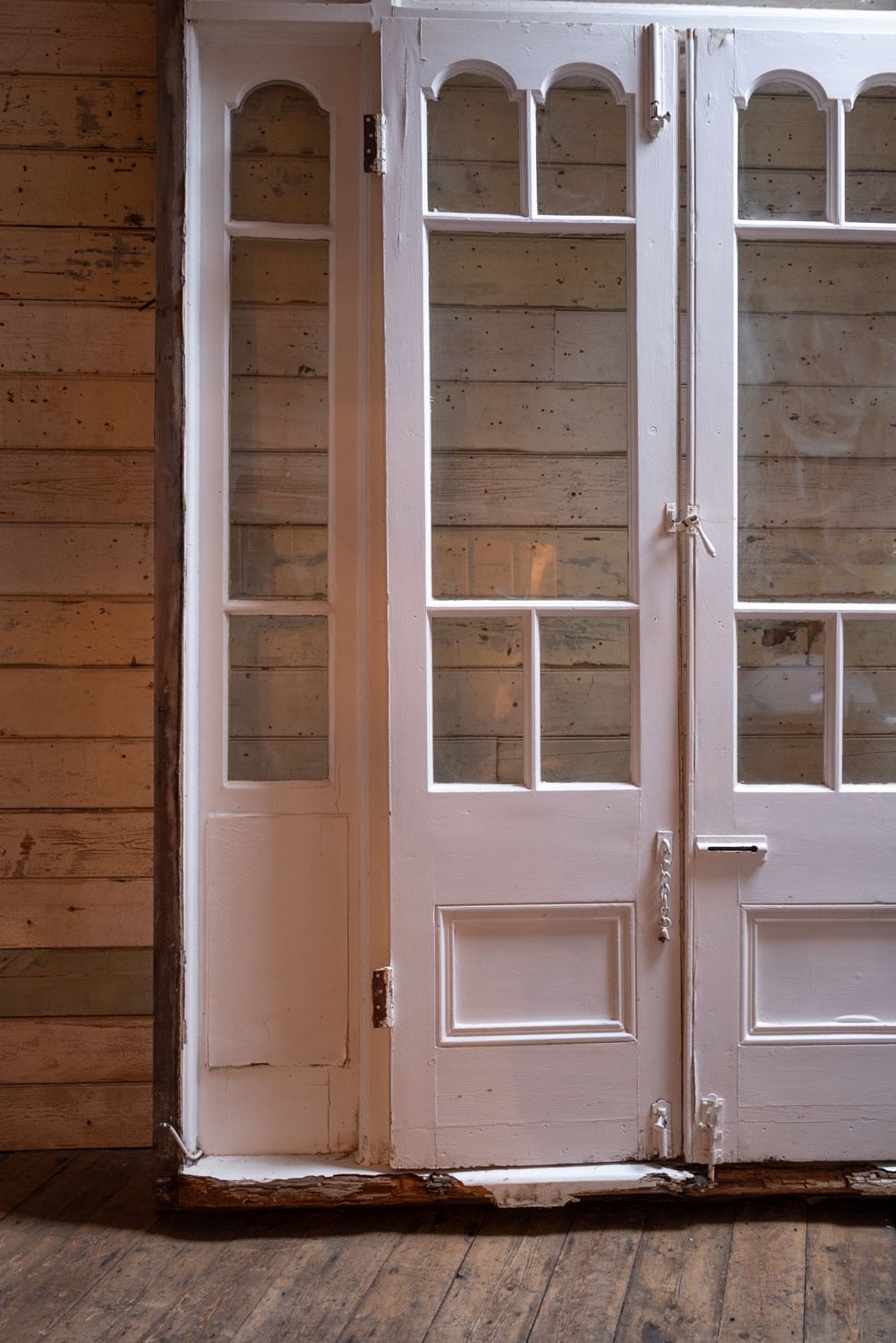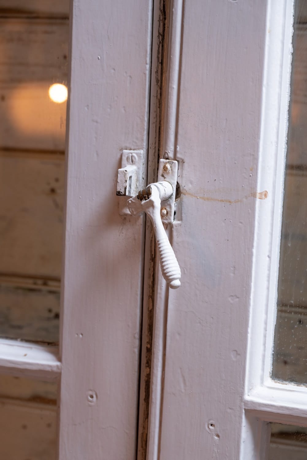 One cracked pane to the top and decay to bottom part of doorframe.