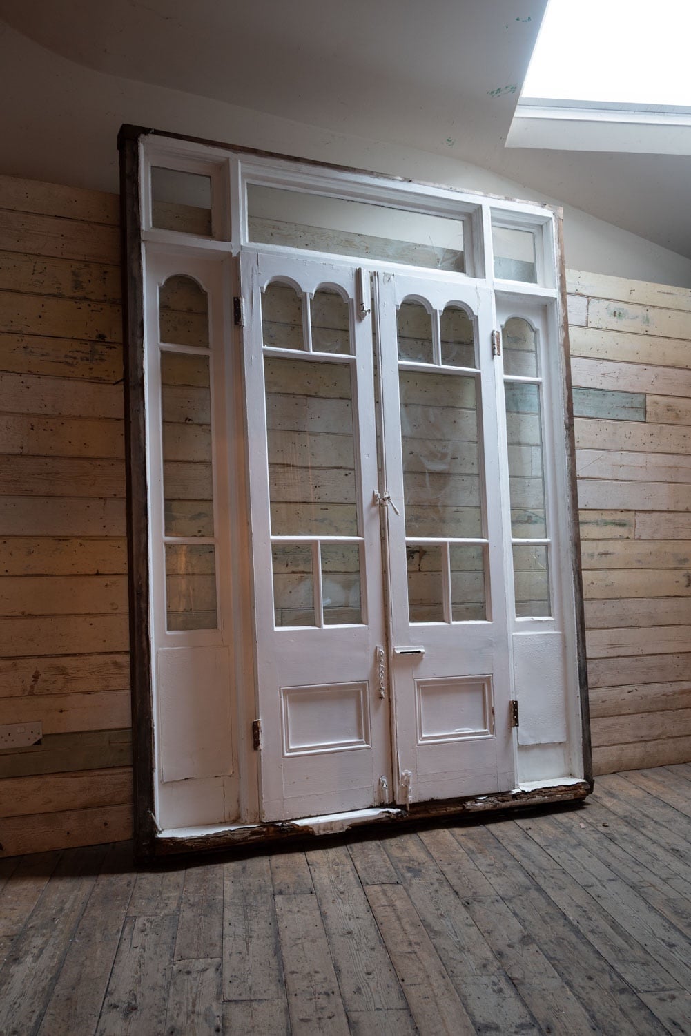 Early 20th C. patio door set with sidelights and transom windows above.