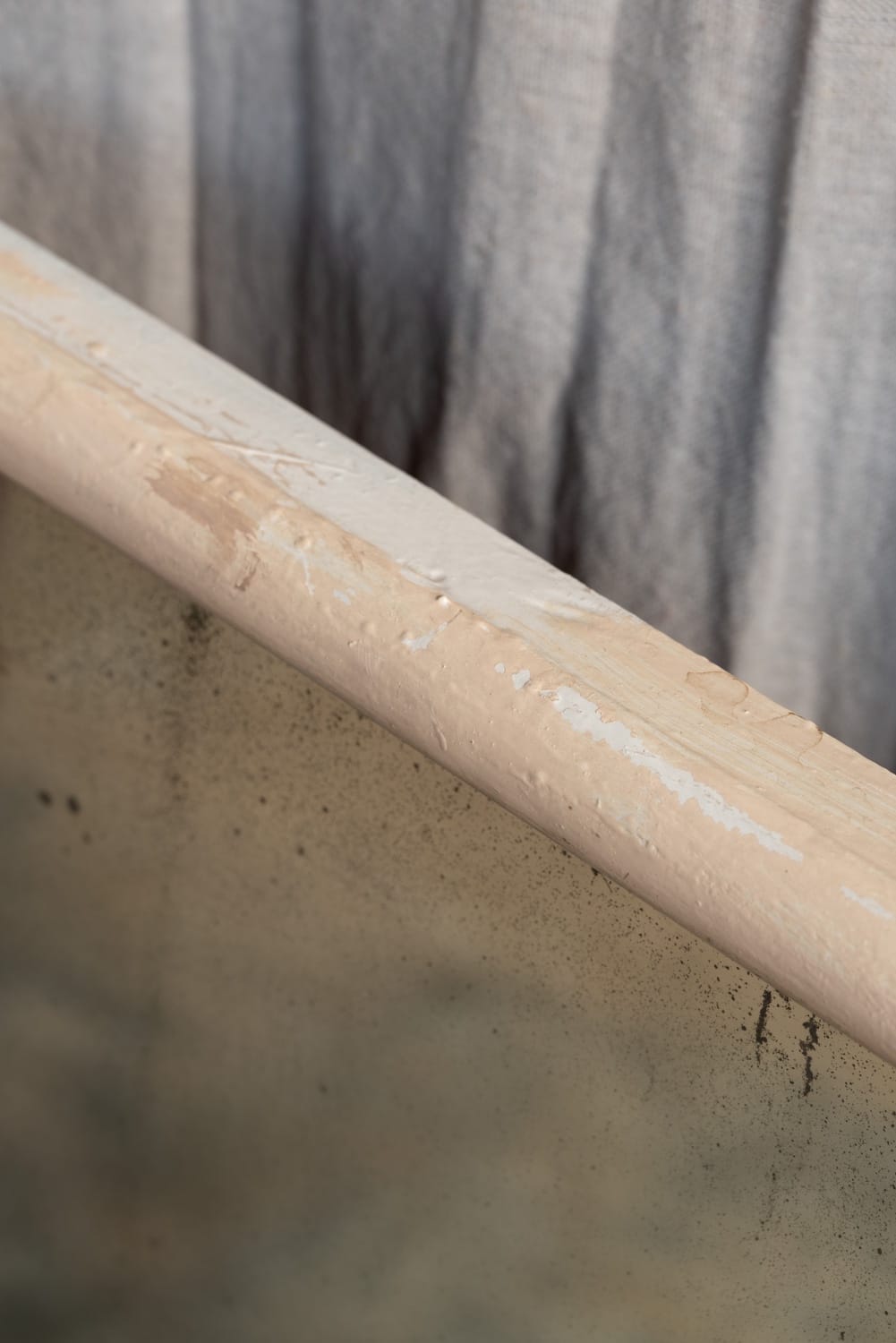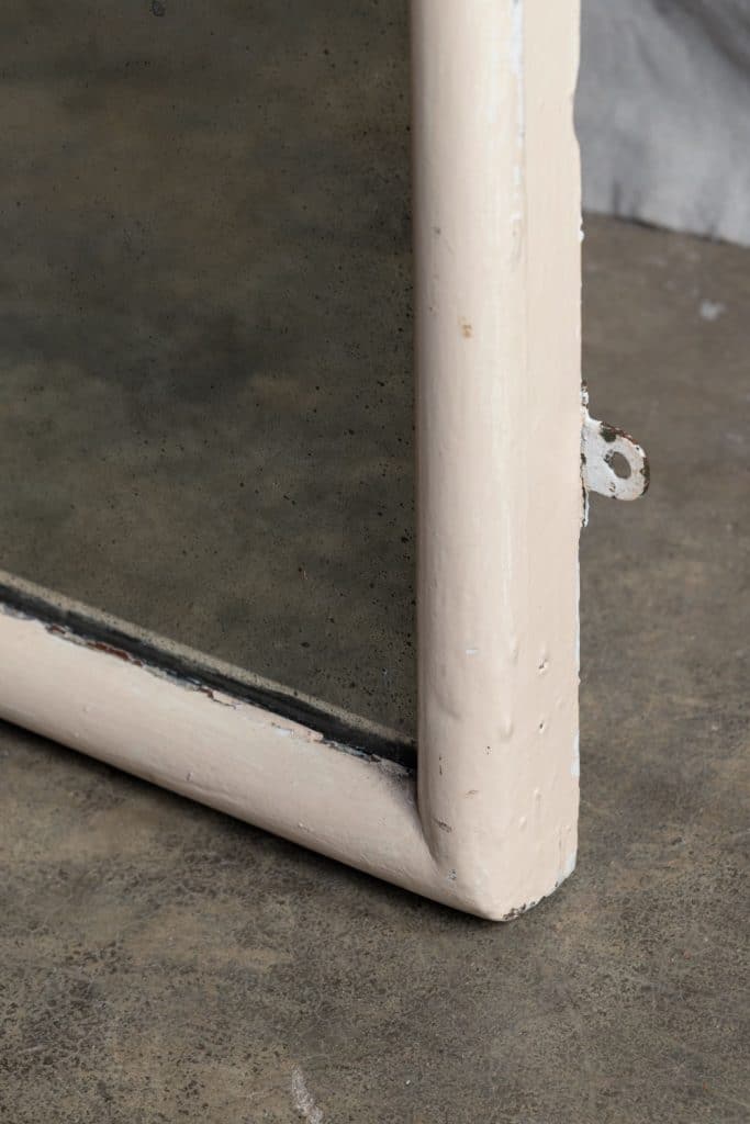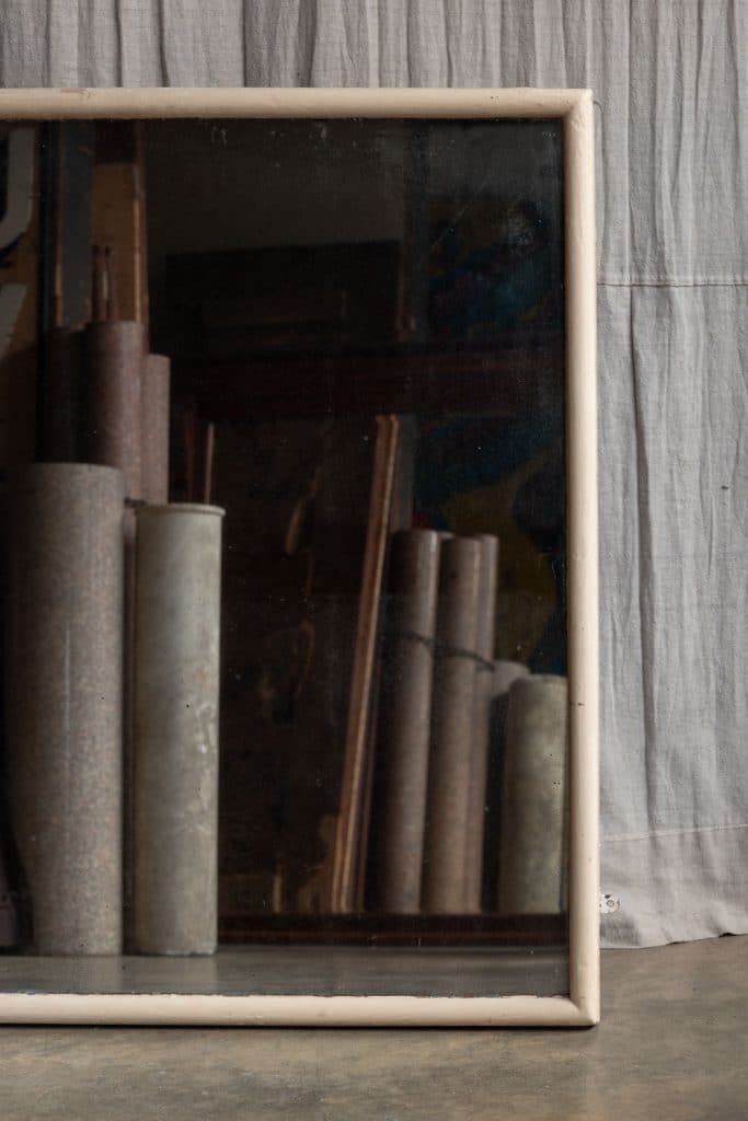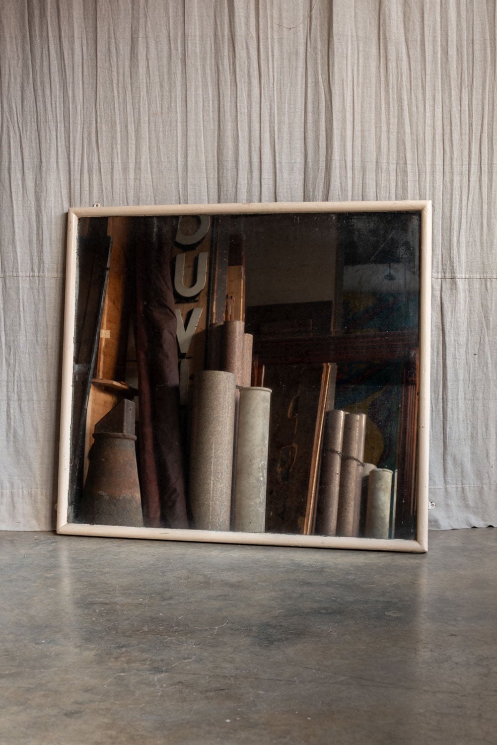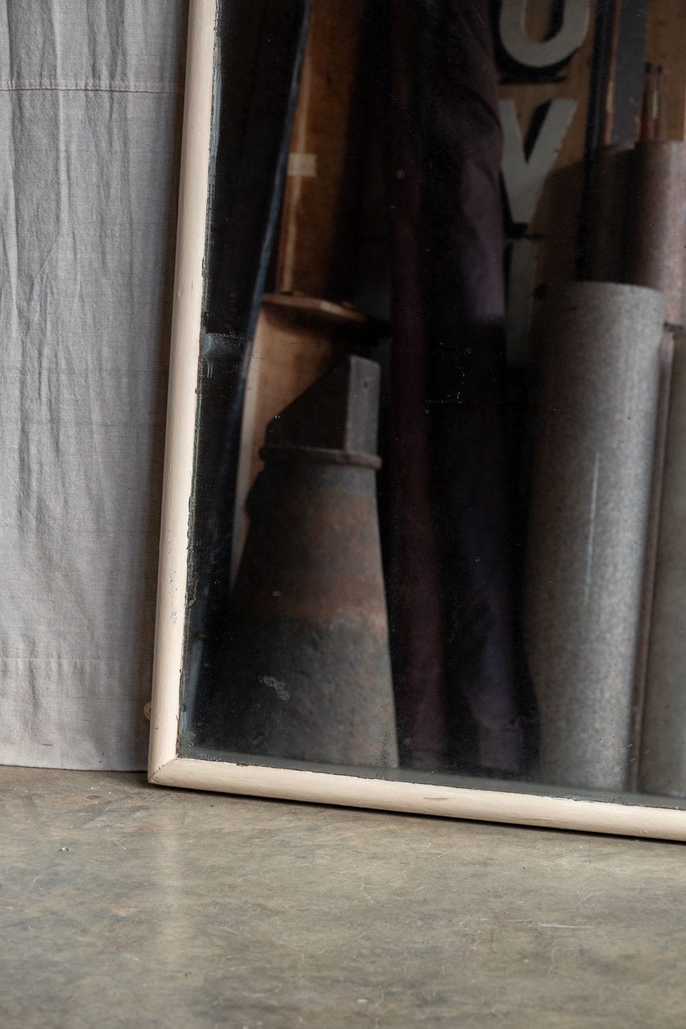 Edwardian shop mirror with overpainted painted frame and antique grey mirror plate, with characterful specks of foxing.
