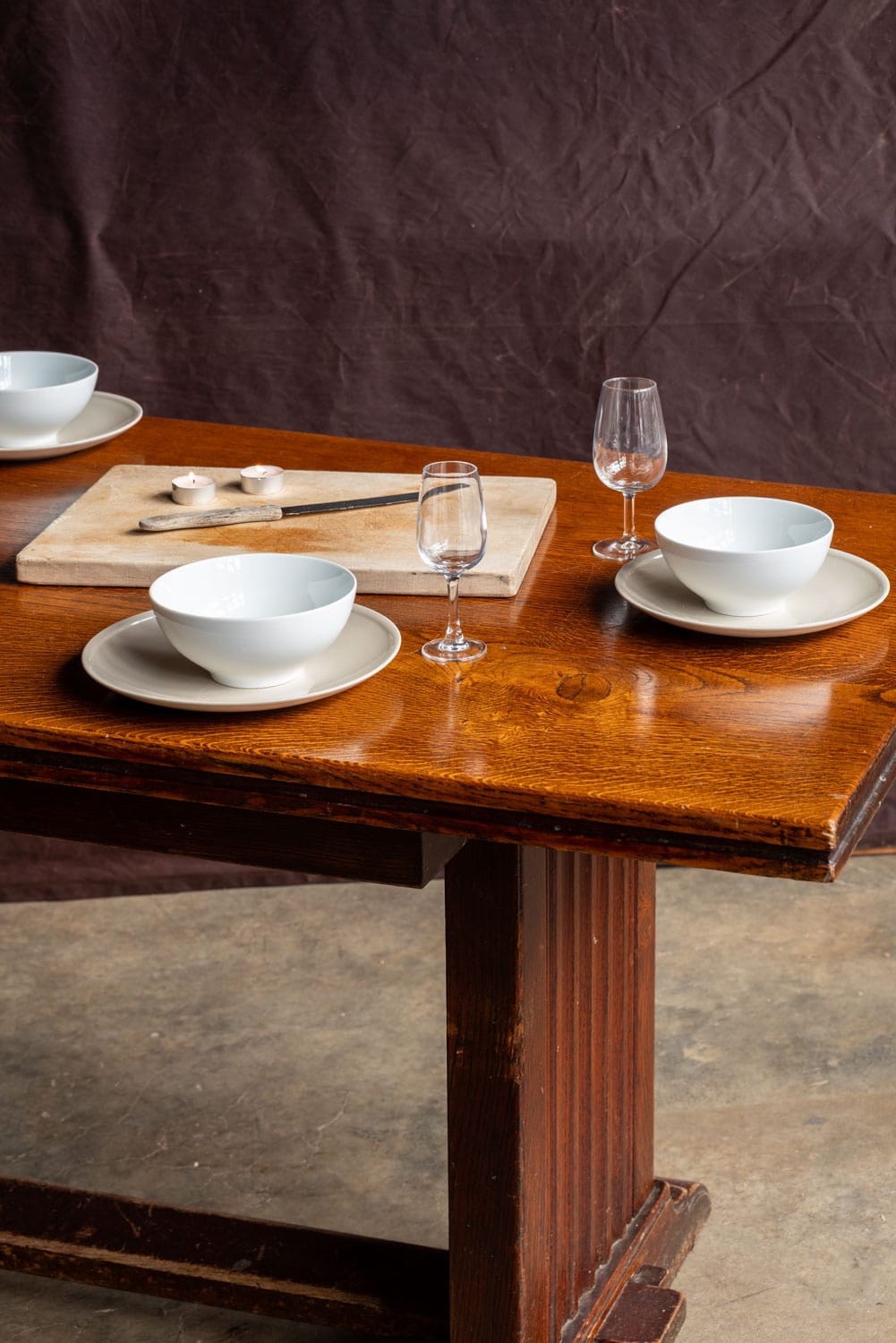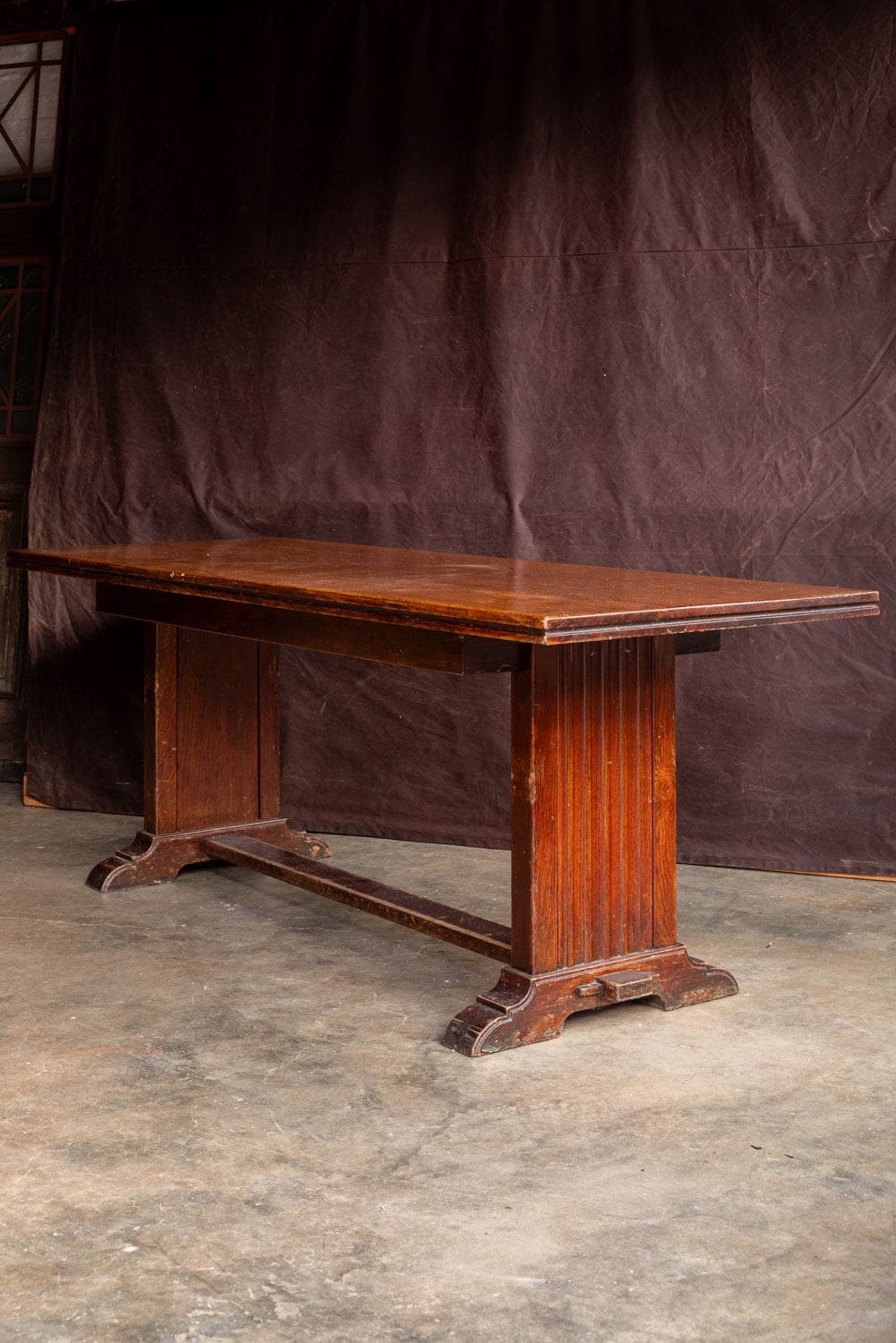 This table was removed from a building at the University of Nottingham, designed by English architect Percy Richard Morley Horder. We believe he also designed this table.