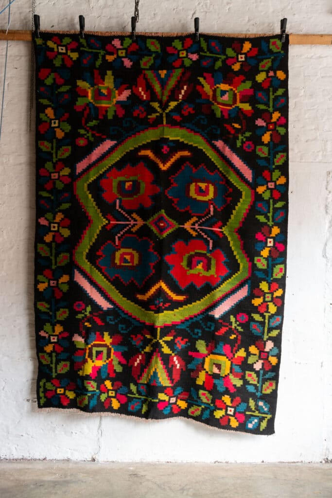 Bold colourful flower motifs on a black background.