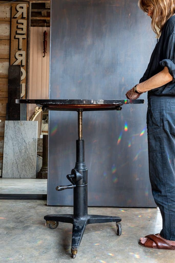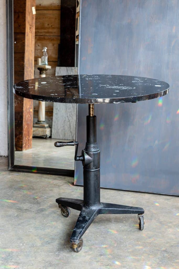 Adjustable fossilised black marble topped table maried to a solid cast iron orthontist base