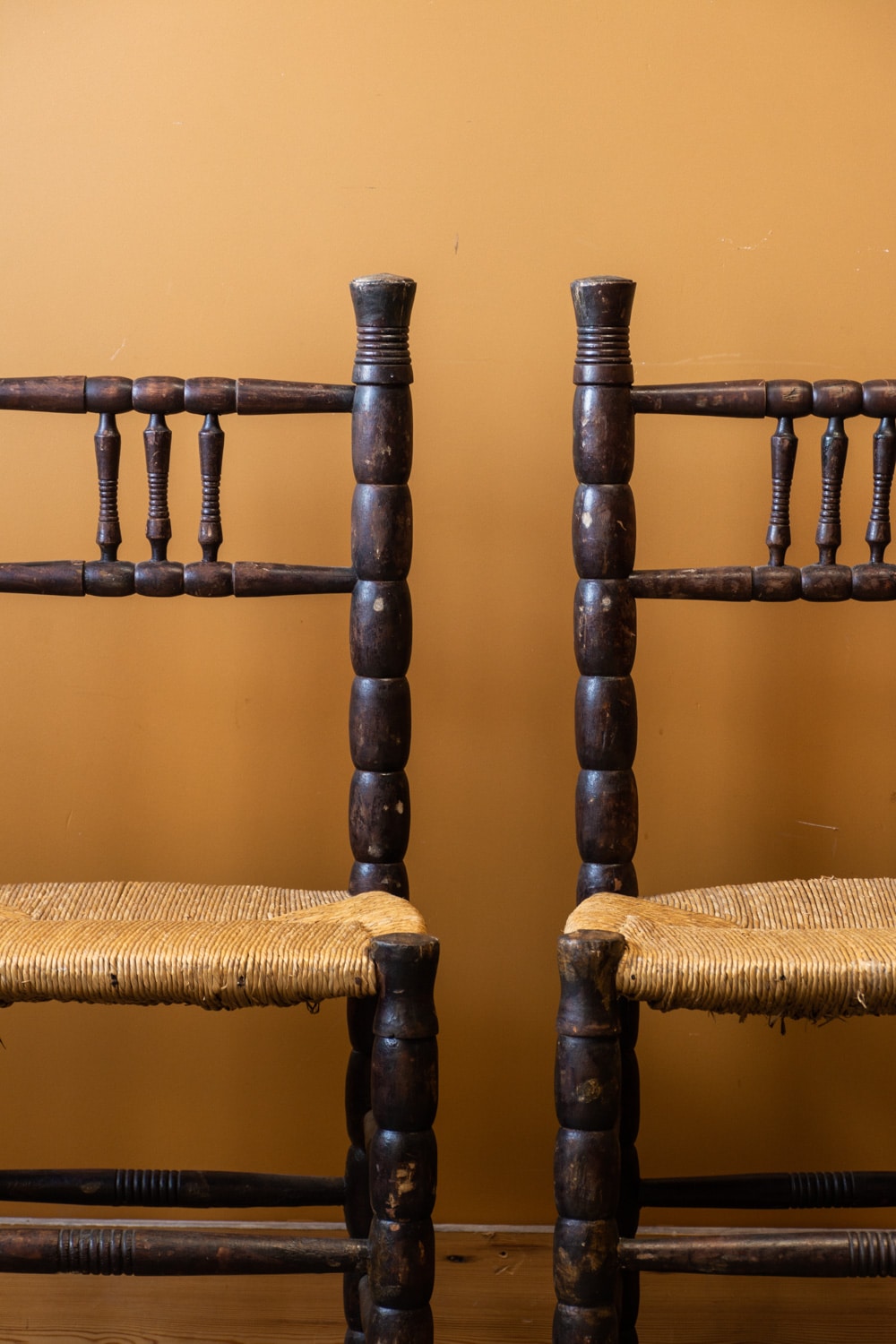 A pair of vintage French wooden chairs with bobbin detail and a handwoven rush seat.