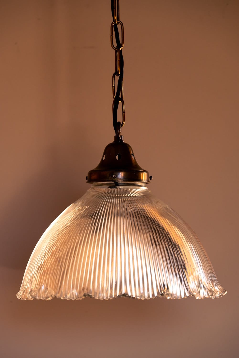 Large holophane hanging light with frilled edges.