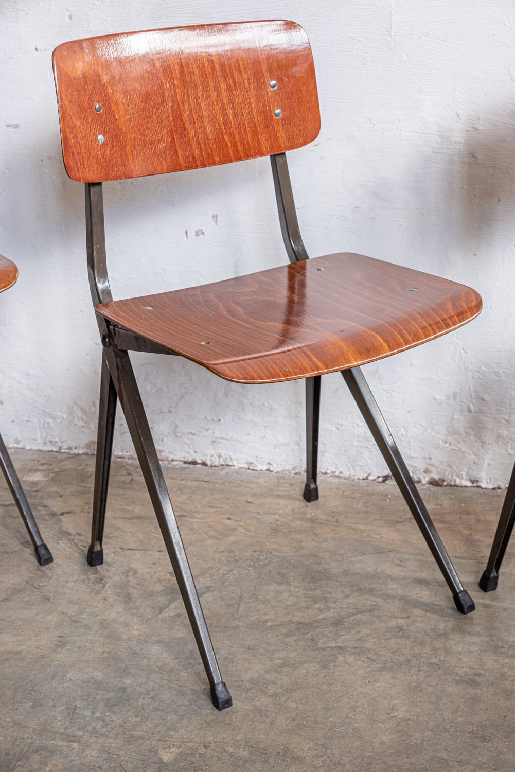 Mid-century steel-frame chairs with composite seats and backs in the style of Friso Kramer.