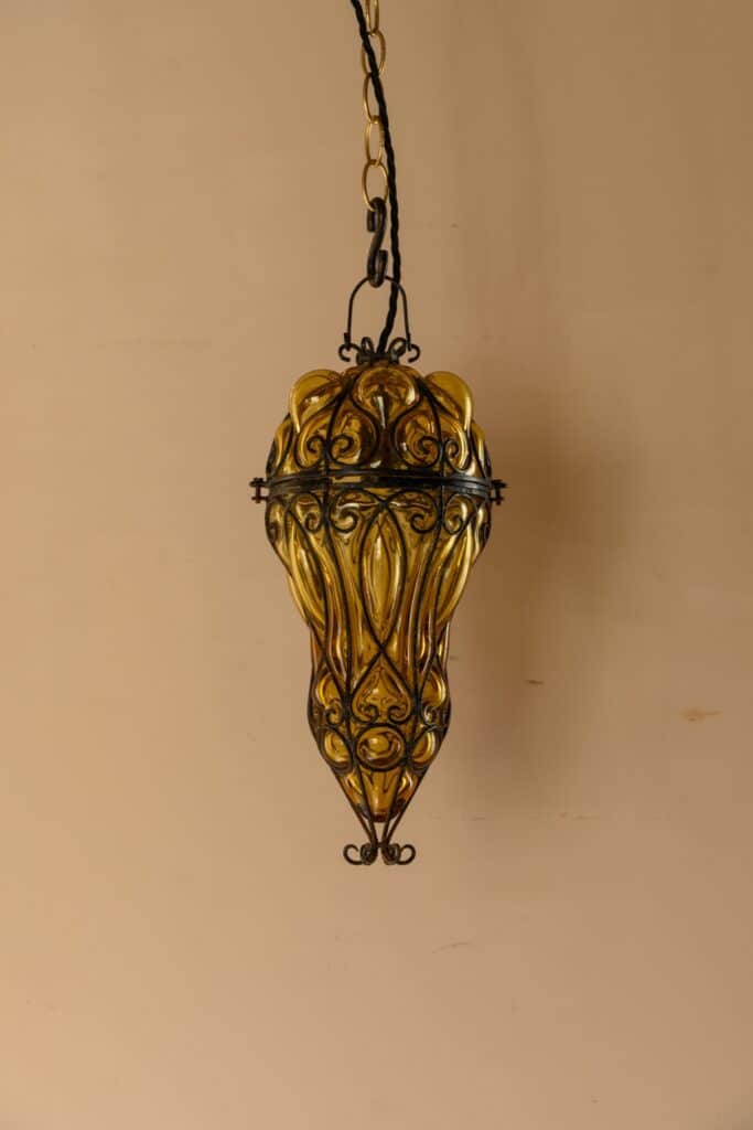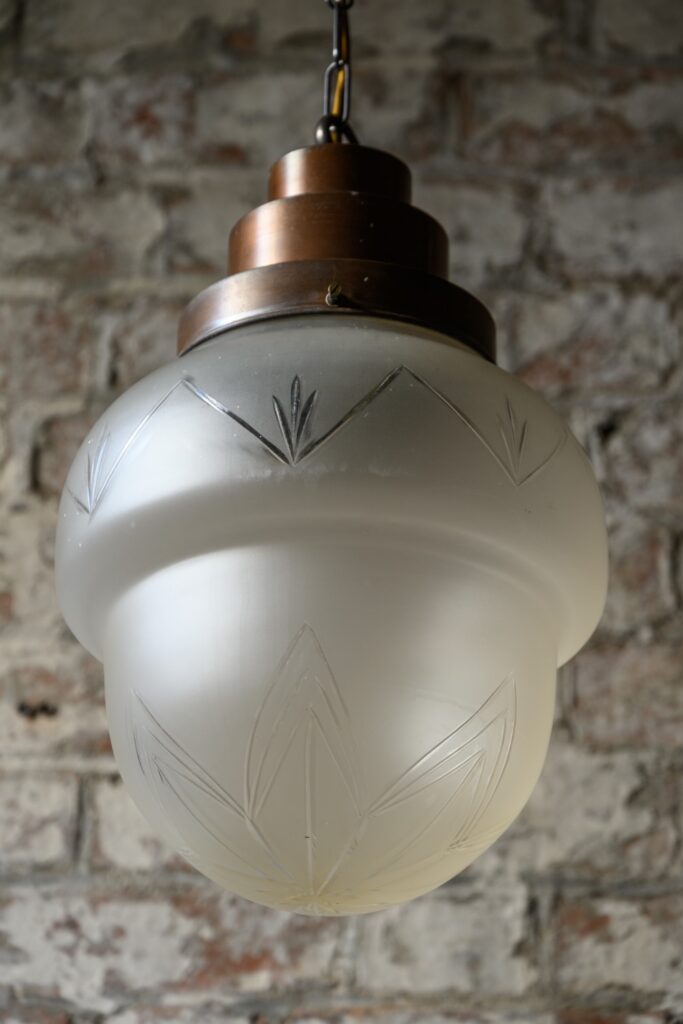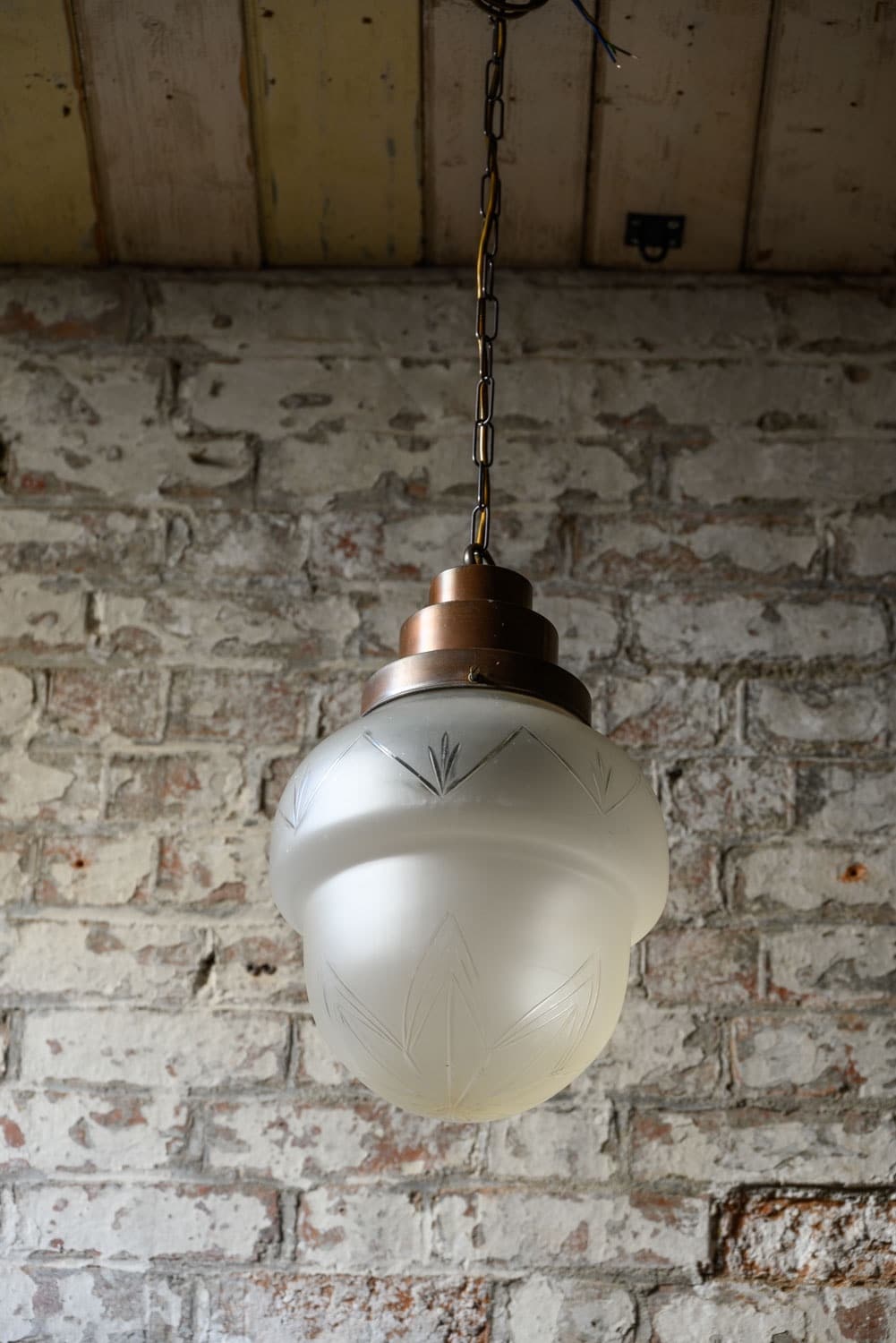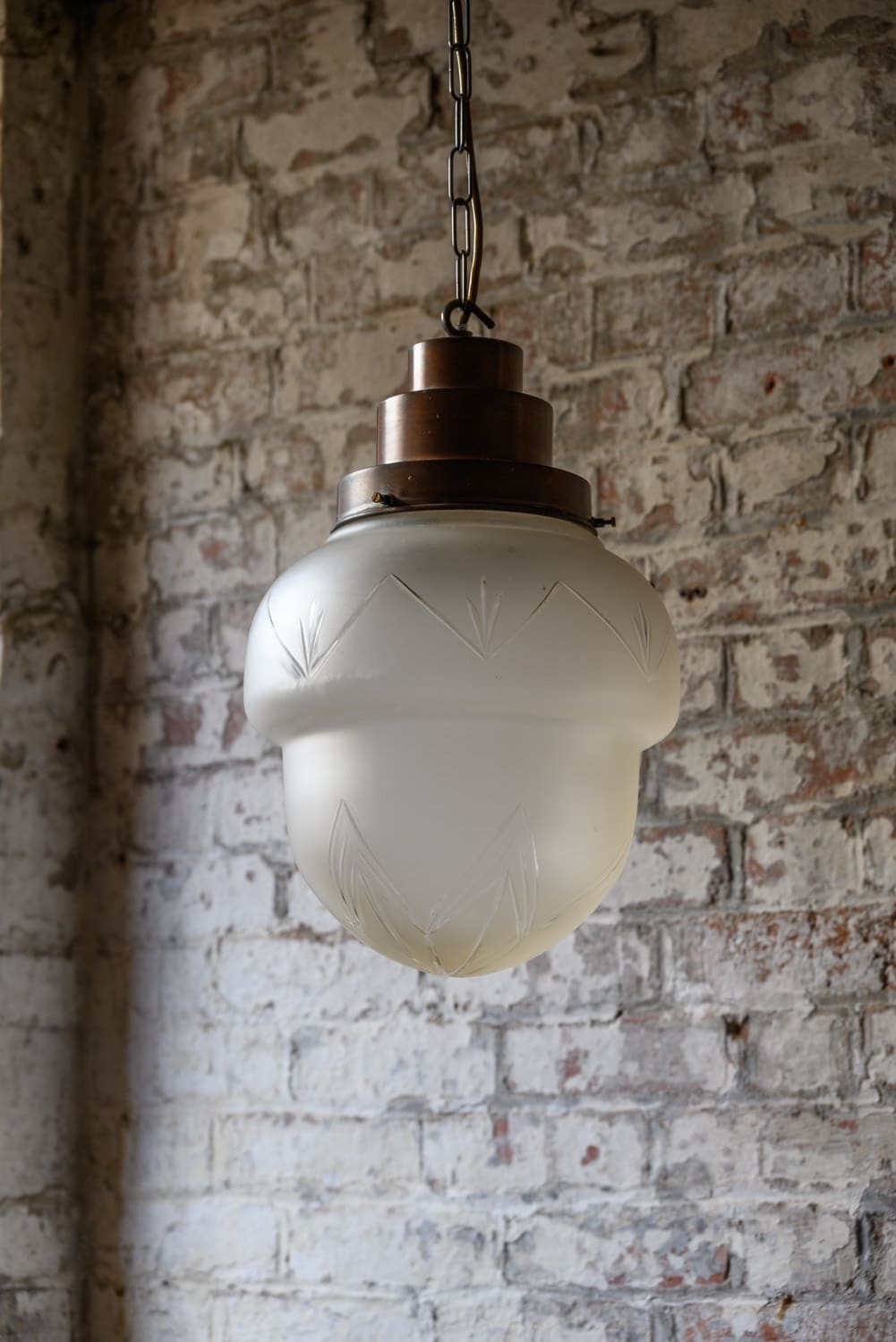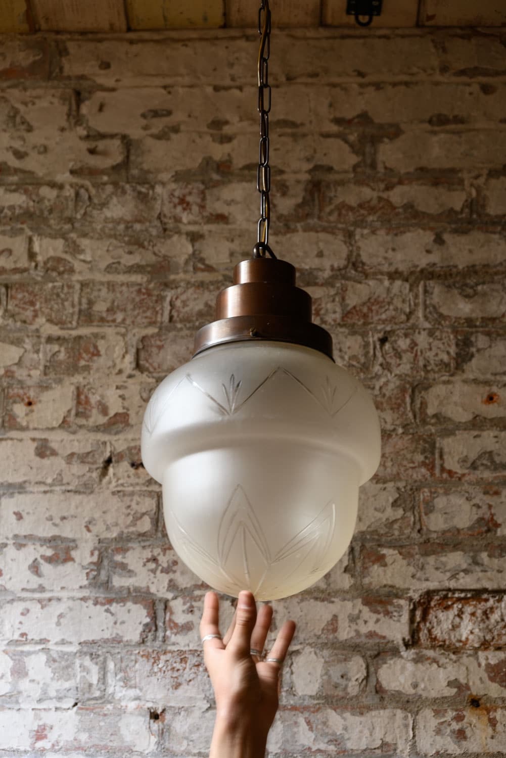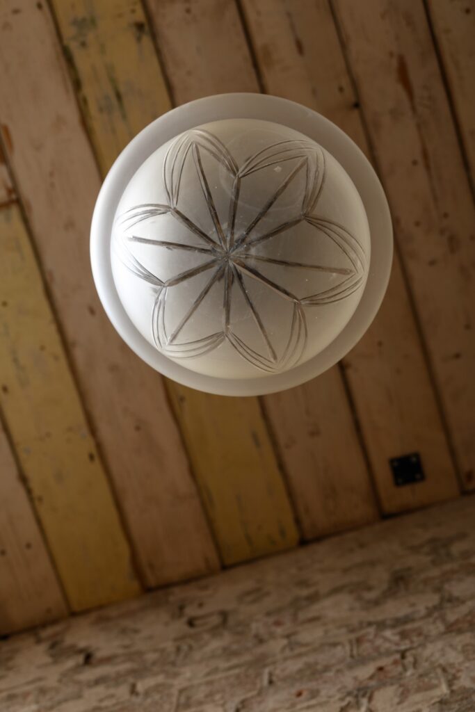 Frosted glass pendant with cut glass decoration, on a three-step gallery. Very good size.