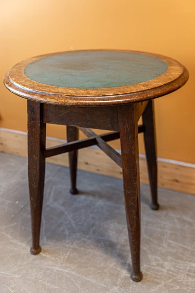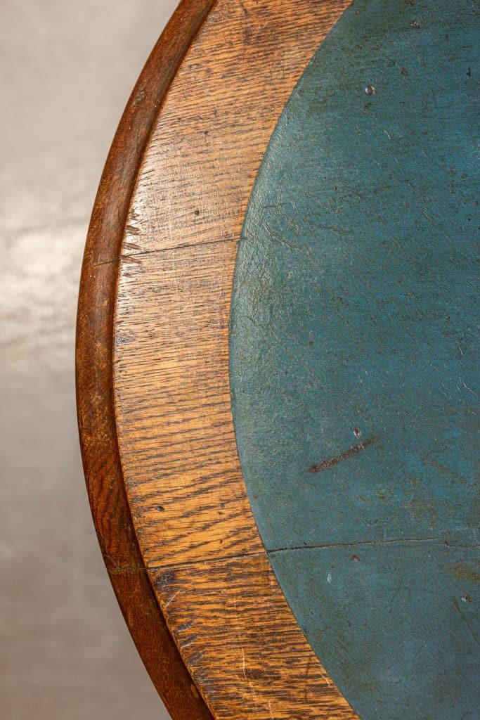 Arts and crafts oak pub table with a teal green "Dalex" inlaid table top.
